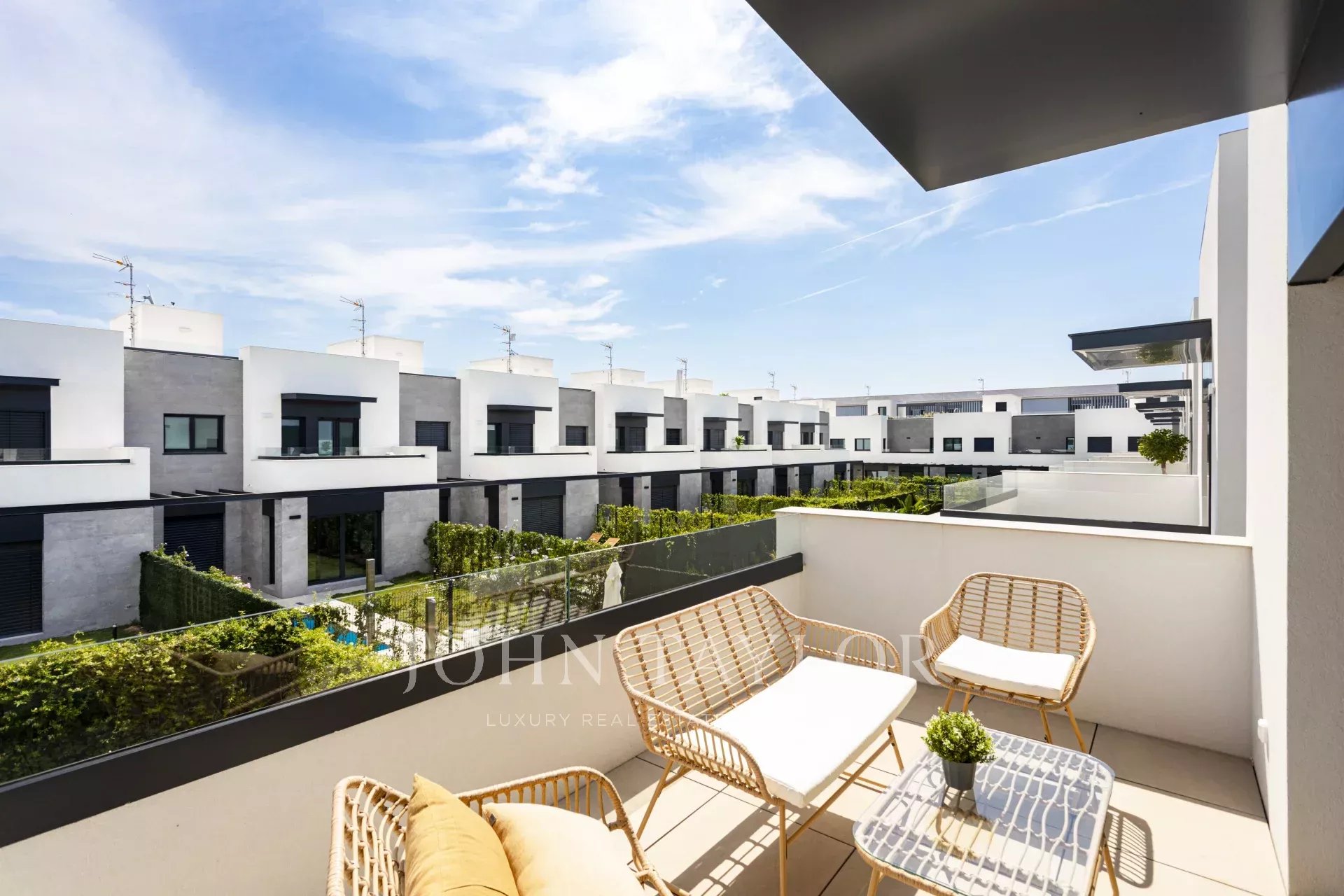 Im Obergeschoss öffnet sich das Hauptschlafzimmer zu einem gemütlichen Balkon mit Sofa und Tisch — ein privater Ort zum Abschalten oder für einen inspirierenden Start in den Tag.