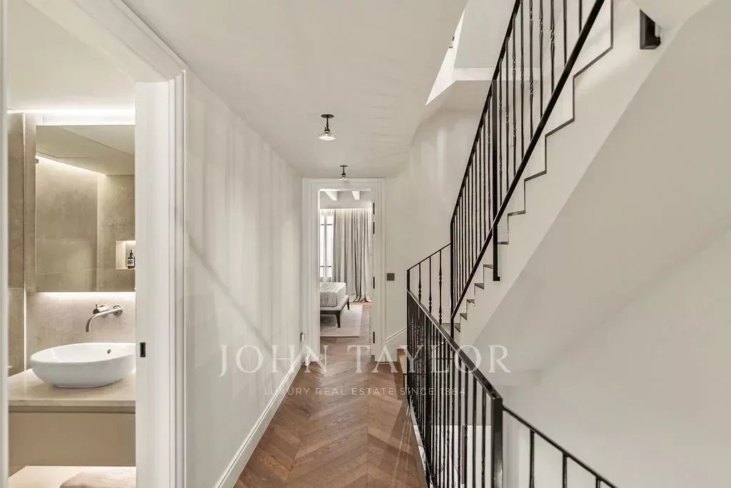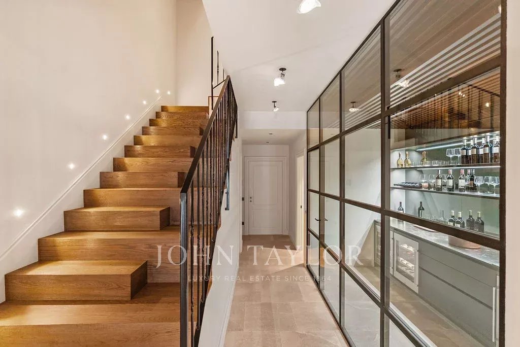 Das Erdgeschoss empfängt mit einer einladenden Lobby, einem repräsentativen Kamin, hohen Holzdecken und einer einzigartigen Treppe. Auf dieser Etage befinden sich auch eine herrliche Weinbar, eine Waschküche und ein Garagenparkplatz mit viel Platz für Autos und Fahrräder.