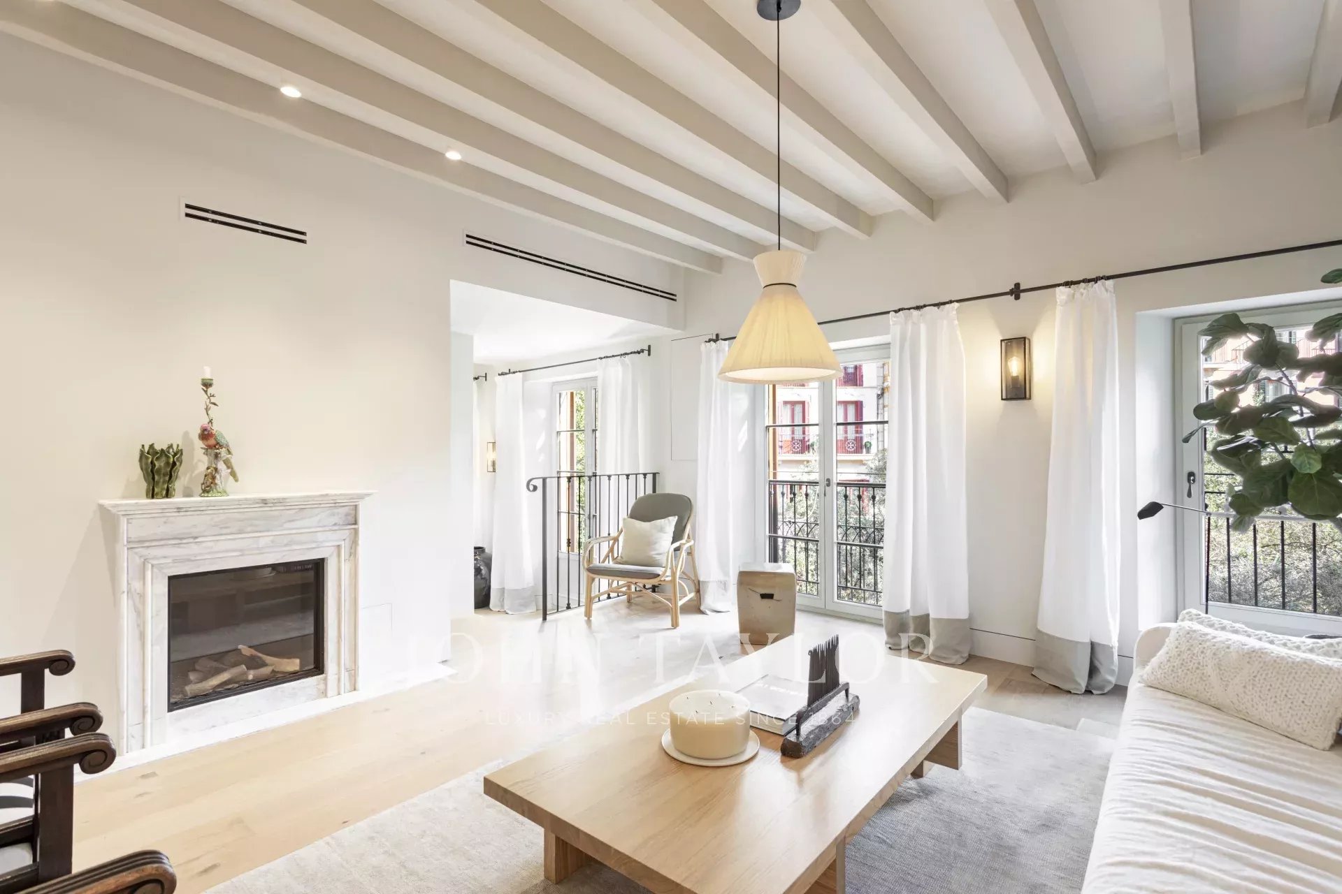 In dieser Wohnung verbindet ein offener Grundriss nahtlos sowohl den Wohnbereich als auch die offene Wohnküche. Das ruhige, nach hinten ausgerichtete Schlafzimmer verfügt über eingebaute Holzregale, Schränke und einen Kleiderschrank in einem ruhigen, blassgrünen Farbton, der von dem Olivenbaum am Placa Cort inspiriert wurde. Ein wunderschöner Gaskamin mit einem handgefertigten Mantel aus italienischem Calacatta-Gold-Marmor verleiht dem Wohnbereich sowohl Komfort als auch Klasse. Könnte es ein schöneres Refugium geben?