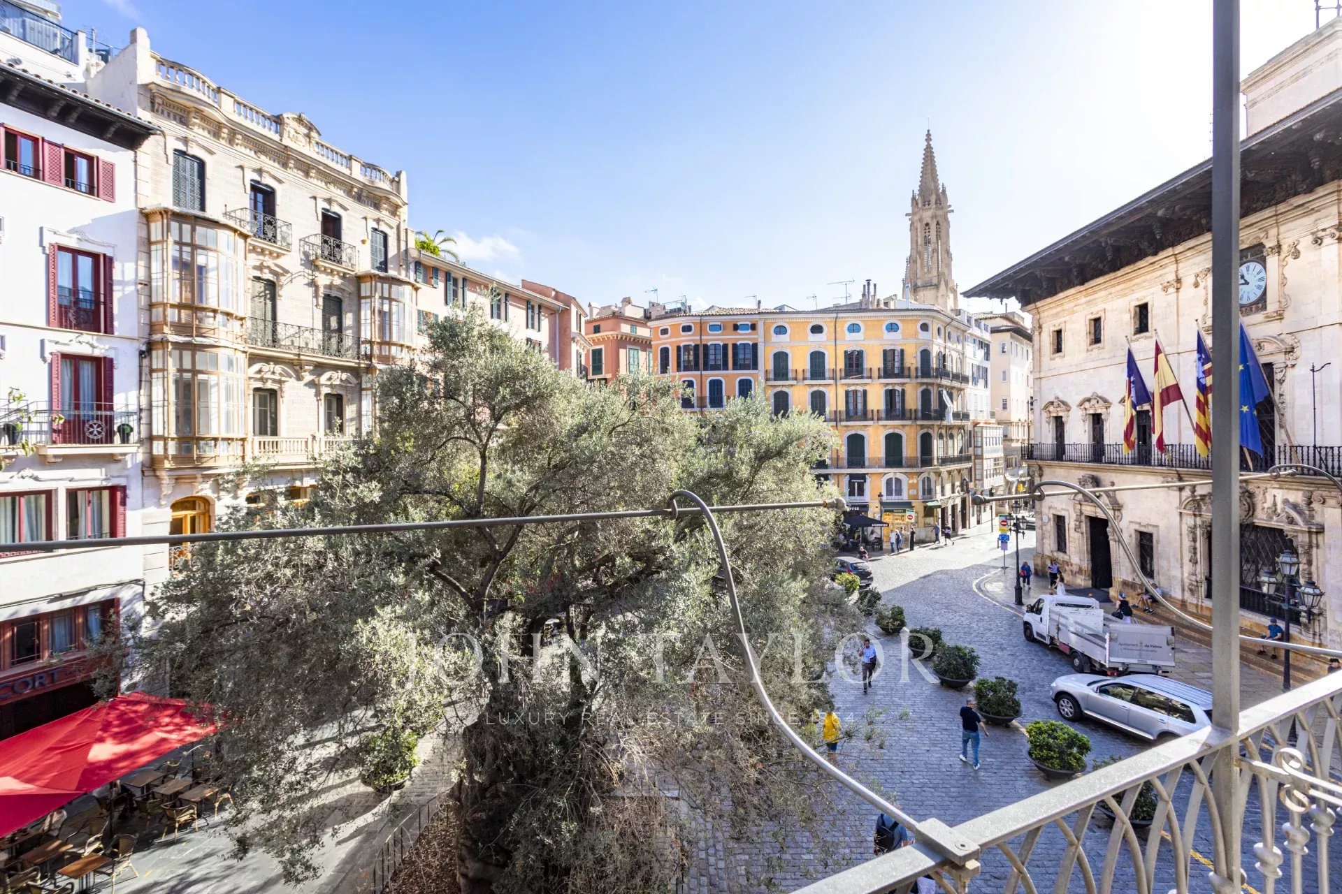 Folgt man der Eichentreppe mit handgeschmiedetem Eisengeländer vom obersten Stockwerk aus, gelangt man auf die großzügige Dachterrasse. Hier erwartet Sie ein fast 360-Grad-Blick auf Palma. Die Kathedrale La Sue zieht sofort die Aufmerksamkeit auf sich. Dann wird der Blick weiter auf die Berge, die Skyline der Stadt und das Meer gelenkt.