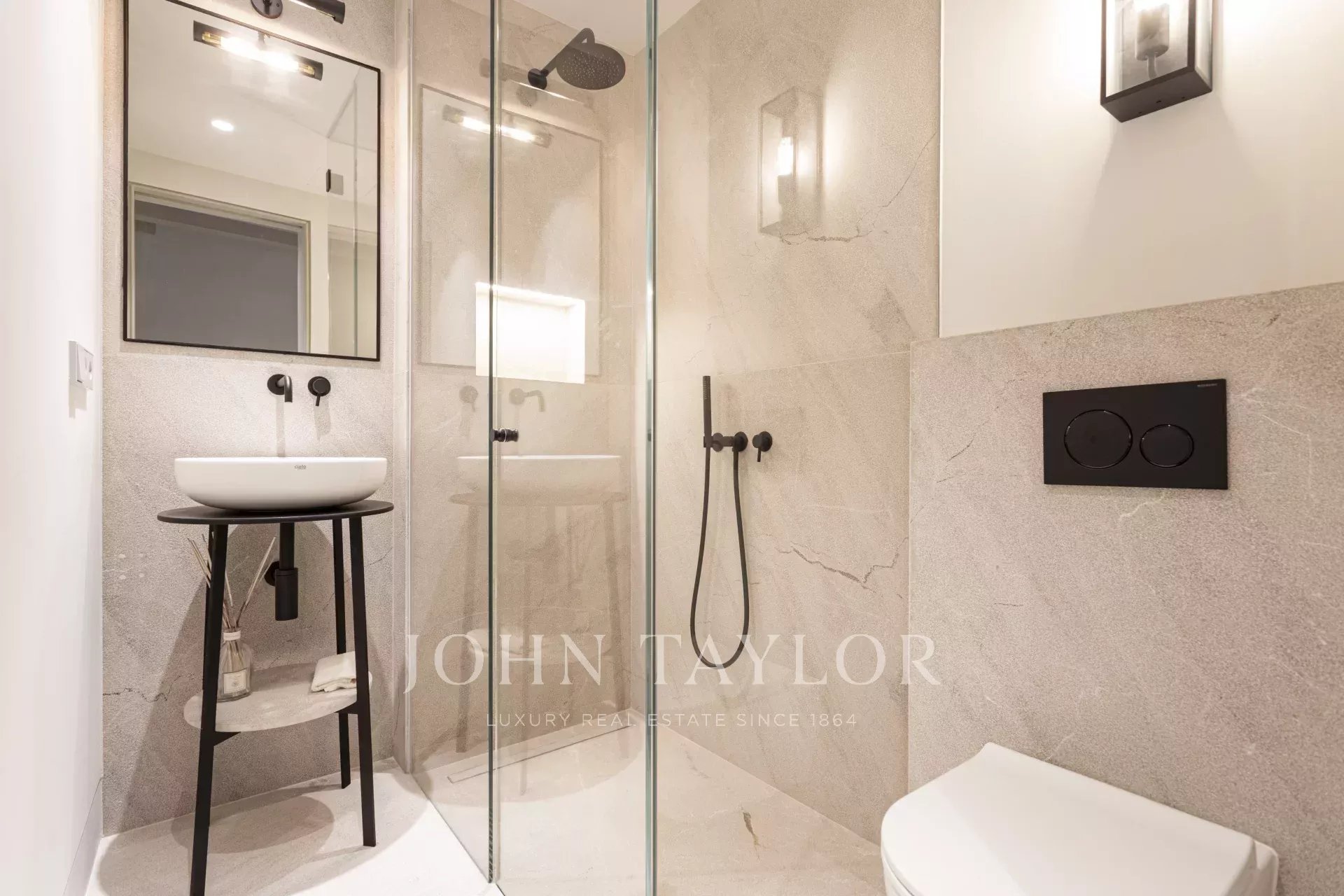 Auf dieser Etage befinden sich zwei Schlafzimmer und zwei eigene Bäder sowie ein Wohnzimmer. Beheizte Massivholzböden, Einbauschränke, getäfelte Glastüren und Beschläge mit schwarzen Eisendetails sorgen für ein zusätzliches Gefühl von Komfort und Luxus. Die beiden Bäder sind durch das private Wohnzimmer miteinander verbunden.