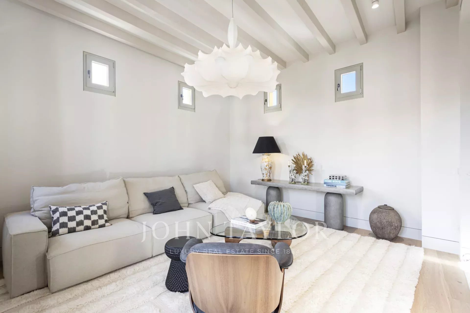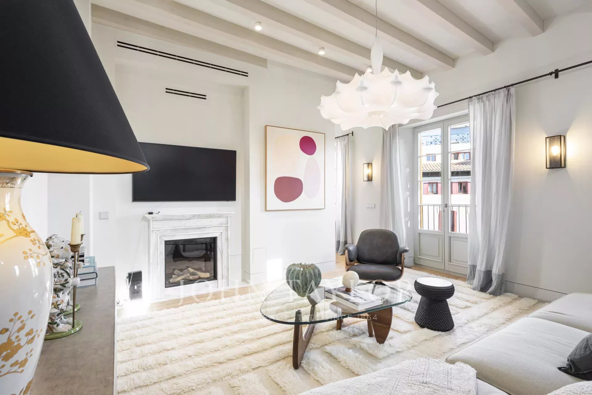 Die geräumige vierte Etage besteht aus mehreren Gemeinschaftsräumen, einem Essbereich und einer Küche. Der Aufzug führt direkt in die beiden Etagen drei und vier. Massive, geölte Eichenböden mit Heizung ziehen sich durch den gesamten Grundriss. Von hier aus führt eine Treppe hinauf zu Ihrer Dachterrasse mit herrlichem Ausblick. Robuste Balken im aktuellen Vintage-Look zieren die Decken. Im Sozialbereich finden Sie einen Gaskamin aus Calacatta-Gold-Marmor und Flügeltüren, die zum Placa Cort führen. Das Haus ist komplett mit handverlesenen Stücken der besten Designer und Hersteller eingerichtet, darunter eine wunderschöne Lampe von Floos, ein Couchtisch von Vitra, ein Sideboard und ein Teppich von Dusty Deco. Und nicht zu vergessen, der klassische Eames Lounge Chair.