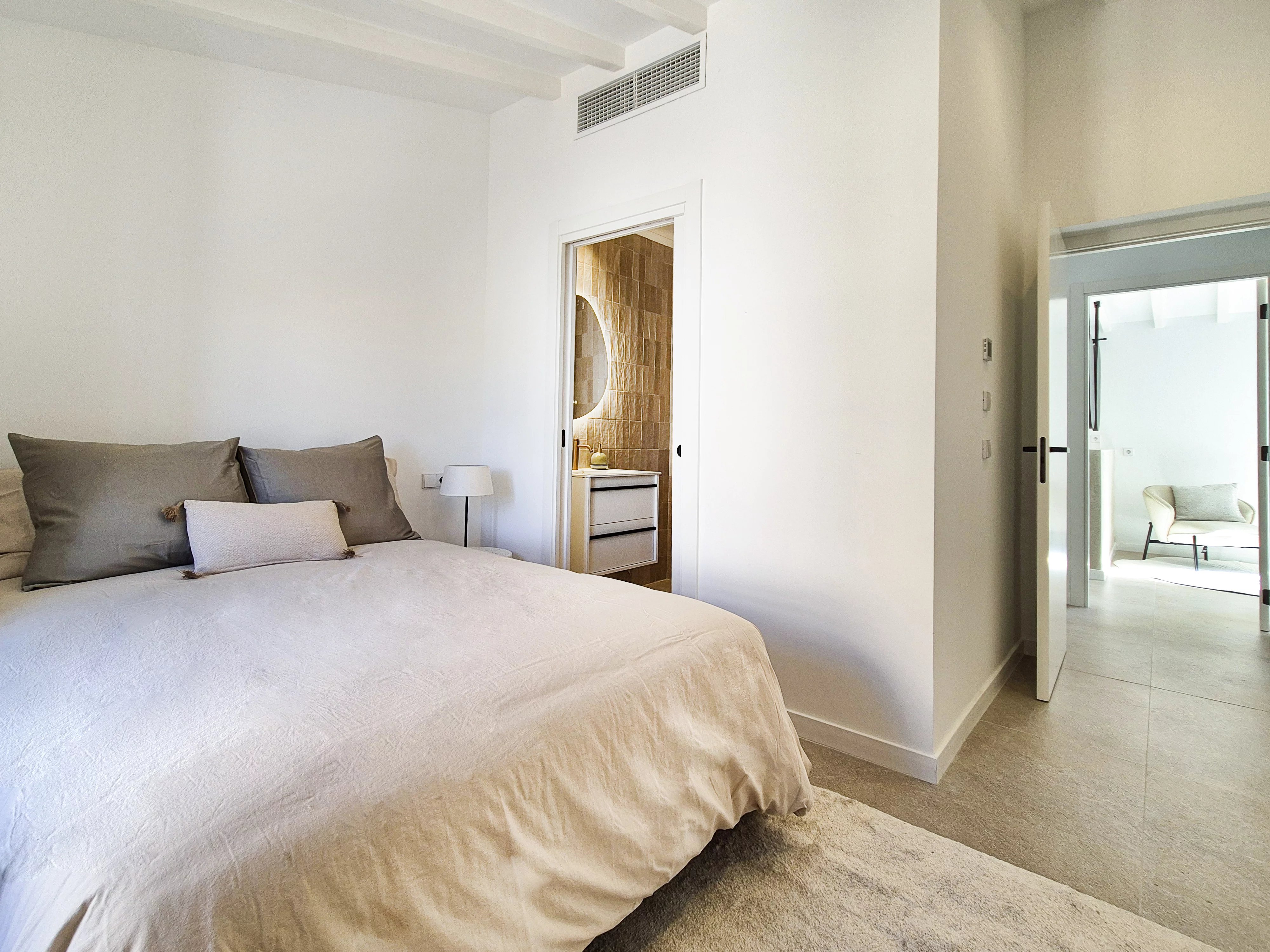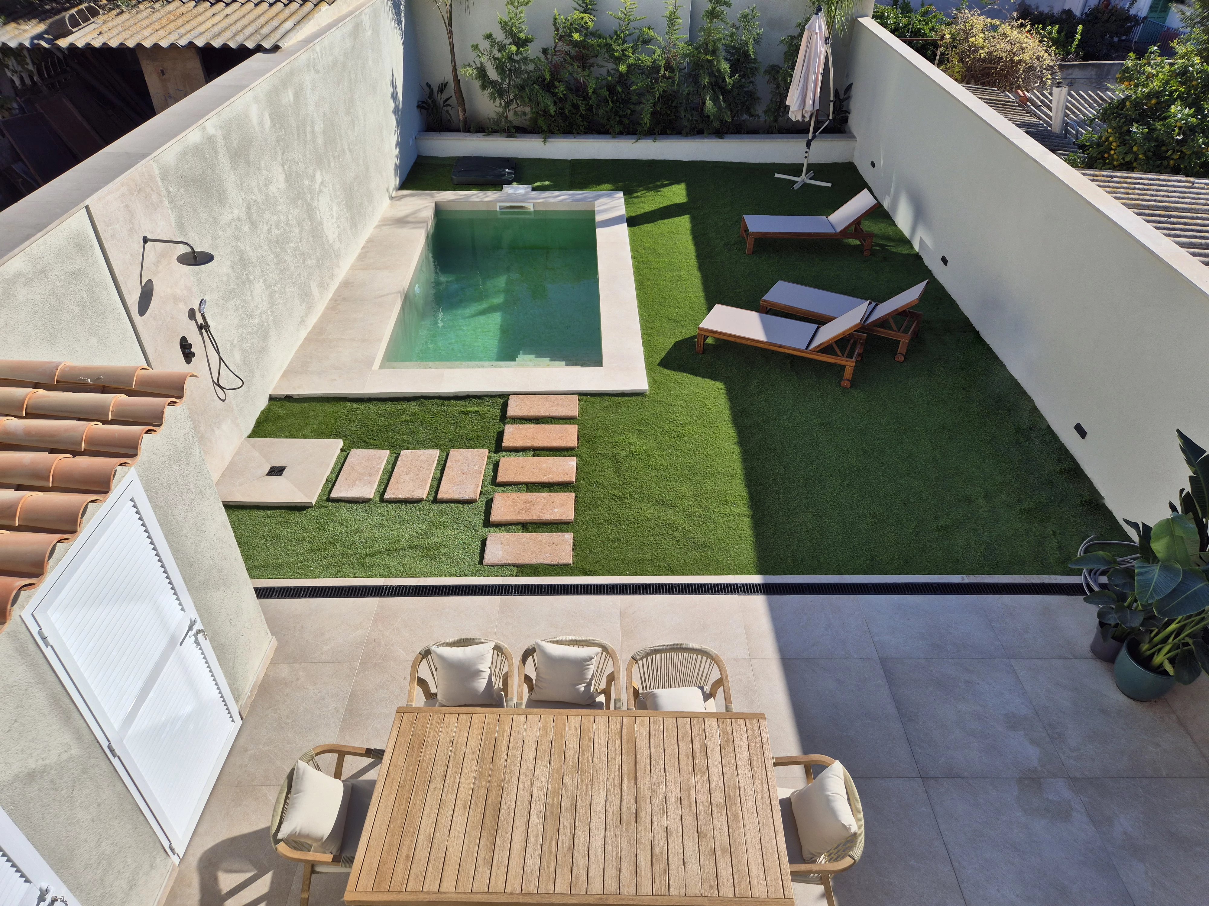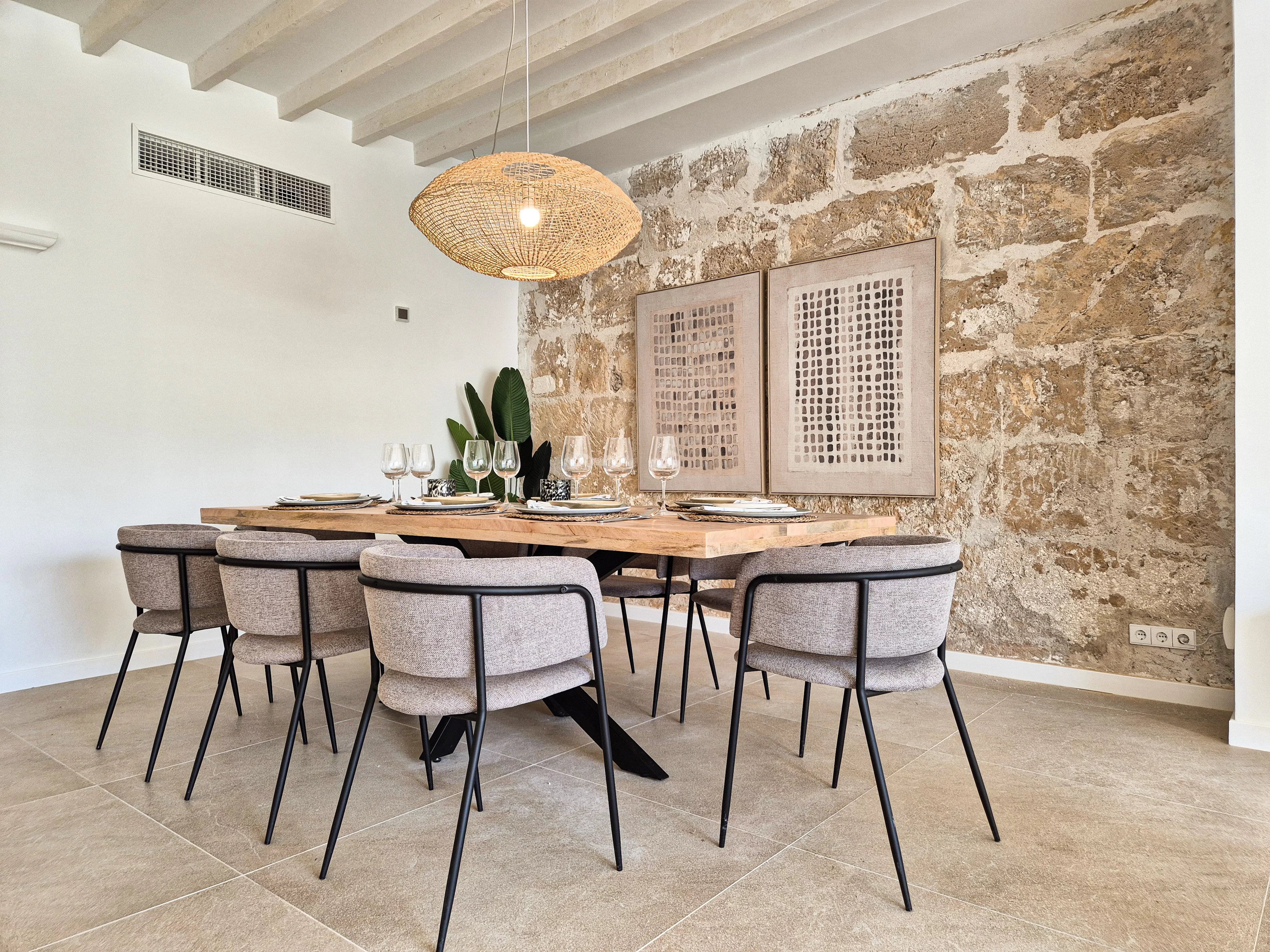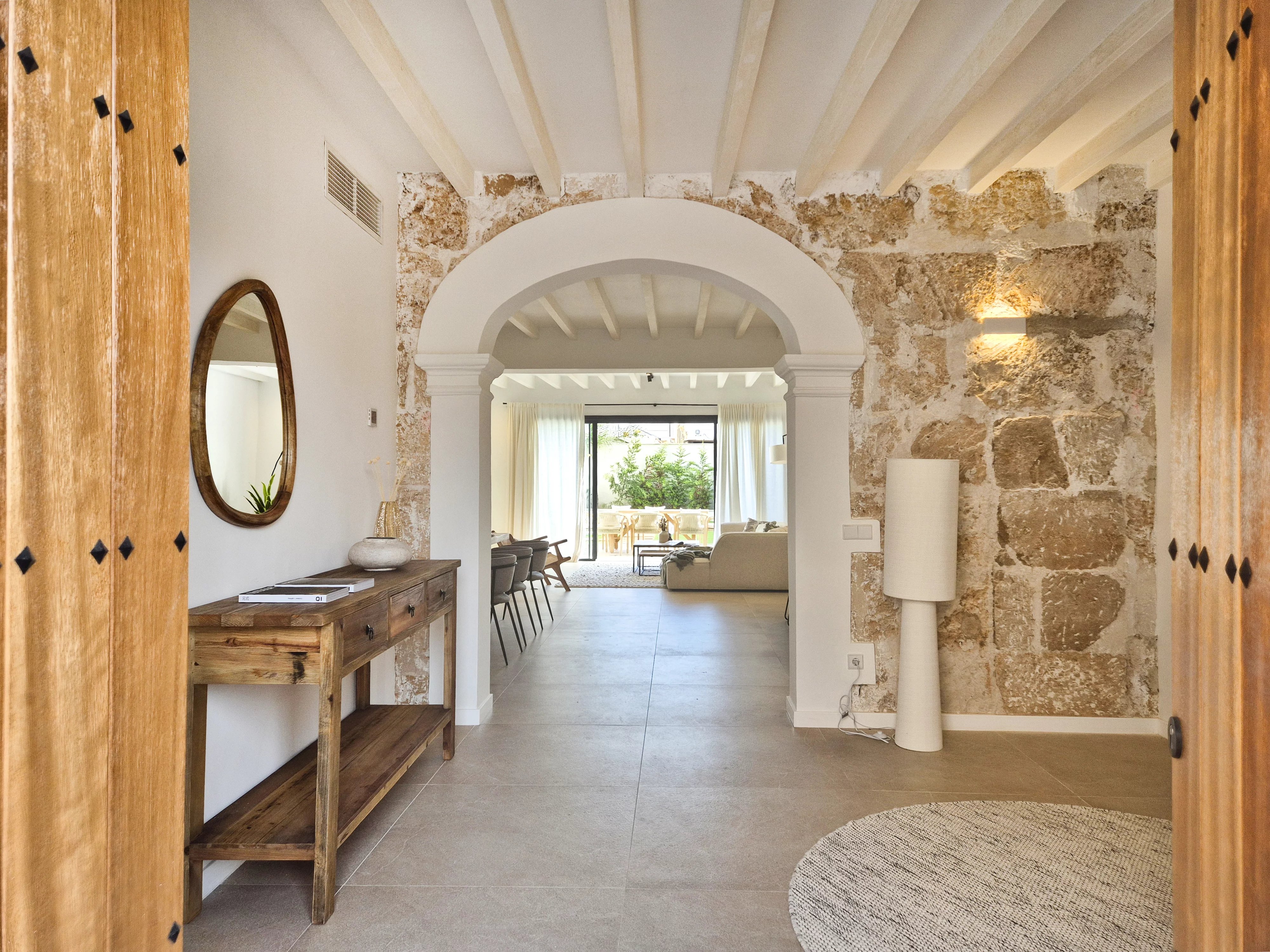 Doppelhohe Decken, Steinakzente und ein offener, sonnendurchfluteter Wohn- und Essbereich führen zu einer privaten Terrasse und einem angelegten Garten, der sich perfekt für Unterhaltungen oder zum Entspannen unter Mallorcas Sonne eignet. Drei geräumige Schlafzimmer mit eigenem Bad im Obergeschoss bieten ein Maximum an Privatsphäre und schaffen einen ruhigen Rückzugsort.