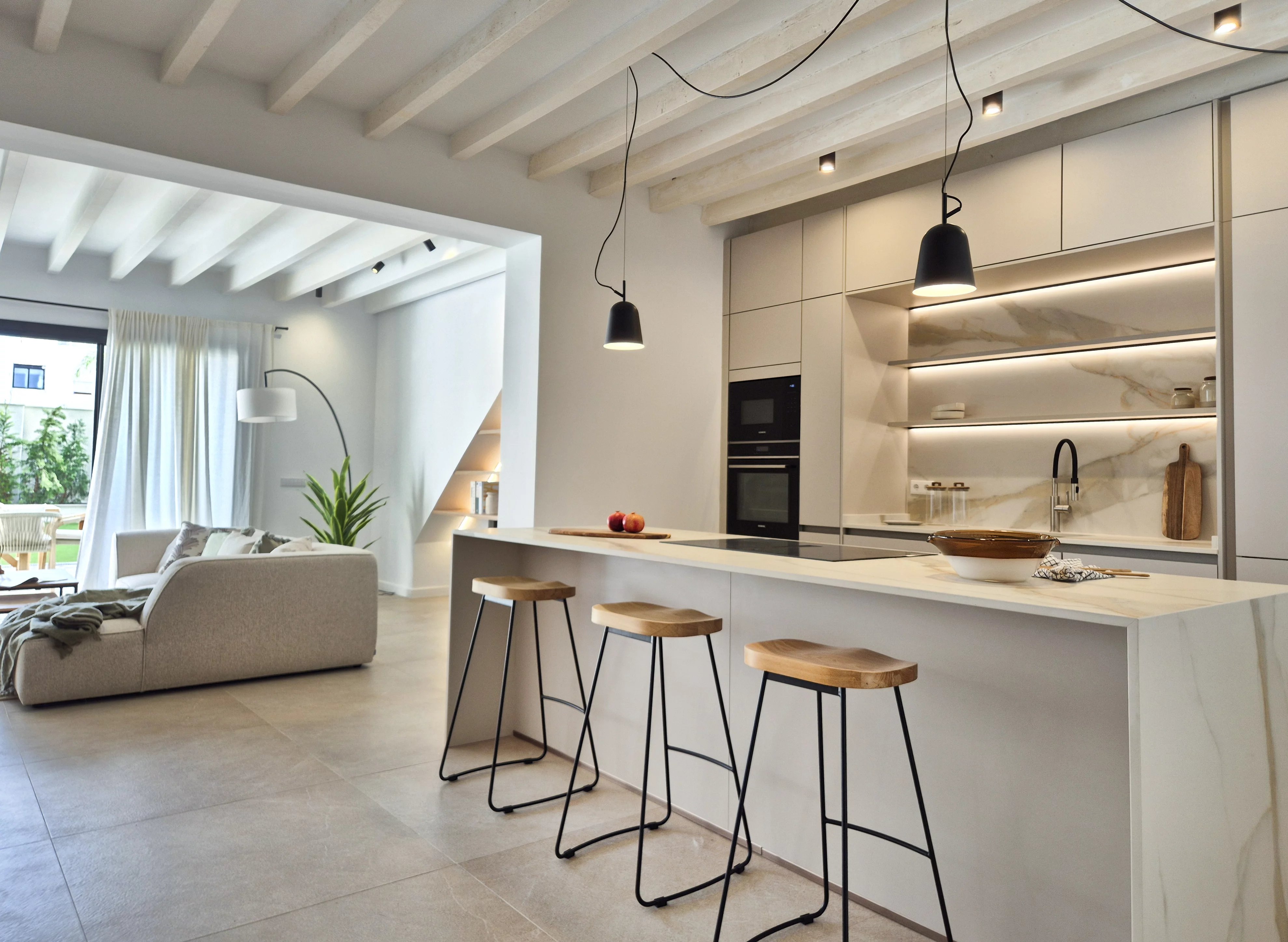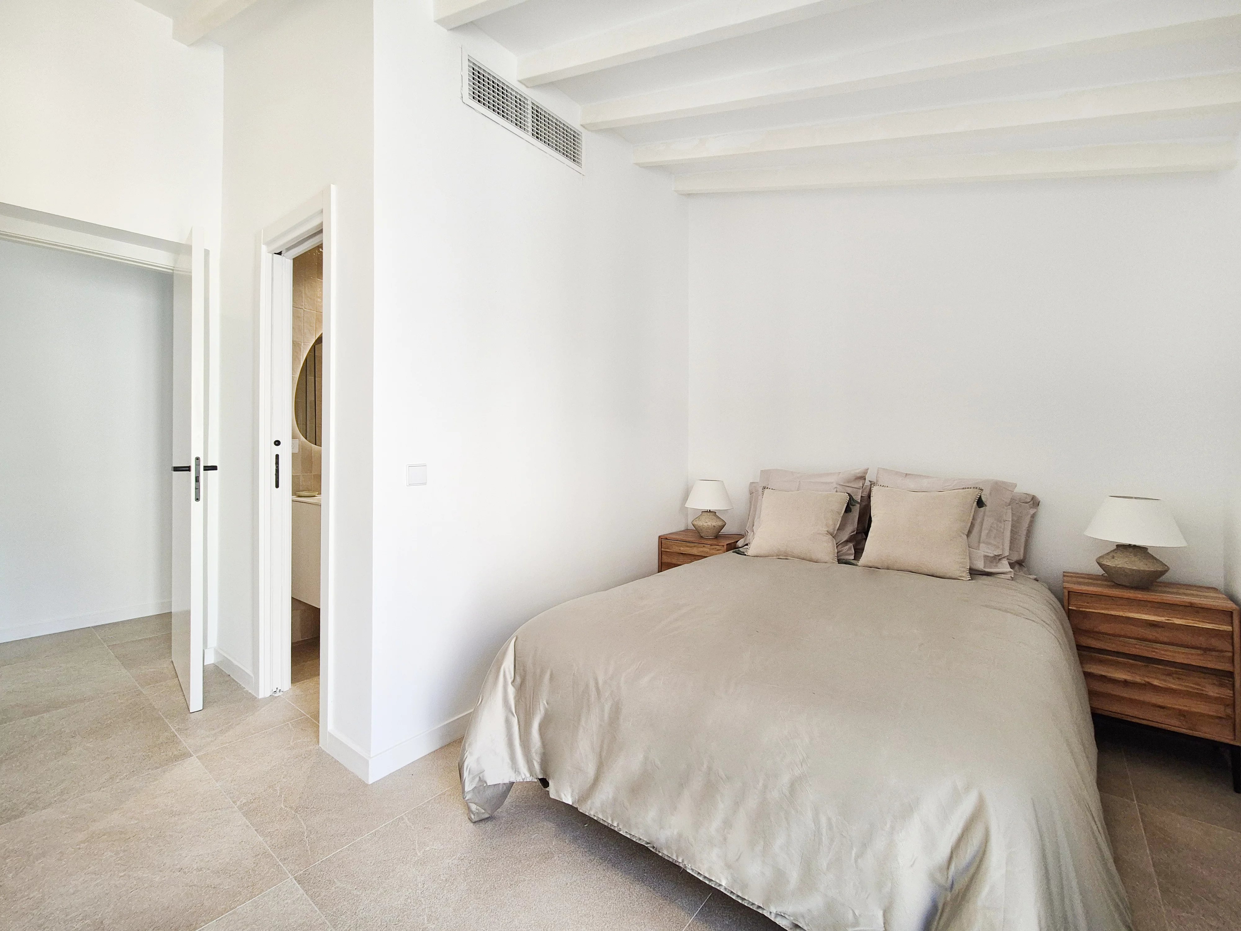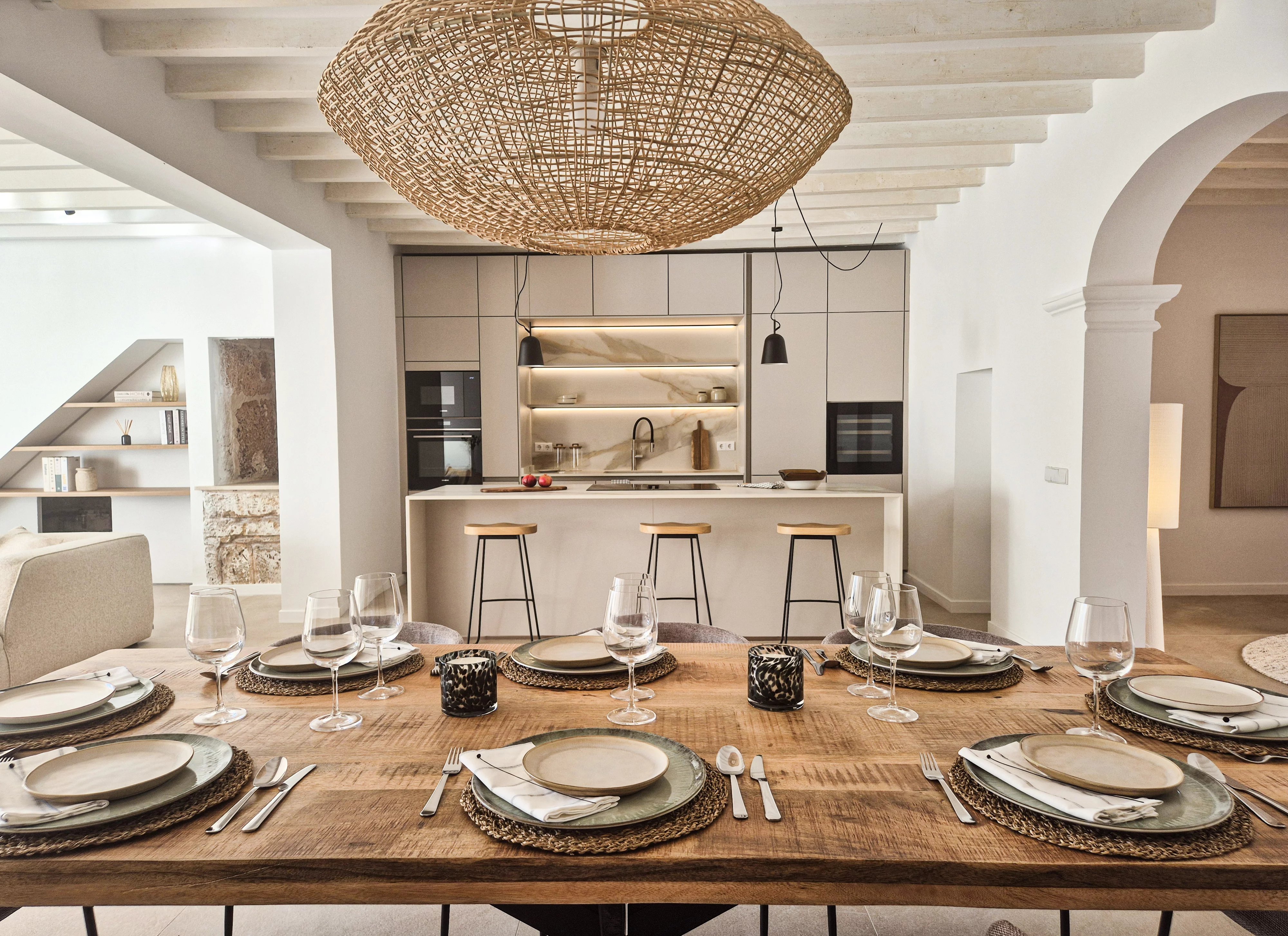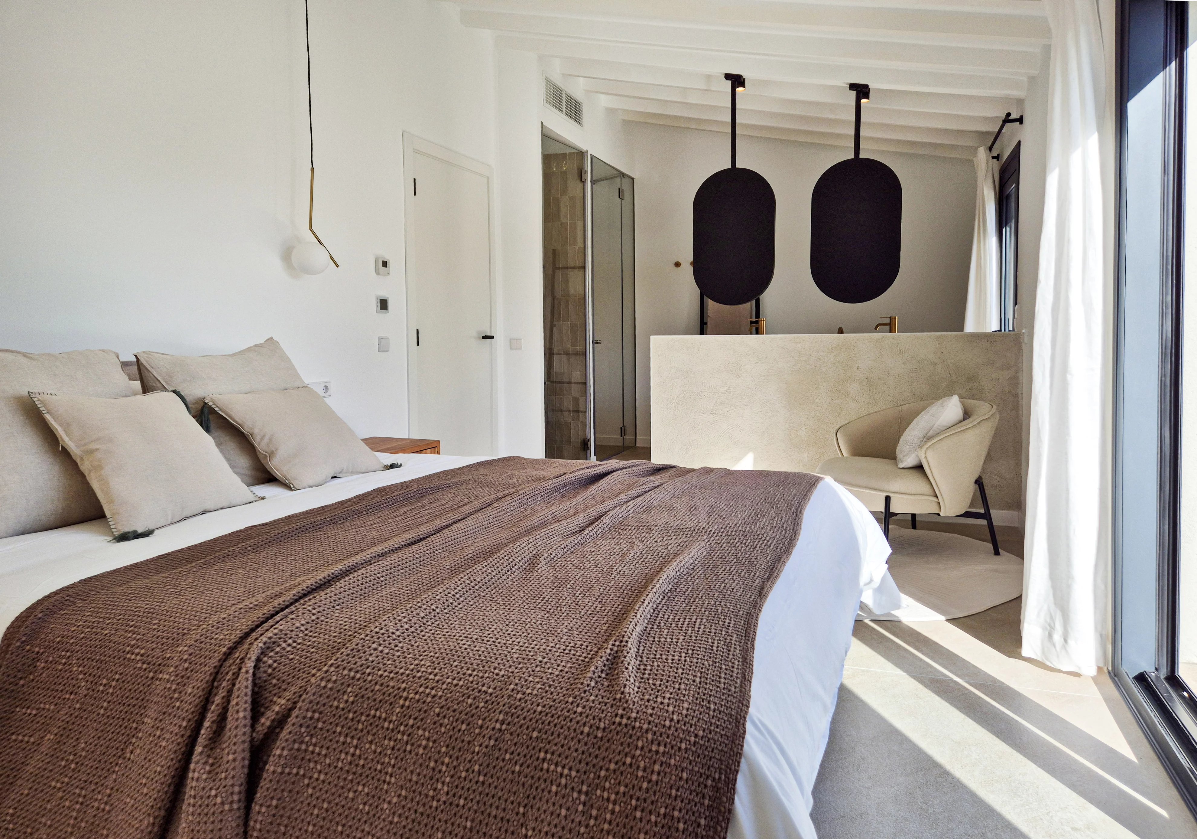 Doppelhohe Decken, Steinakzente und ein offener, sonnendurchfluteter Wohn- und Essbereich führen zu einer privaten Terrasse und einem angelegten Garten, der sich perfekt für Unterhaltungen oder zum Entspannen unter Mallorcas Sonne eignet. Drei geräumige Schlafzimmer mit eigenem Bad im Obergeschoss bieten ein Maximum an Privatsphäre und schaffen einen ruhigen Rückzugsort.