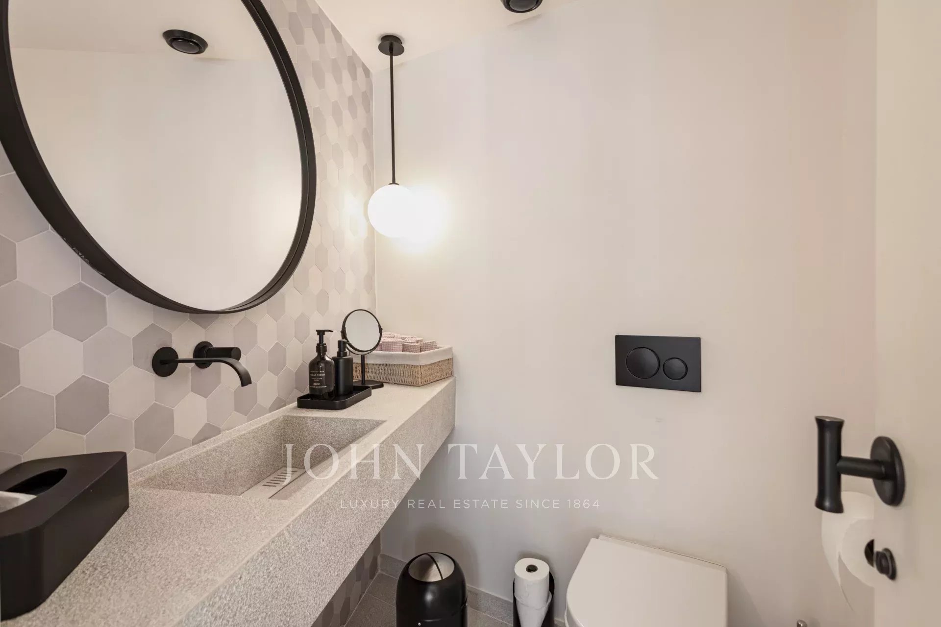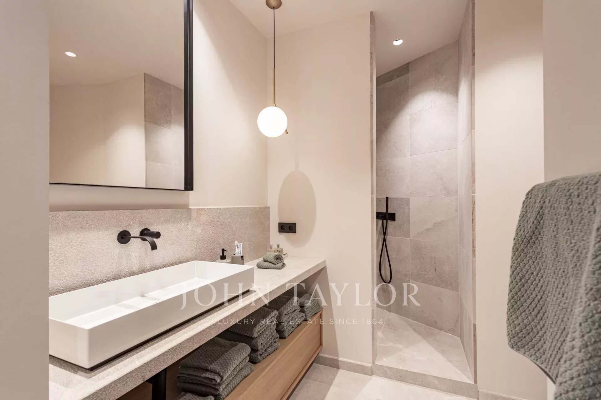 Die Bäder sind mit mattschwarzen Armaturen von ICONICO, Waschbecken von Alape und Waschtischen aus balearischem Naturstein ausgestattet und bestechen durch ihre schlichte Eleganz. Jedes Detail, von den Griffen von Formani bis zu den maßgefertigten Tischlerarbeiten, trägt zu einer kohärenten und gehobenen Designsprache bei.