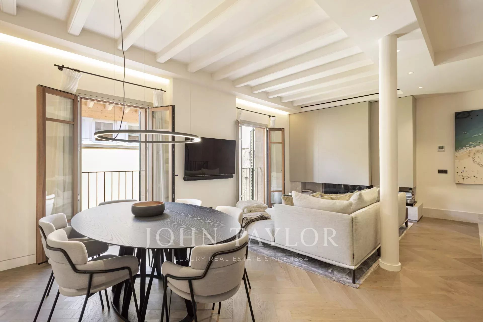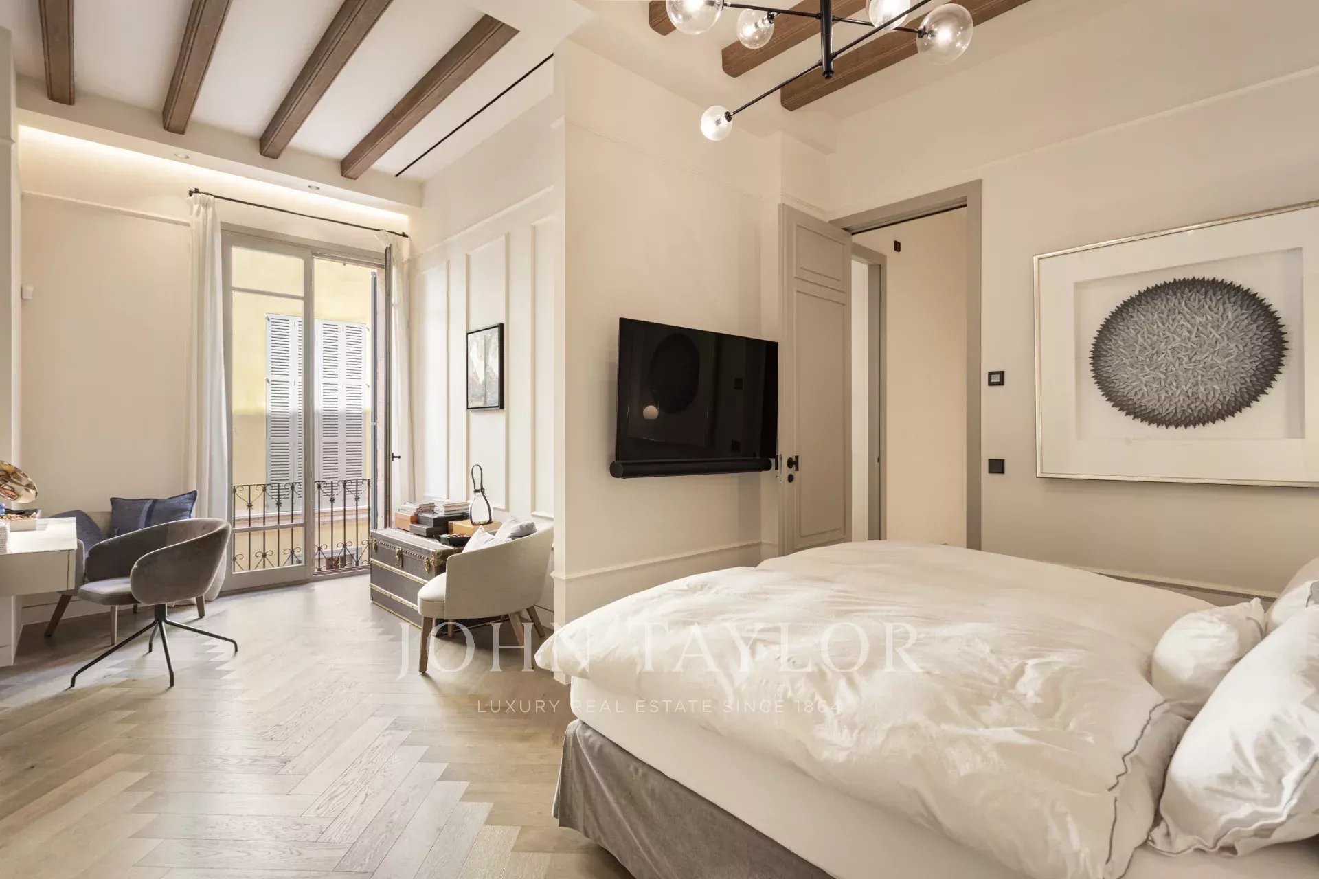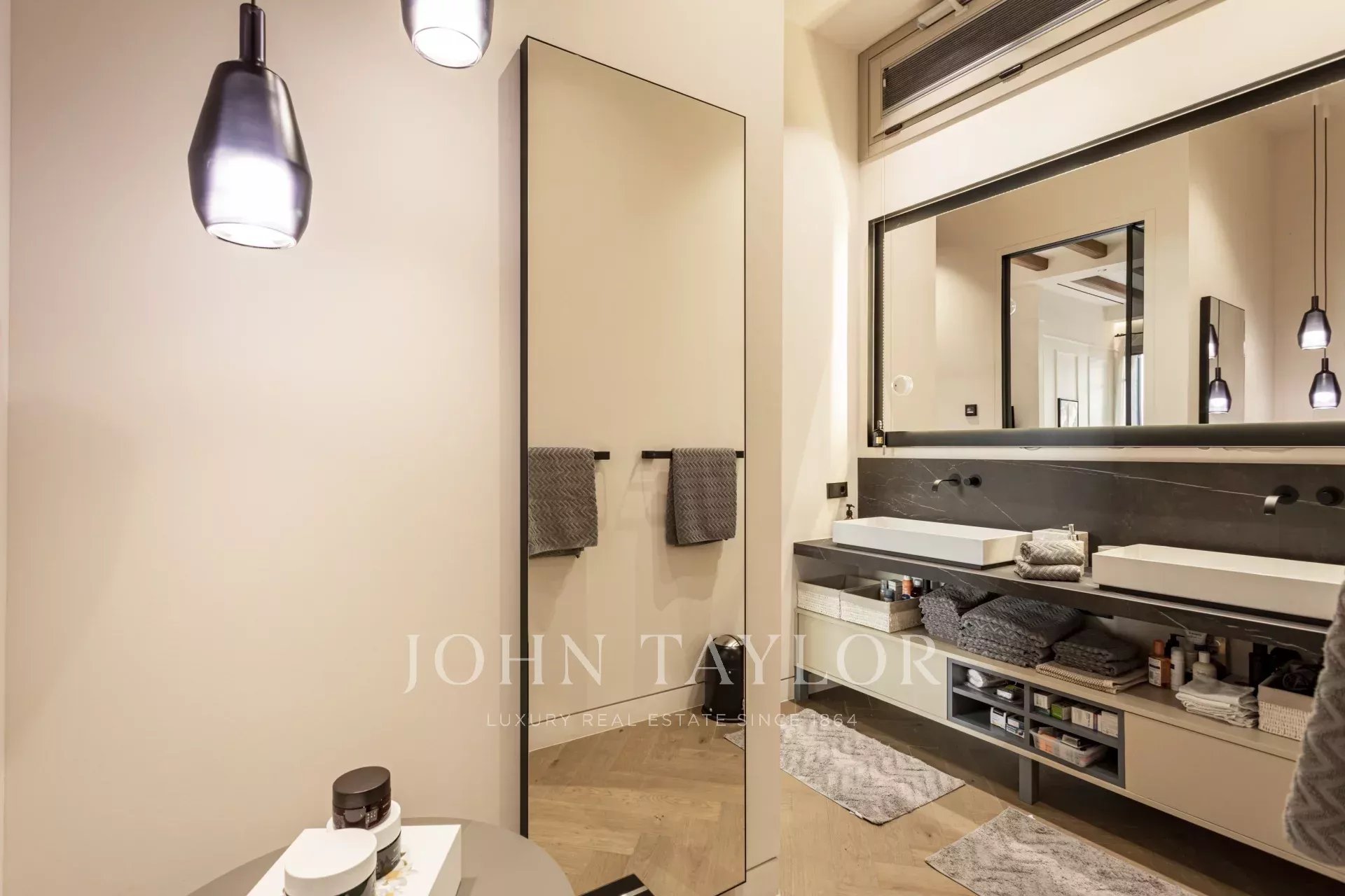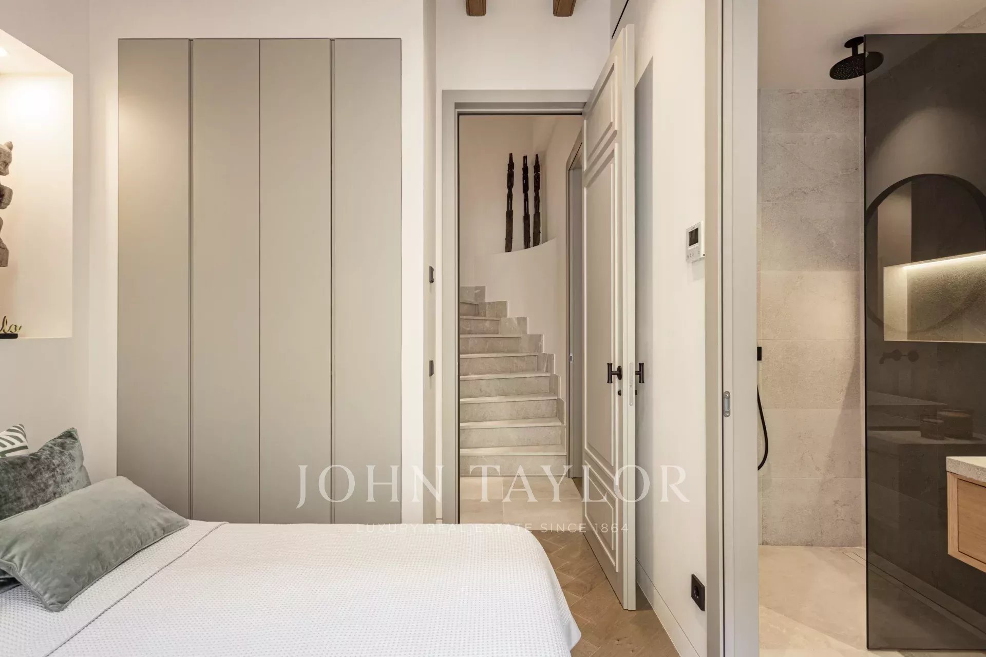 In der gesamten Wohnung sorgen Fischgrätparkett aus Eiche und sorgfältig ausgewählter Naturstein für eine zeitlose Eleganz. Dekorative Leisten und maßgefertigte Holzarbeiten sorgen für einen authentischen Altstadt-Touch, während Fußbodenheizung und eine integrierte Klimaanlage das ganze Jahr über für Komfort sorgen.