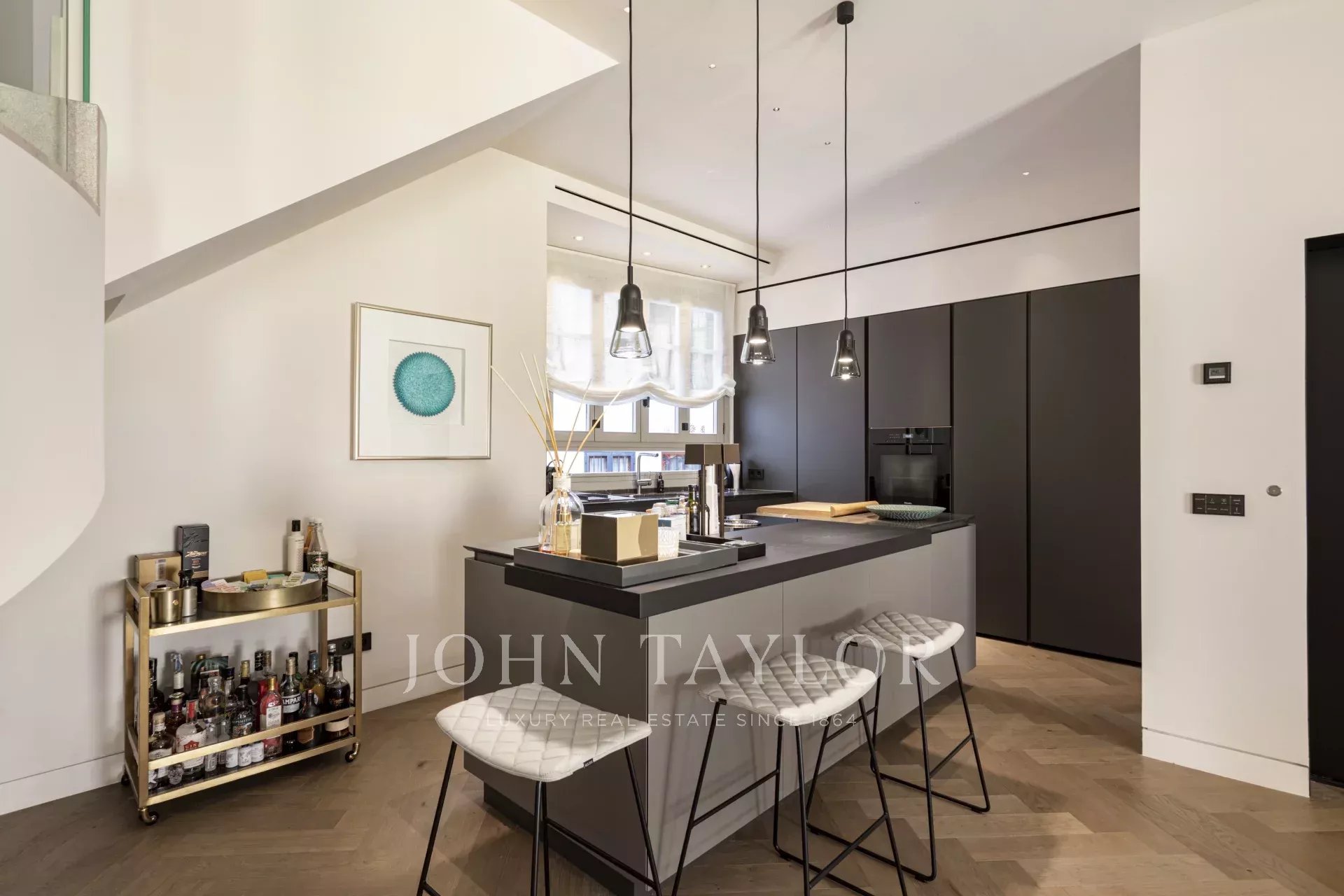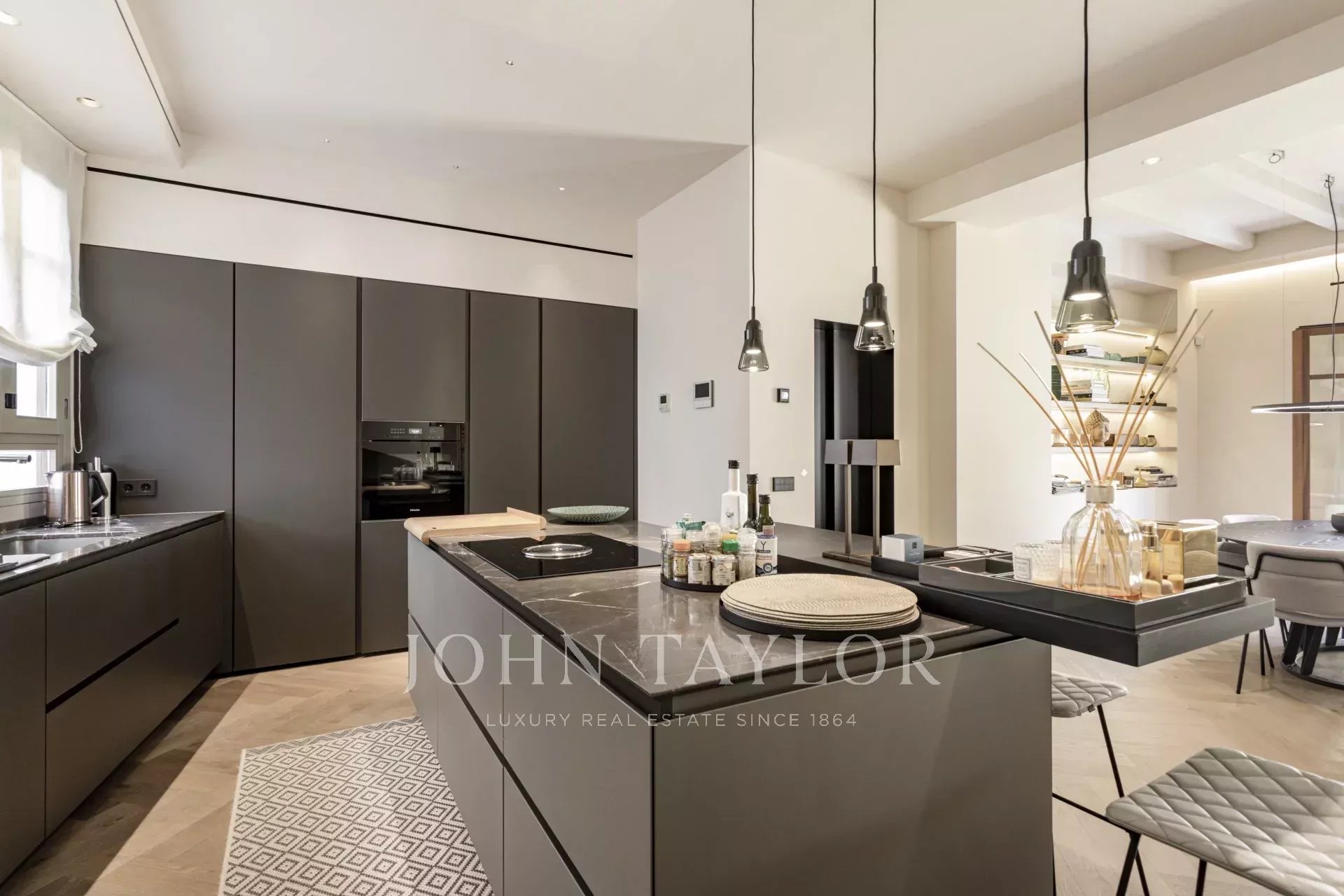 Die von Poliform (Varenna) entworfene Küche bildet das Herzstück der Wohnung. Eine zentrale Insel, Arbeitsplatten aus Naturstein und eine Snackbar aus Holz verbinden Funktionalität mit Stil. Geräte von Miele und Bora garantieren eine professionelle Leistung, die höchsten Ansprüchen gerecht wird.