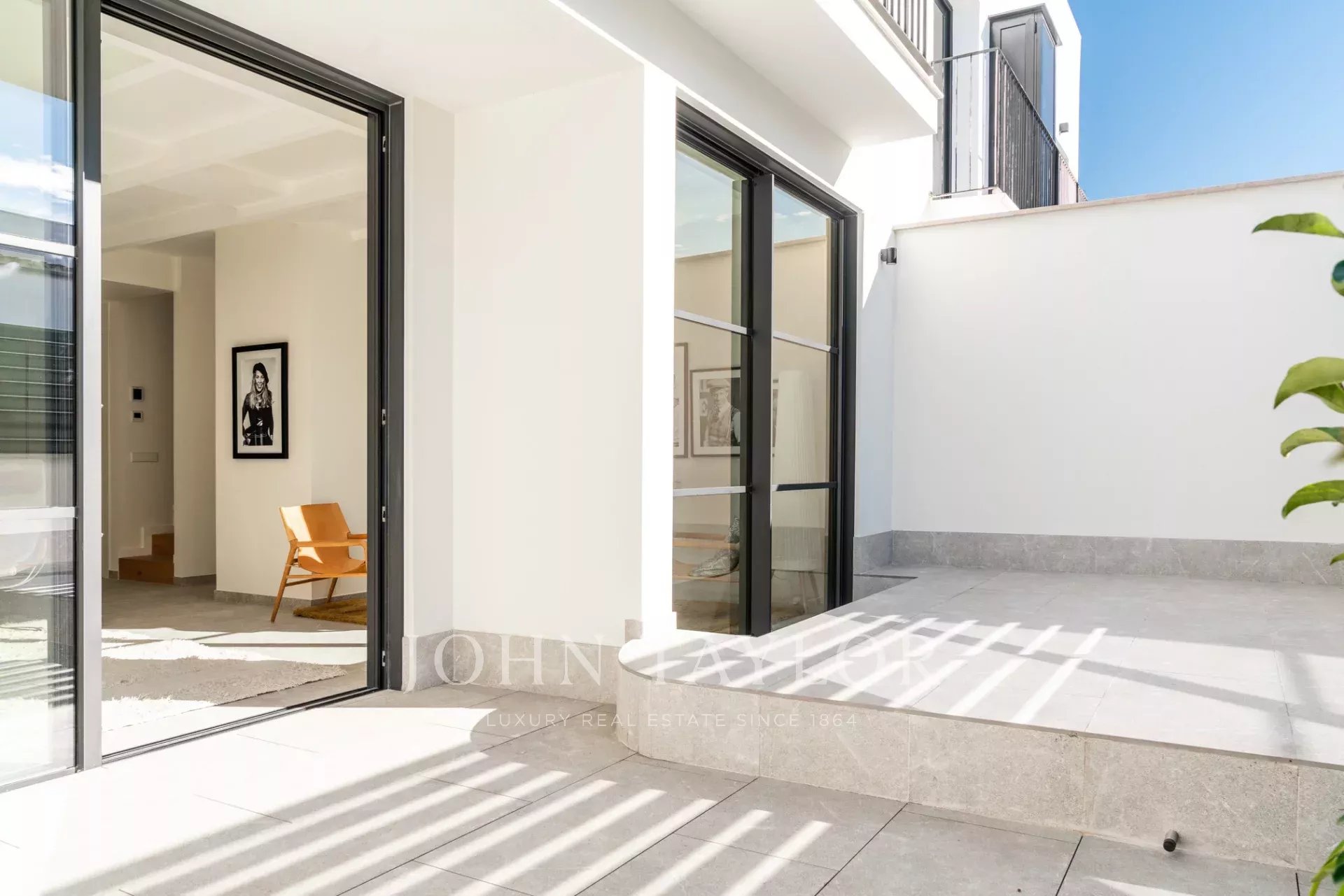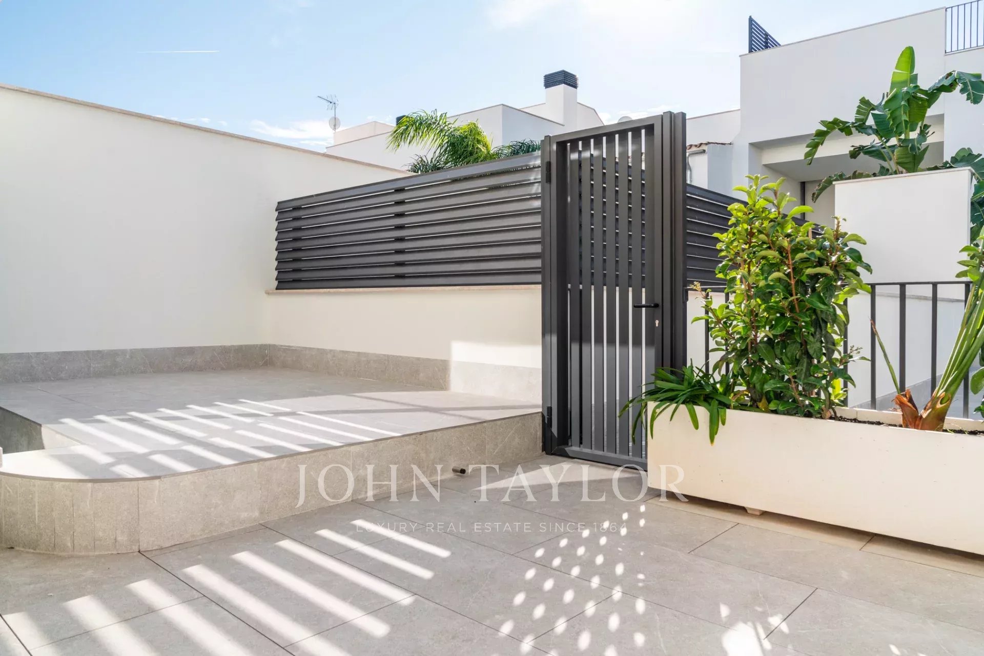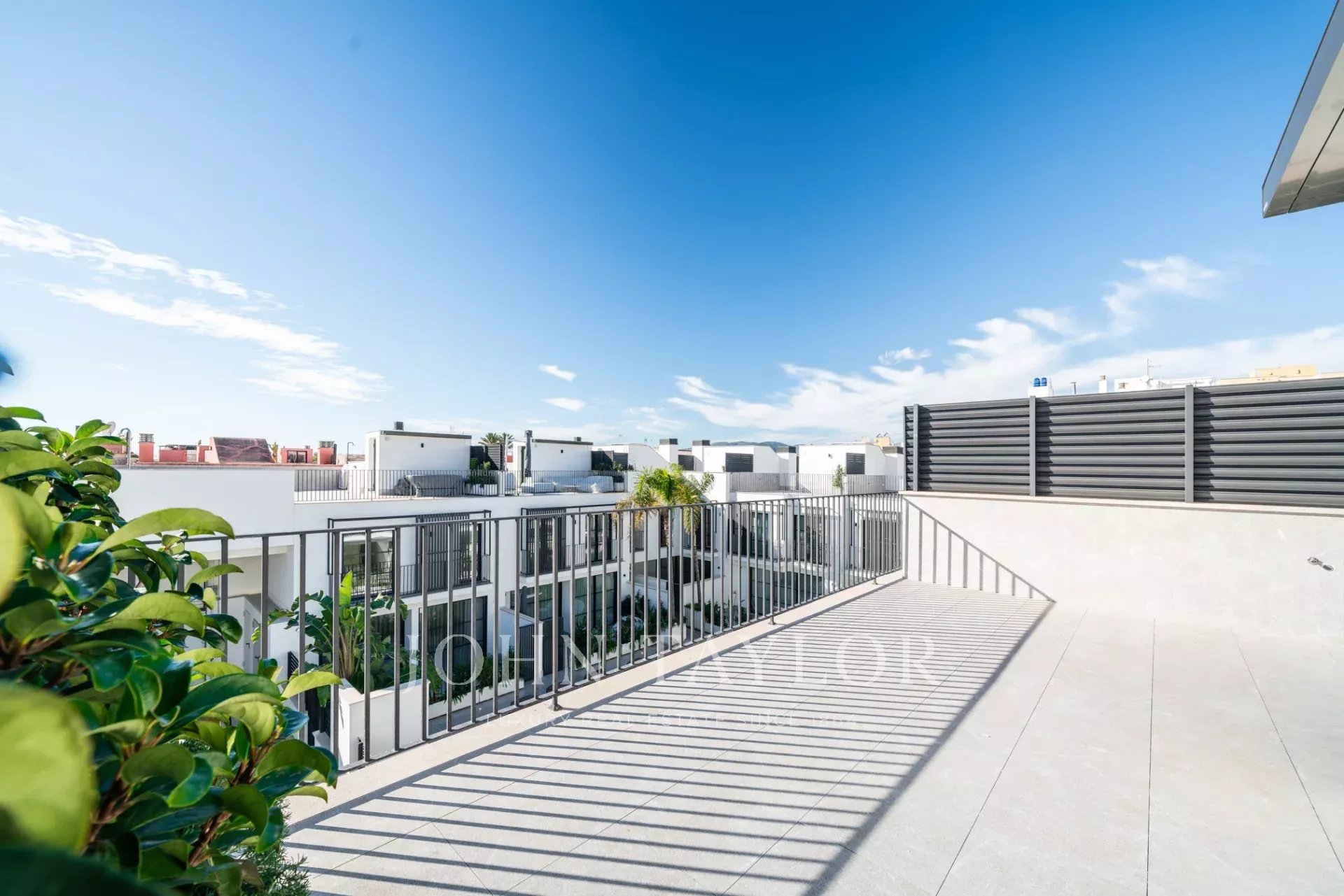 Im Obergeschoss teilen sich zwei große Schlafzimmer ein wunderschön eingerichtetes Badezimmer, während die Master-Suite über ein eigenes Bad und eine private Terrasse mit atemberaubender Aussicht verfügt. Eine 44 m² große Dachterrasse bietet zusätzlichen Platz für Unterhaltungen, Sonnenbäder oder die Einrichtung Ihrer Traumküche im Freien.