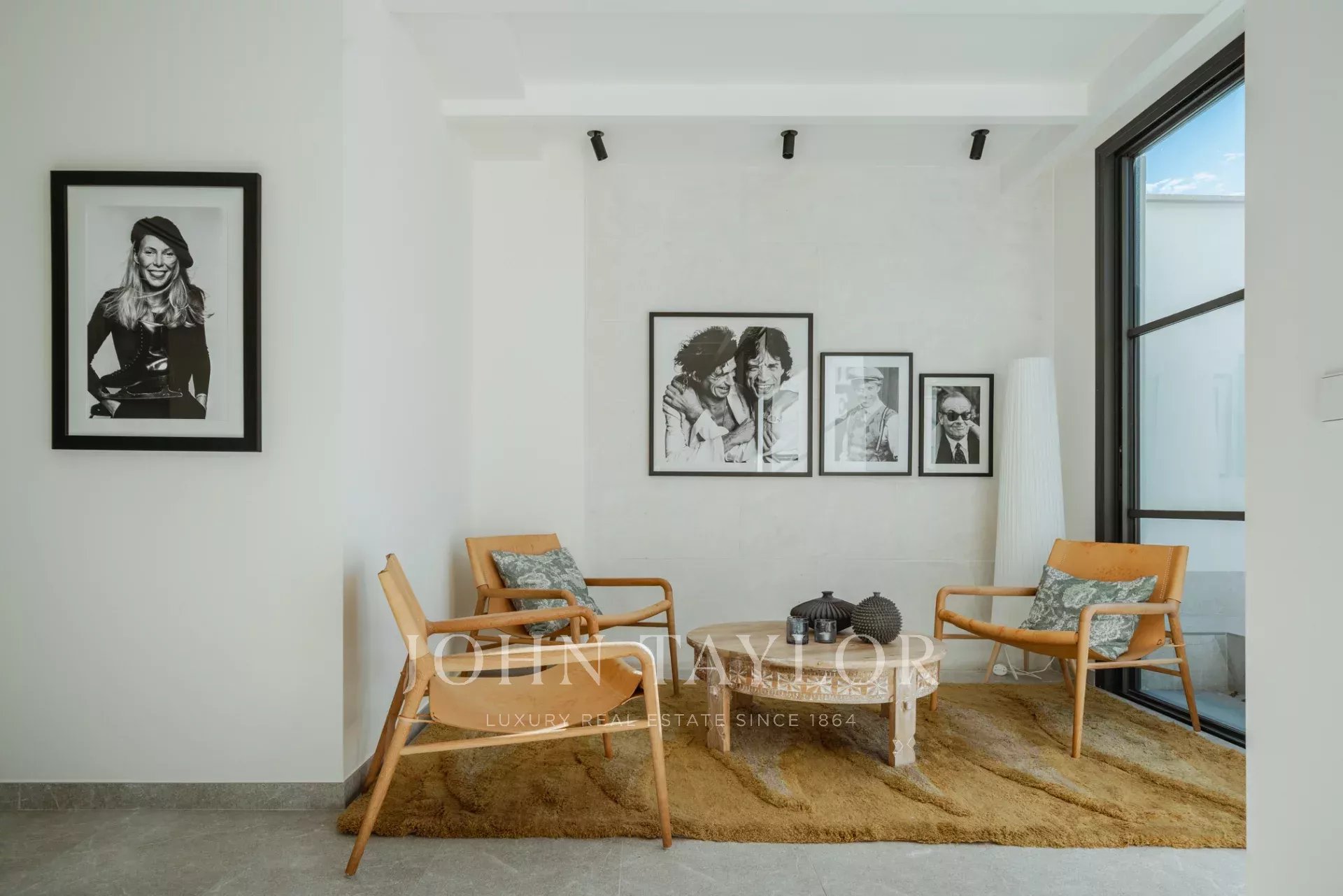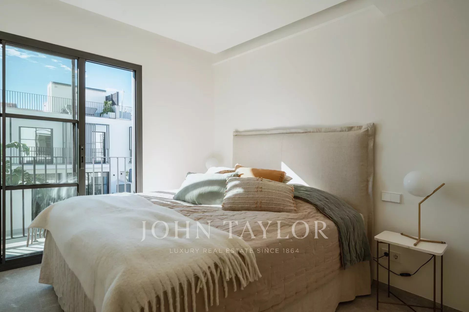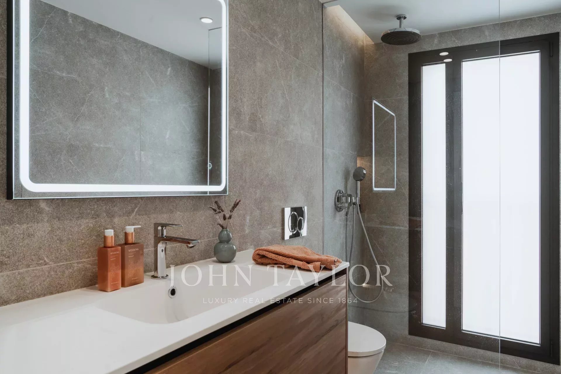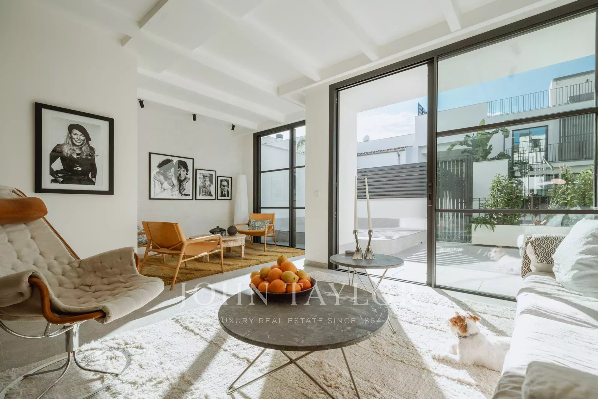 Im Obergeschoss teilen sich zwei große Schlafzimmer ein wunderschön eingerichtetes Badezimmer, während die Master-Suite über ein eigenes Bad und eine private Terrasse mit atemberaubender Aussicht verfügt. Eine 44 m² große Dachterrasse bietet zusätzlichen Platz für Unterhaltungen, Sonnenbäder oder die Einrichtung Ihrer Traumküche im Freien.
