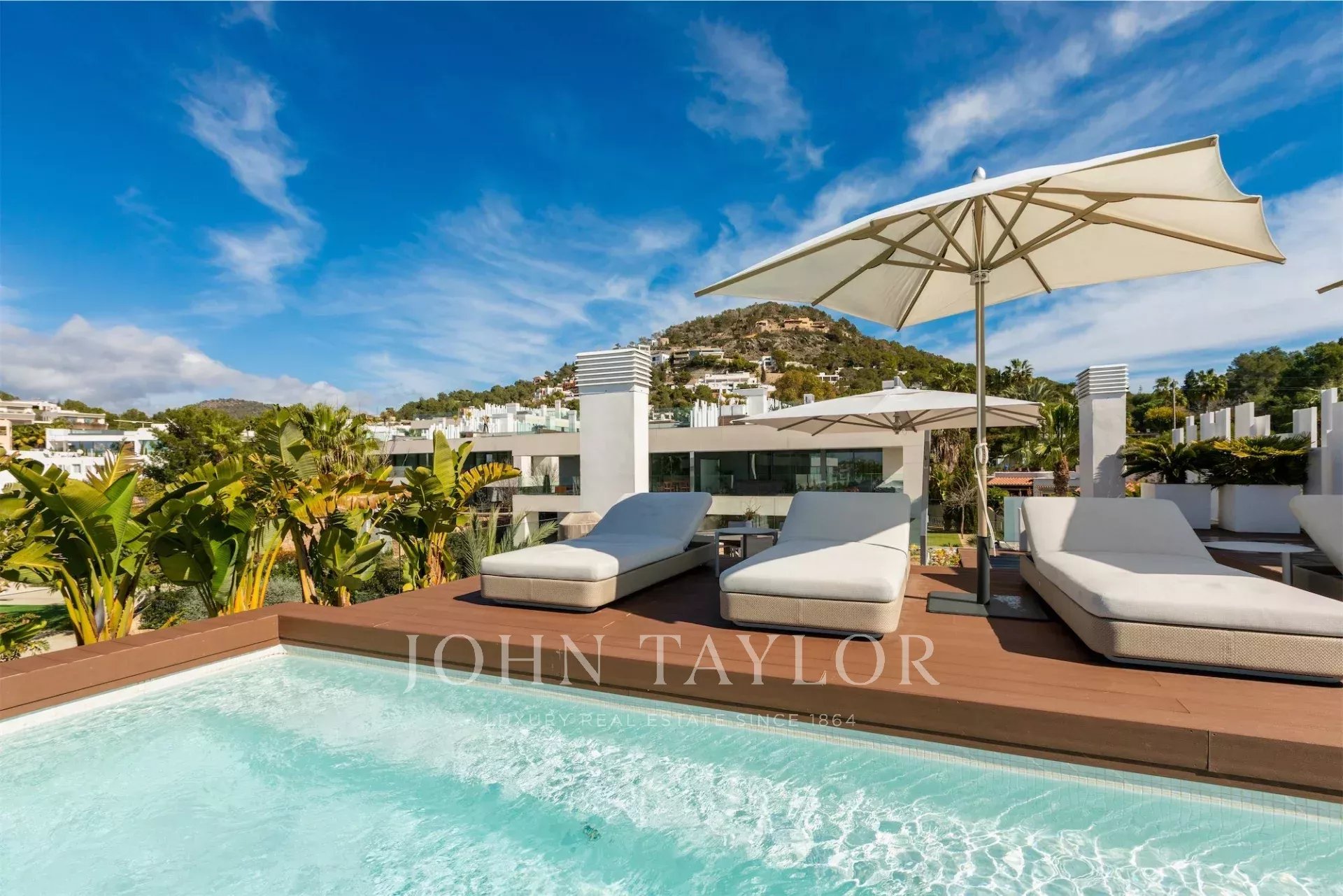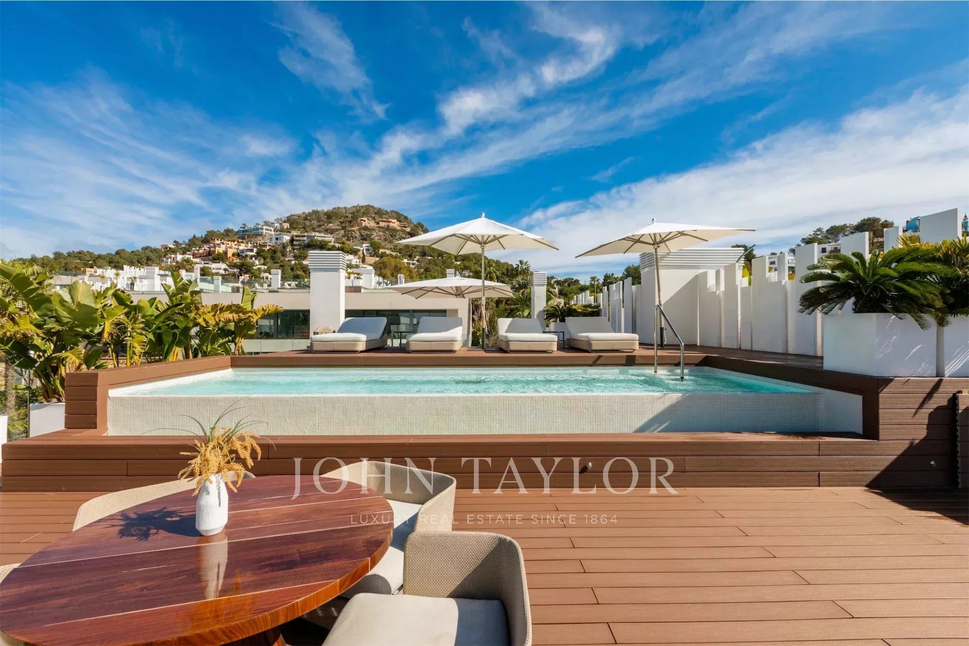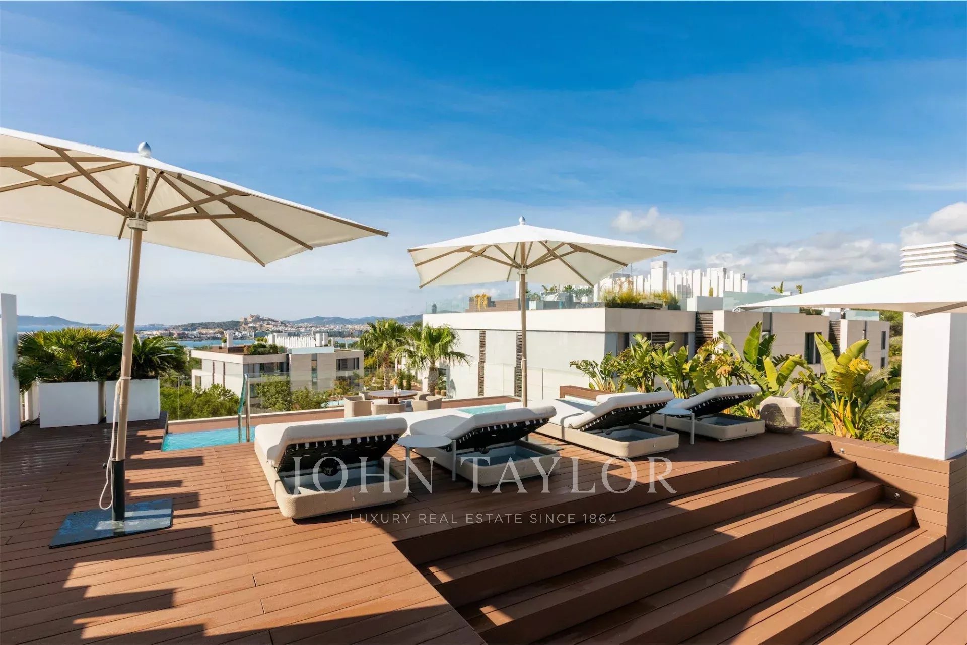 Das Highlight ist die Dachterrasse mit zweitem privaten Pool, Lounge-Bereich und spektakulärem Panoramablick. Dank Südwest-Ausrichtung genießt man hier Sonne den ganzen Tag.