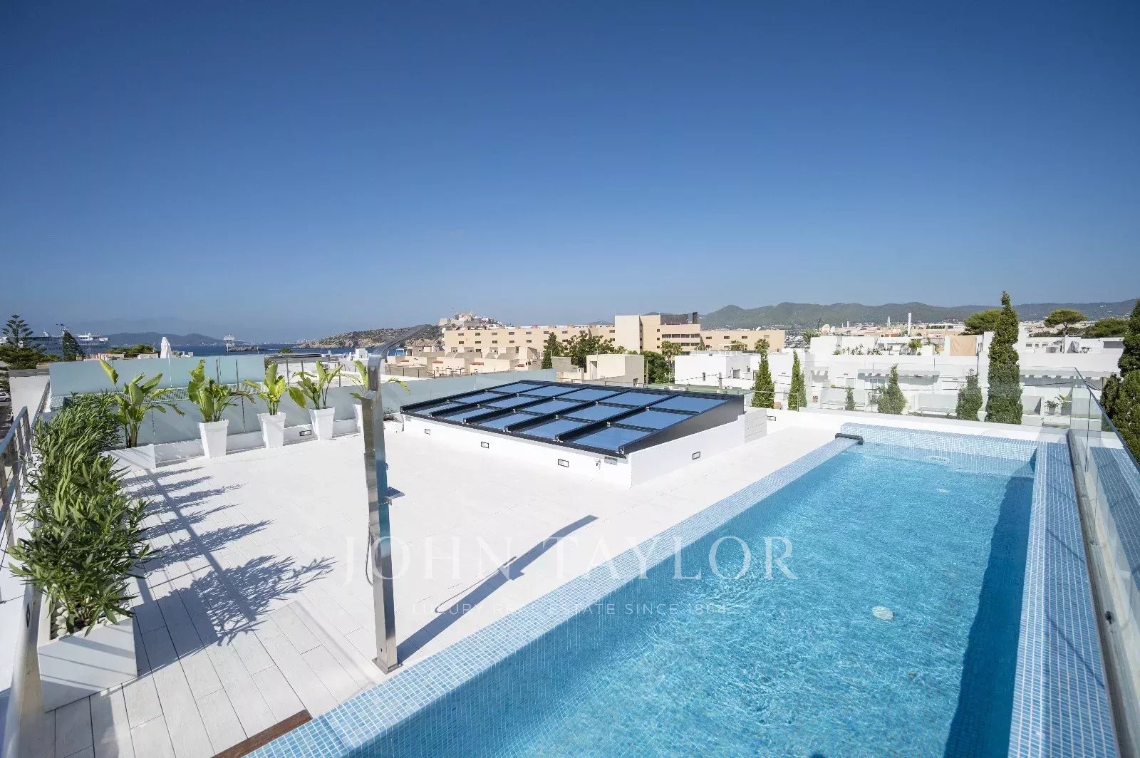 Die Terrasse mit Panoramablick auf das Meer von Formentera und Teile von Talamanca ist für den Einbau einer Küche oder Arbeitsfläche vorbereitet, mit Wasser- und Stromanschlüssen für Geschirrspüler, Kühlschrank und mehr – je nach Vorlieben des neuen Besitzers.