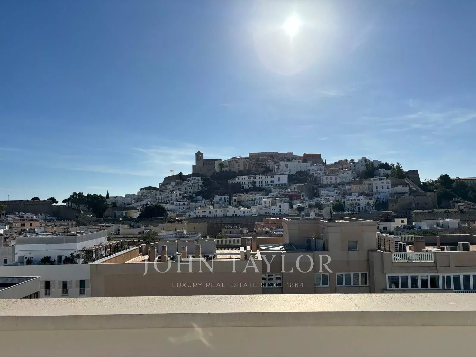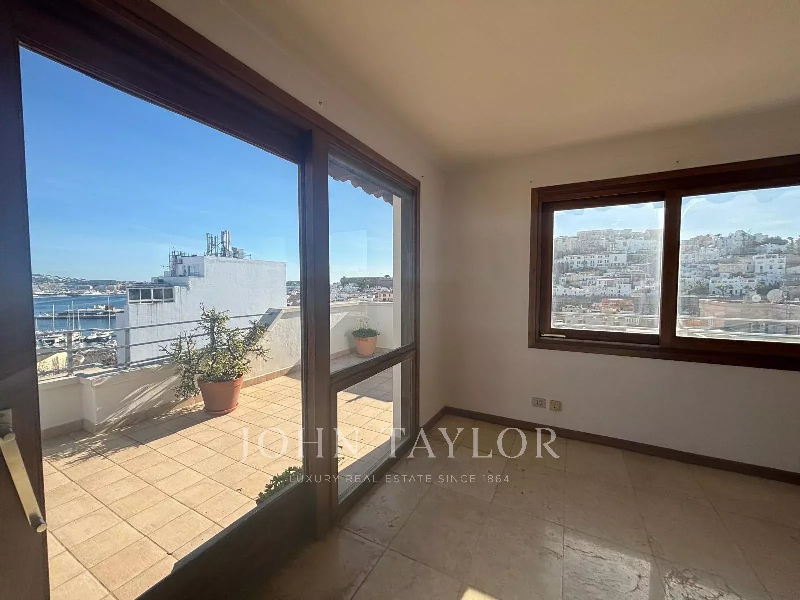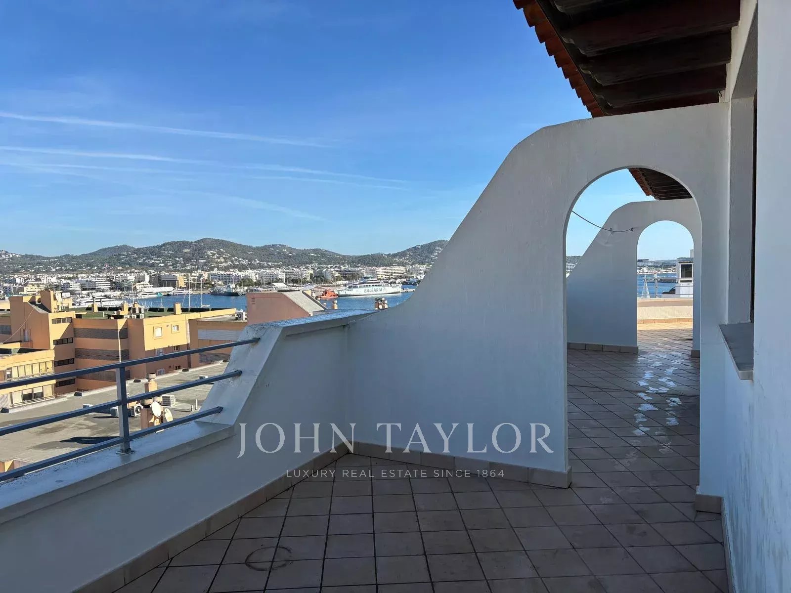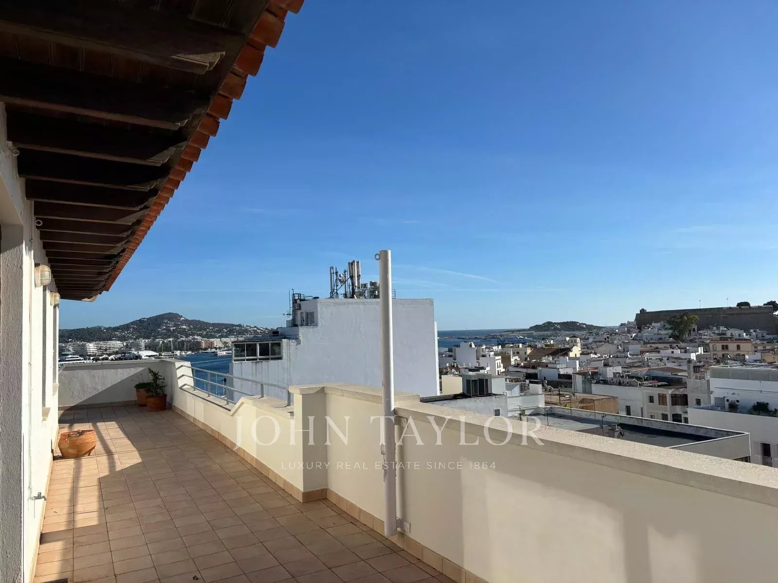 Duplex-Dachgeschoss in Ibiza mit 250 m² Wohnfläche und einer 90 m² Terrasse, die beeindruckende 180-Grad-Blicke auf Dalt Vila, den Hafen von Ibiza und die Berge bietet.