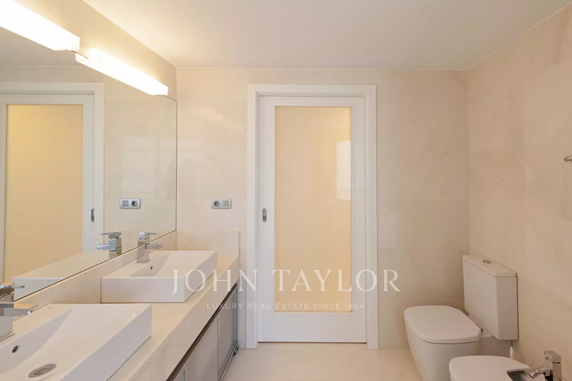 Im Obergeschoss befindet sich ein großzügiges privates Solarium, perfekt zum Sonnenbaden oder um Zeit mit Freunden und Familie zu verbringen, das außerdem einen separaten Waschbereich umfasst.