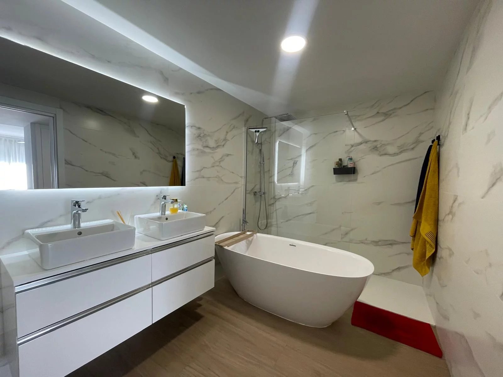 Der private Teil bietet vier Schlafzimmer, zwei davon mit eigenem Bad, und eine herrliche Master-Suite mit Ankleideraum und Zugang zur zweiten Terrasse. Alle Bäder sind auf höchstem Niveau ausgestattet. Die Immobilie verfügt über eine Fußbodenheizung (warm/kalt), eine aerothermische Klimaanlage, eine Hausautomation und eine hervorragende Isolierung, um maximalen Komfort zu gewährleisten.