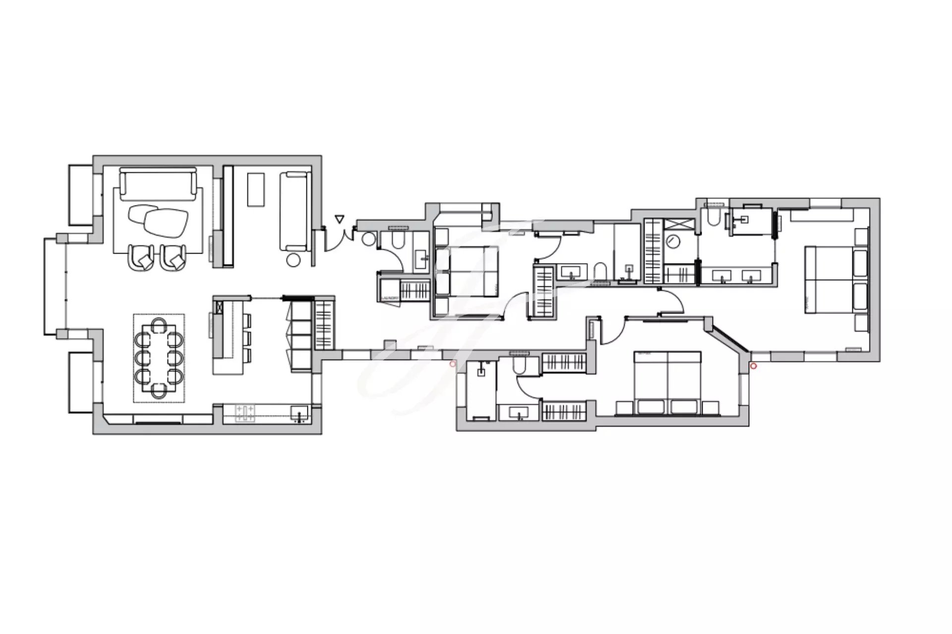 Das Objekt befindet sich im dritten Stockwerk und bietet 164 m² geräumige und helle Räume, die durch 3 Meter hohe Decken und drei Balkone, die dank ihrer westlichen Ausrichtung das Objekt mit natürlichem Licht durchfluten, aufgewertet werden. Der Grundriss wurde sorgfältig konzipiert, um Eleganz und Funktionalität zu vereinen: drei Schlafzimmer mit eigenem Bad und ein Gäste-WC bilden eine Wohnung, die für maximalen Komfort und Privatsphäre konzipiert wurde.