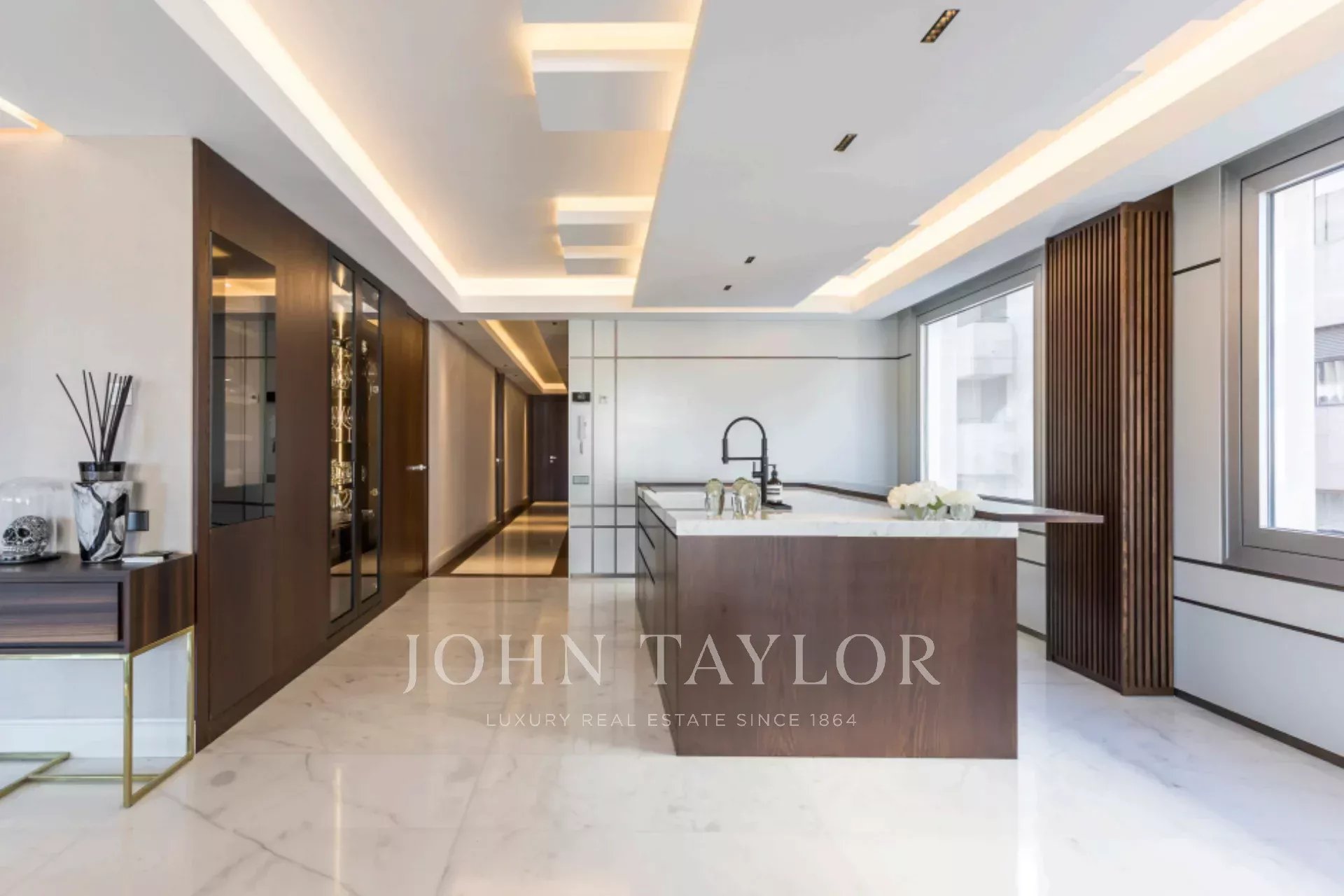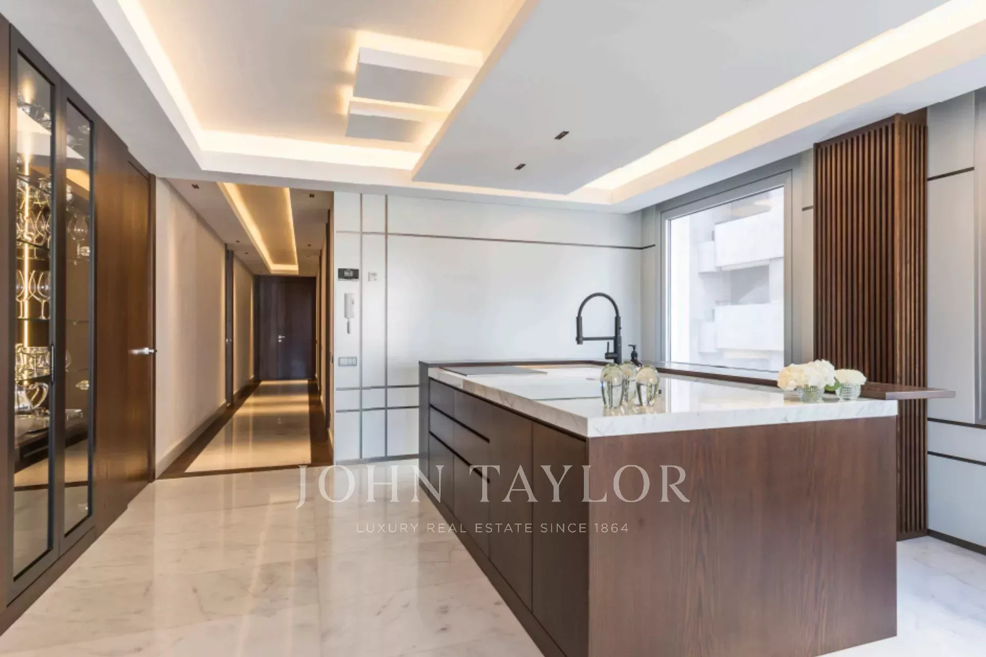 Der Grundriss umfasst einen geräumigen Empfangsbereich mit integriertem Esszimmer, in dem bis zu zwölf Personen Platz finden, und ein großes Wohnzimmer, das sich zu einer Terrasse mit freiem Blick öffnet. Die voll ausgestattete Küche mit hochwertigen Geräten und einem Weinkeller schließt nahtlos an das Wohnzimmer an, während eine zweite, unabhängige Küche zusätzliche Funktionen bietet, einschließlich eines Waschraums, eines Dienstbetts und eines Badezimmers, was diesen Raum in eine unabhängige Wohnung verwandelt.