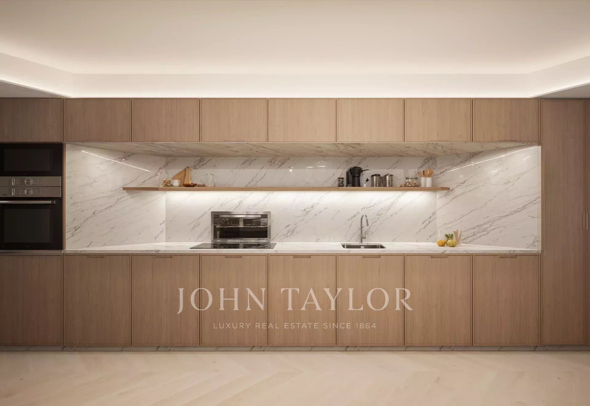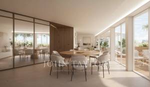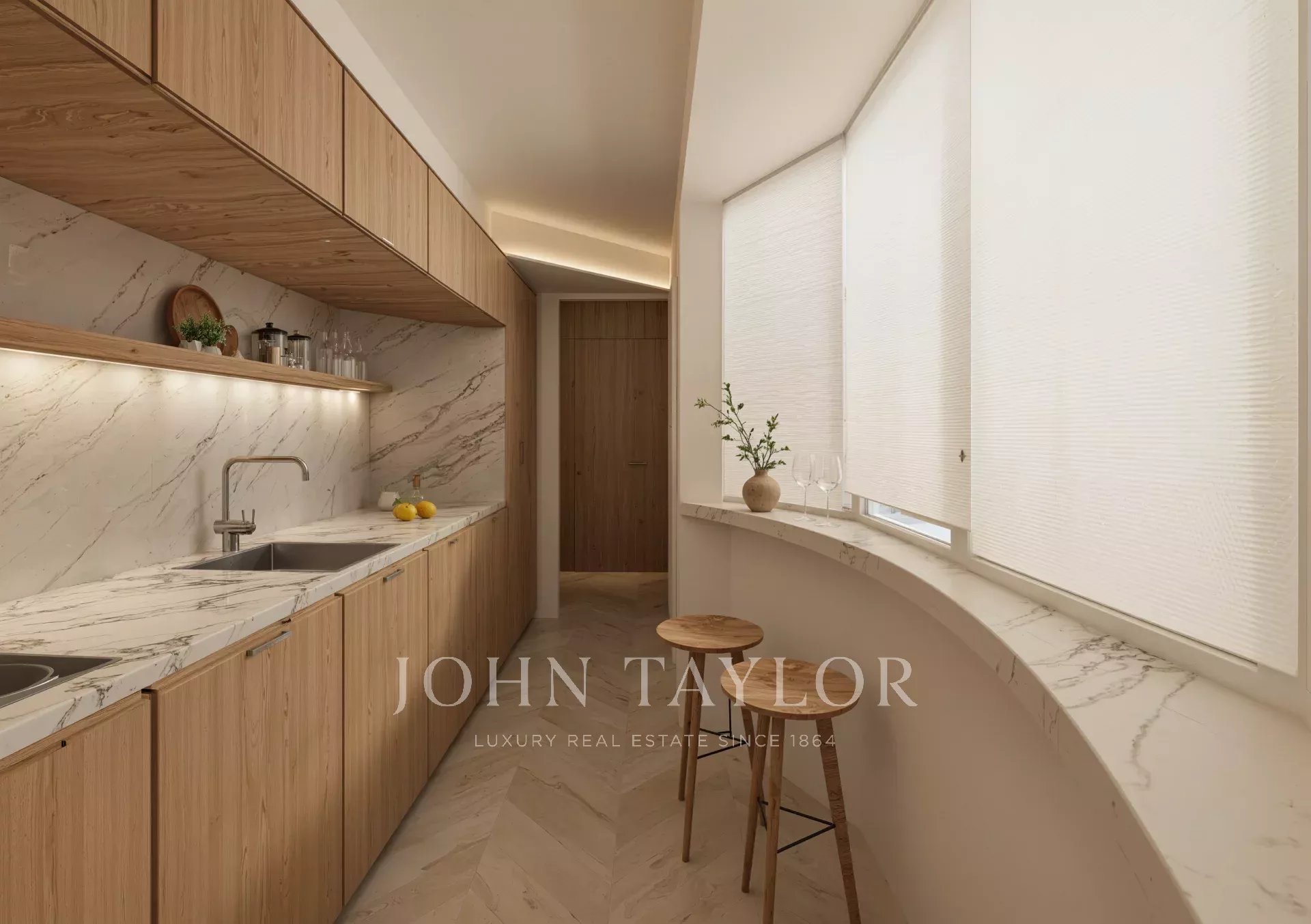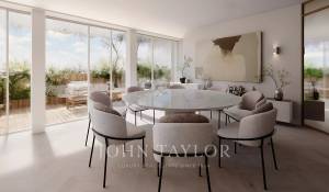 Die Wohnung nimmt die gesamte achte Etage des Gebäudes ein und ist perfekt um den großen zentralen Innenhof herum in zwei verschiedene Bereiche gegliedert: einen Gemeinschaftsbereich und einen privaten Bereich. Gleich beim Betreten der Wohnung findet man das große, lichtdurchflutete und nach Westen ausgerichtete Wohn-Esszimmer. Die fast 20 m² große Terrasse ist durch bodentiefe Glasschiebetüren in das Wohnzimmer integriert, von wo aus man einen herrlichen, ungehinderten Blick genießen kann. Ein charmantes Gäste-WC vervollständigt den Sozialbereich.