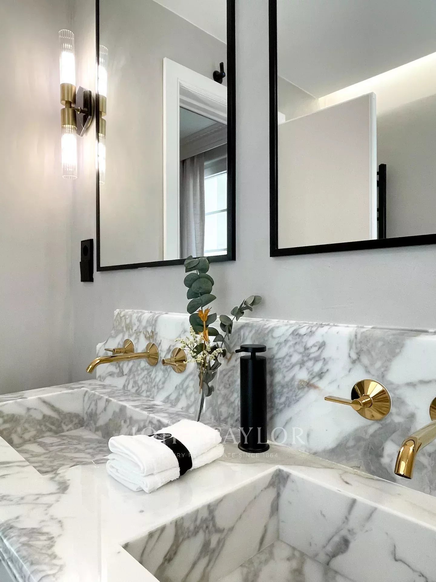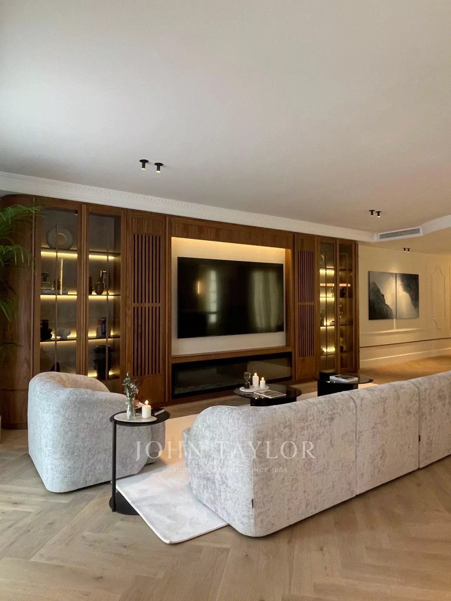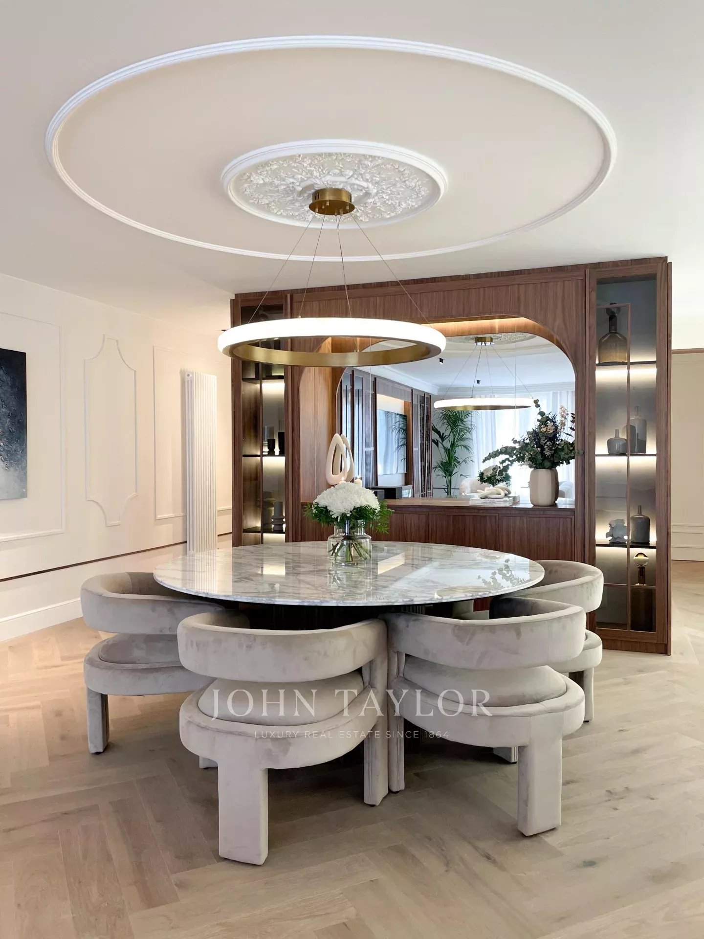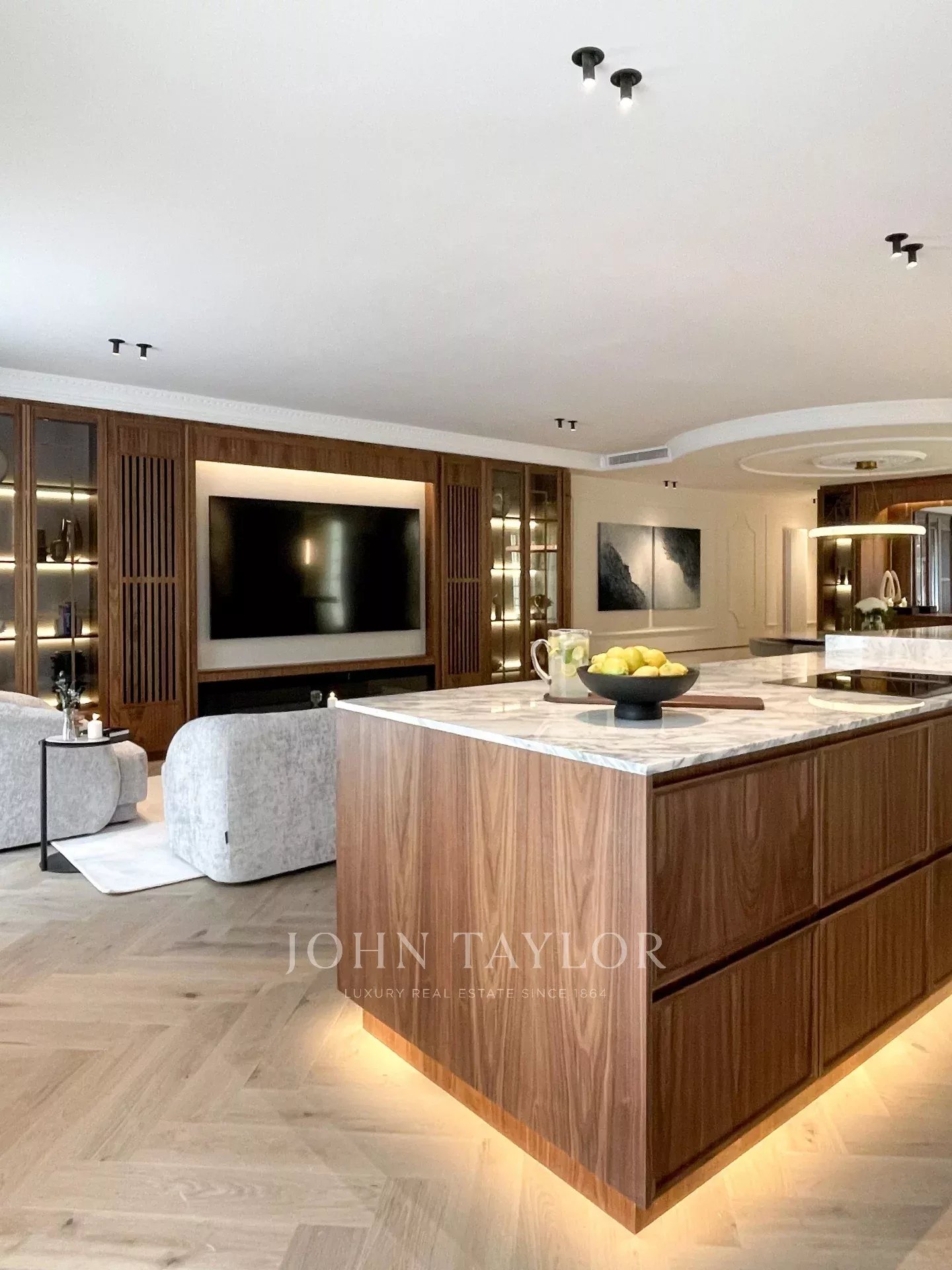 Wir betreten die Wohnung durch einen großen Empfangsbereich. Auf der linken Seite befindet sich der Sozialbereich mit einem großen Wohnzimmer, einem Esszimmer und einer offenen, voll ausgestatteten Küche mit einer großen Insel in der Mitte und einer separaten Waschküche. In diesem Bereich gibt es auch eine Gästetoilette.