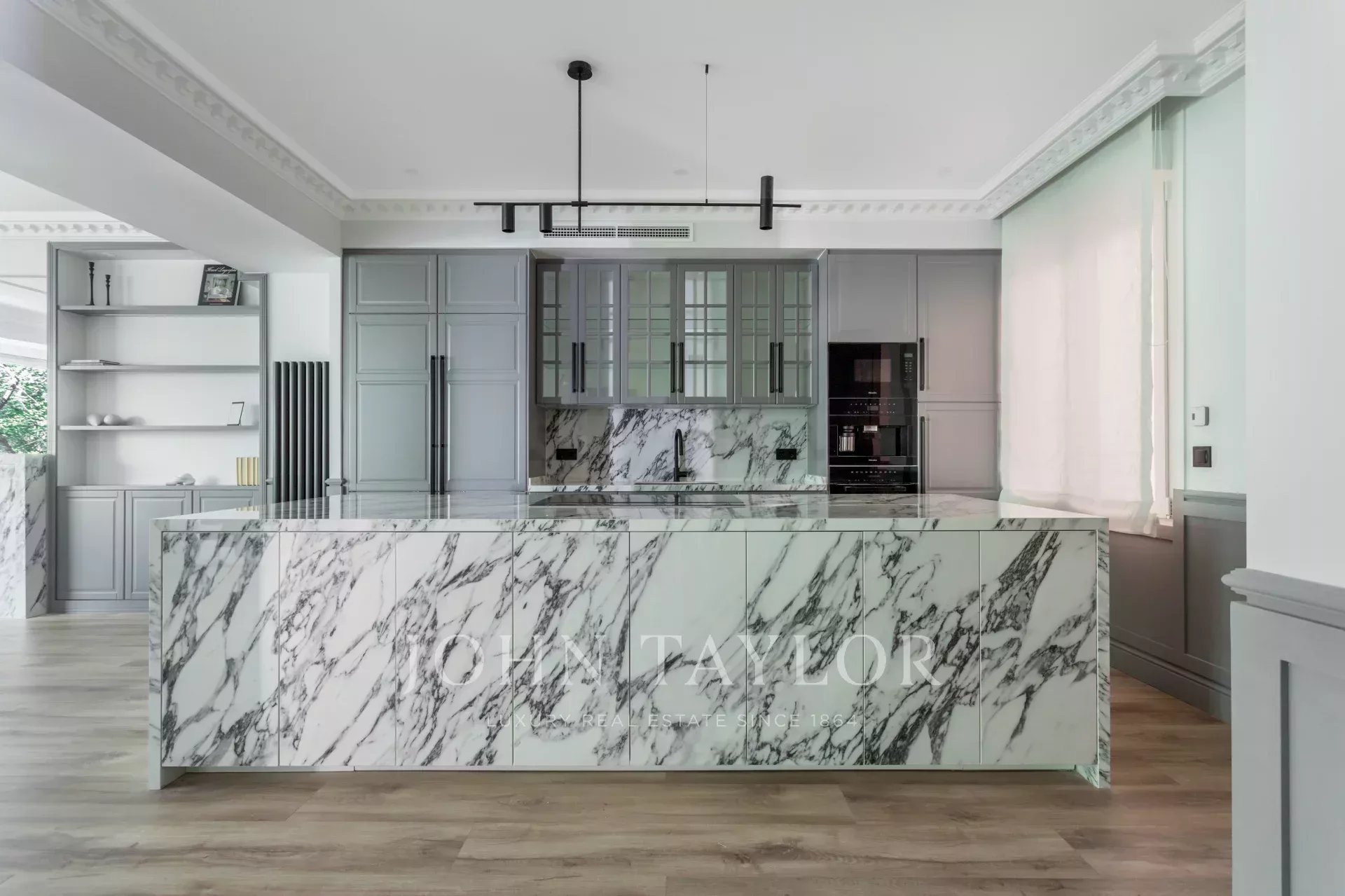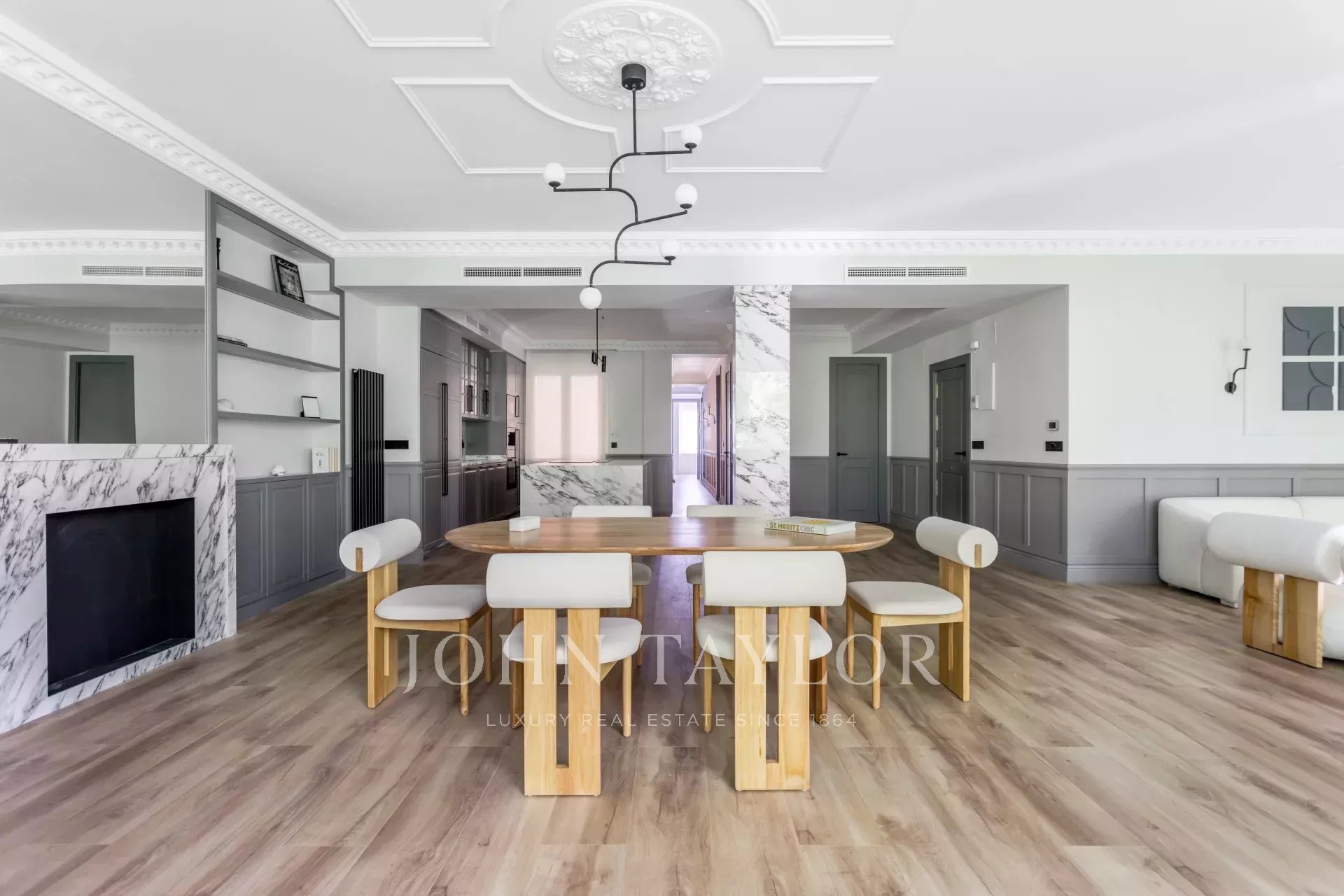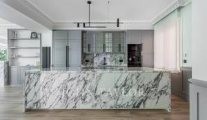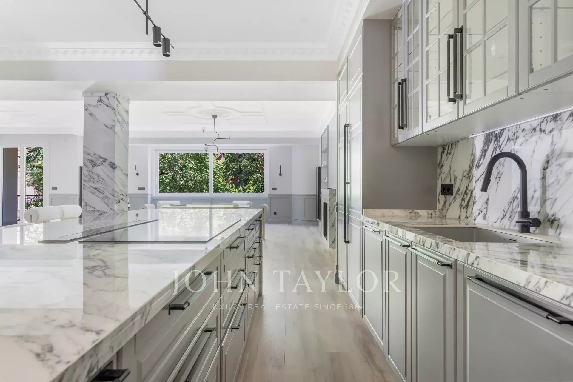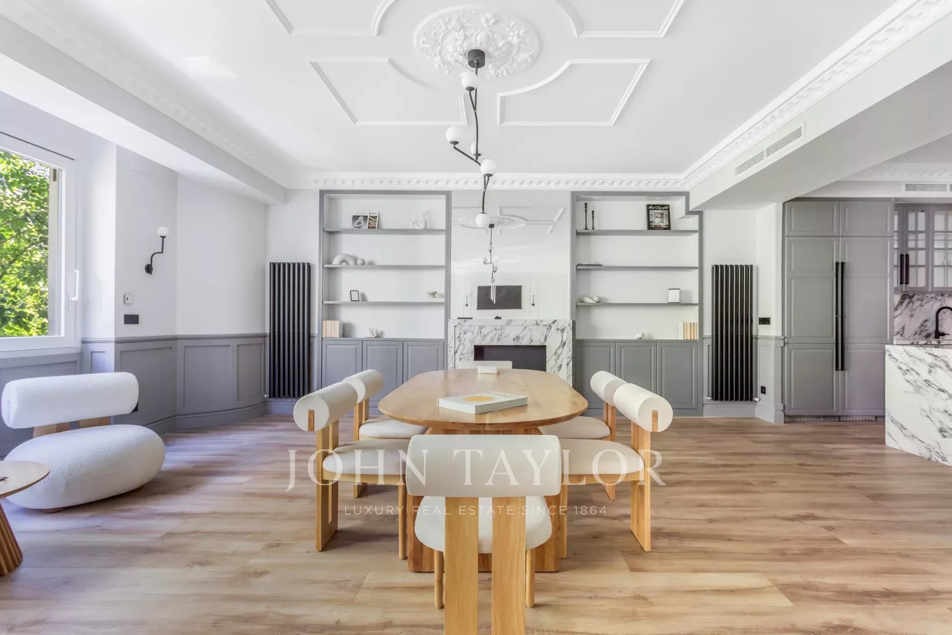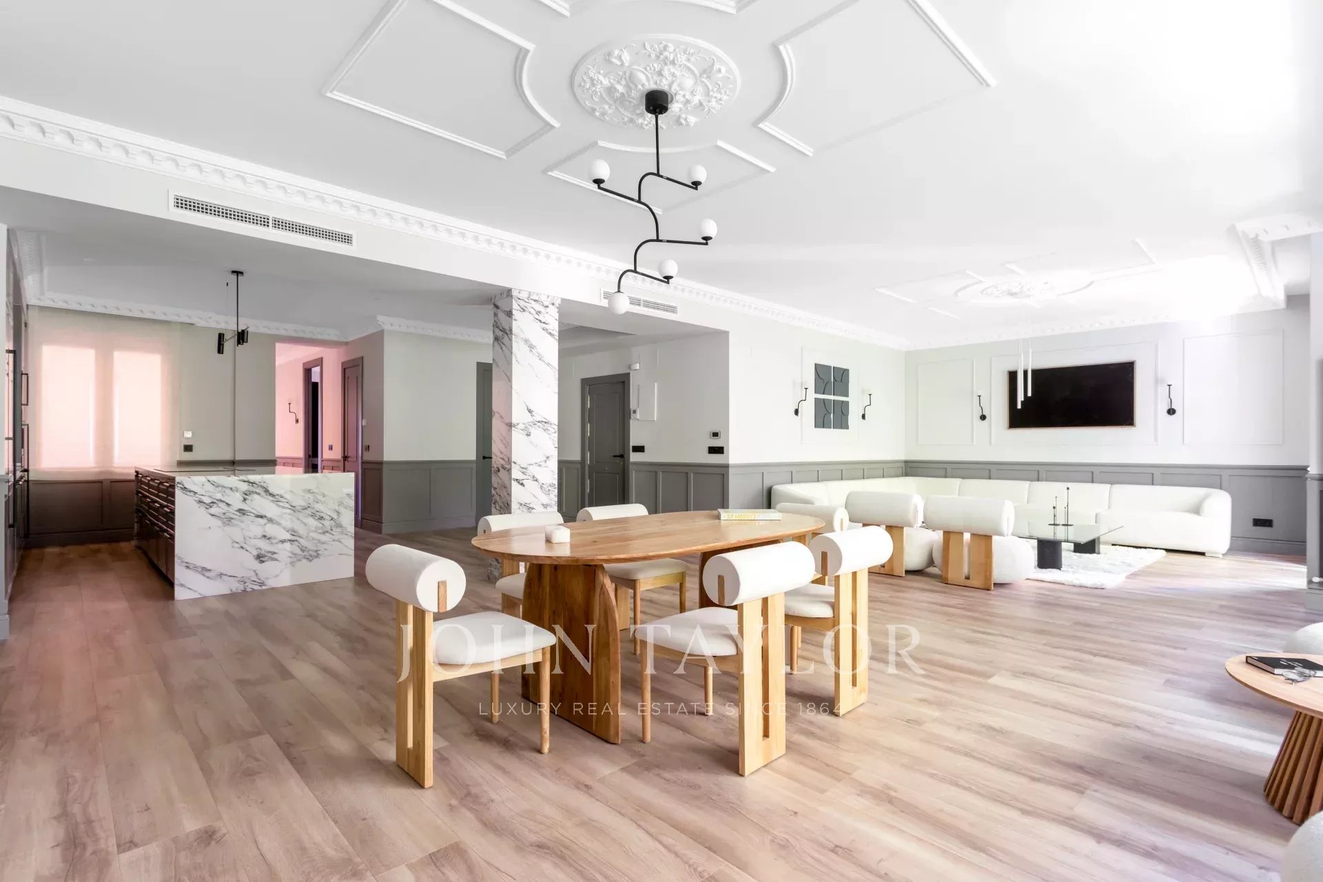 Das große Wohn-Esszimmer mit mehreren Zimmern genießt dank der großen Fenster ein angenehmes natürliches Licht. Offen zum Wohnzimmer finden wir die geräumige Küche mit ihrer großen zentralen Insel und ausgestattet mit hochwertigen Geräten.