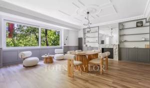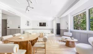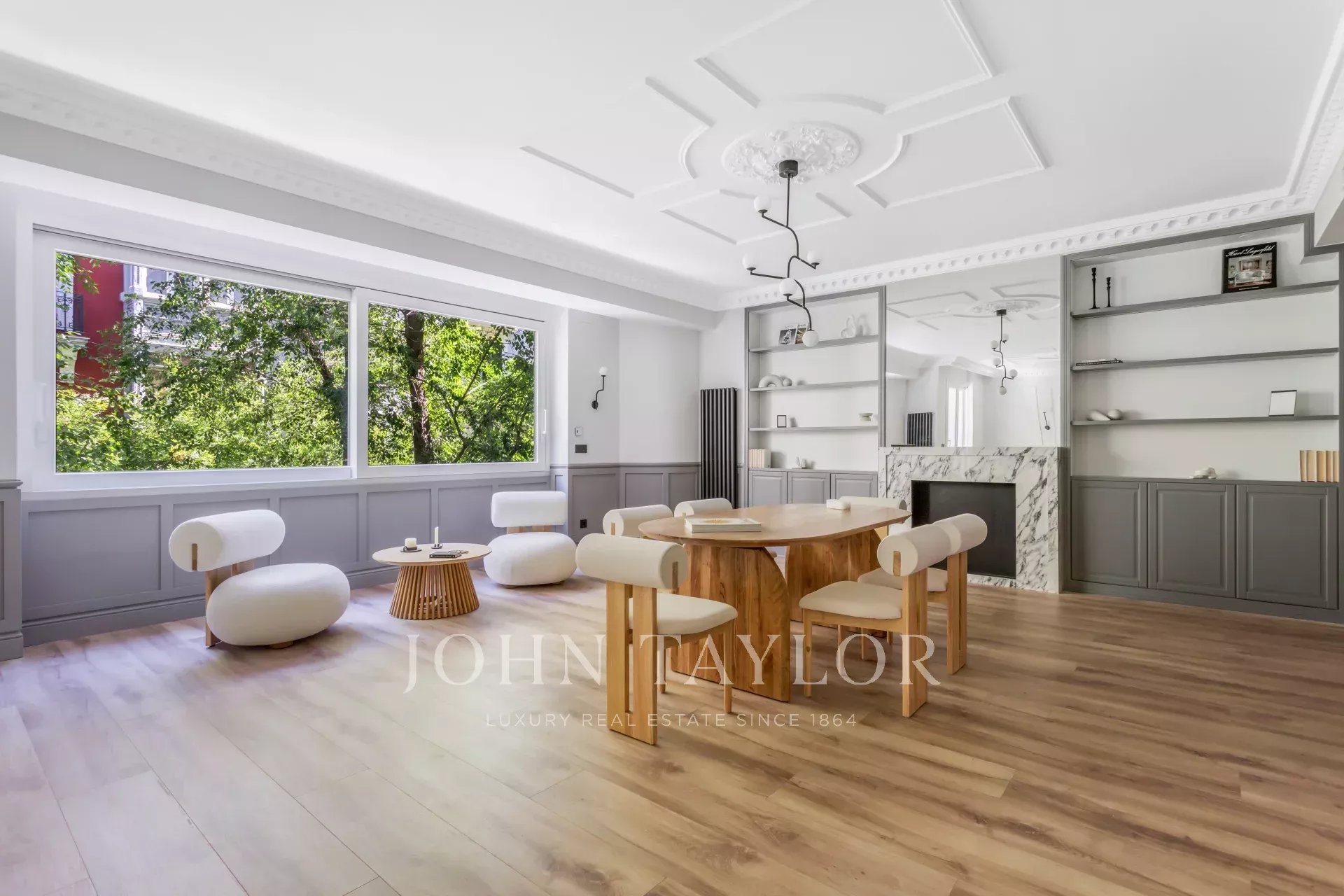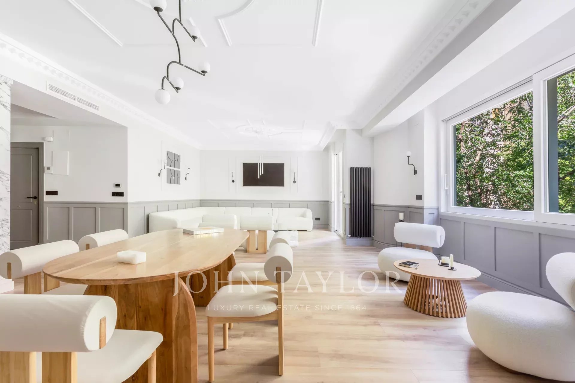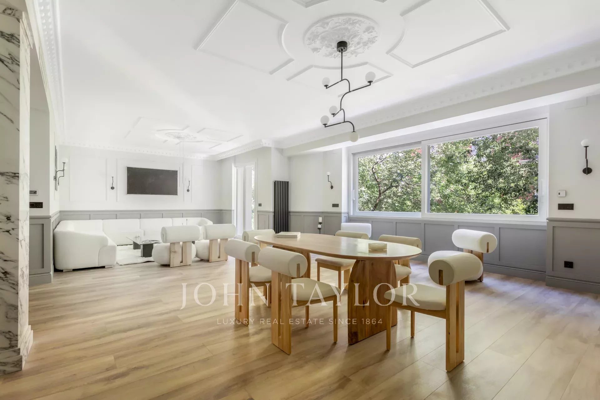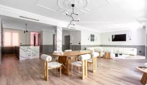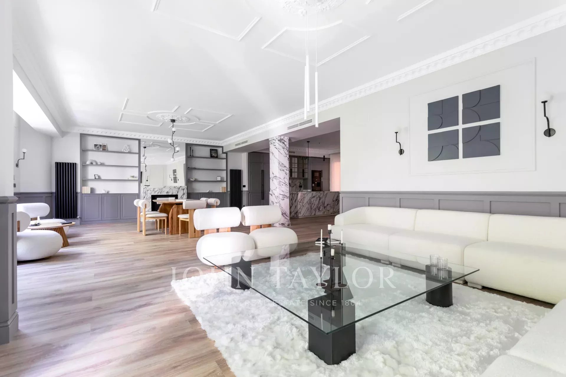 Das große Wohn-Esszimmer mit mehreren Zimmern genießt dank der großen Fenster ein angenehmes natürliches Licht. Offen zum Wohnzimmer finden wir die geräumige Küche mit ihrer großen zentralen Insel und ausgestattet mit hochwertigen Geräten.