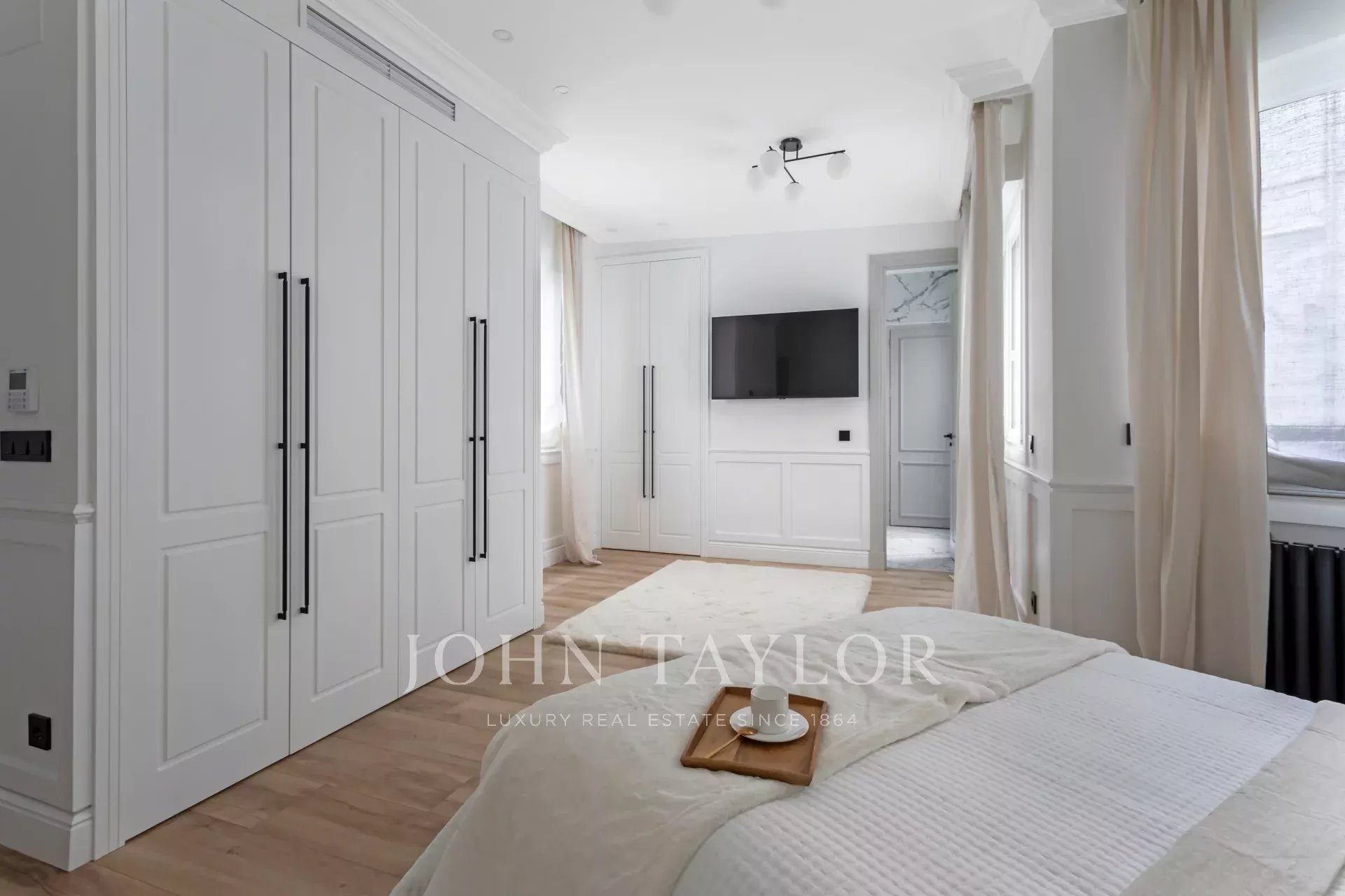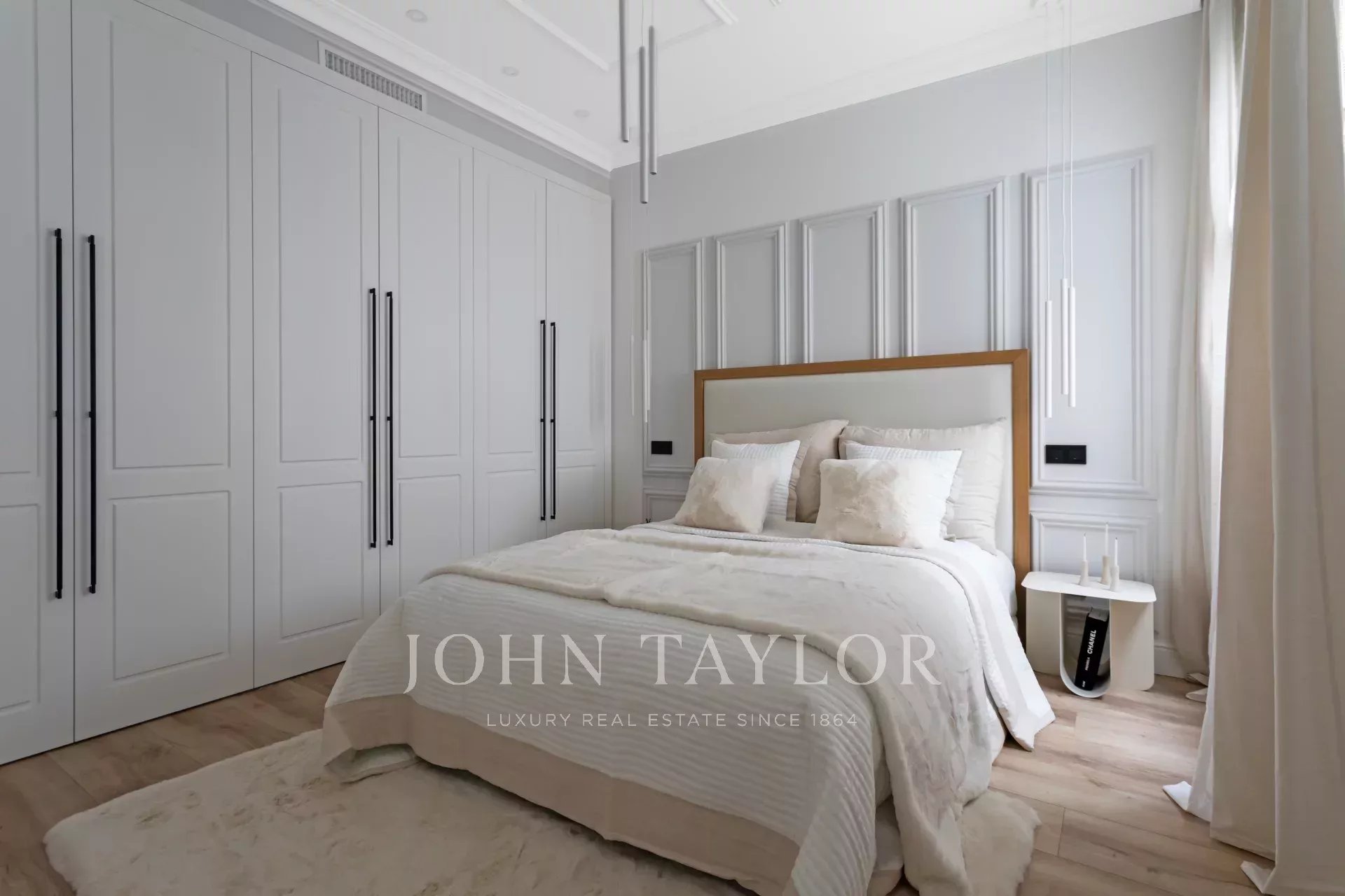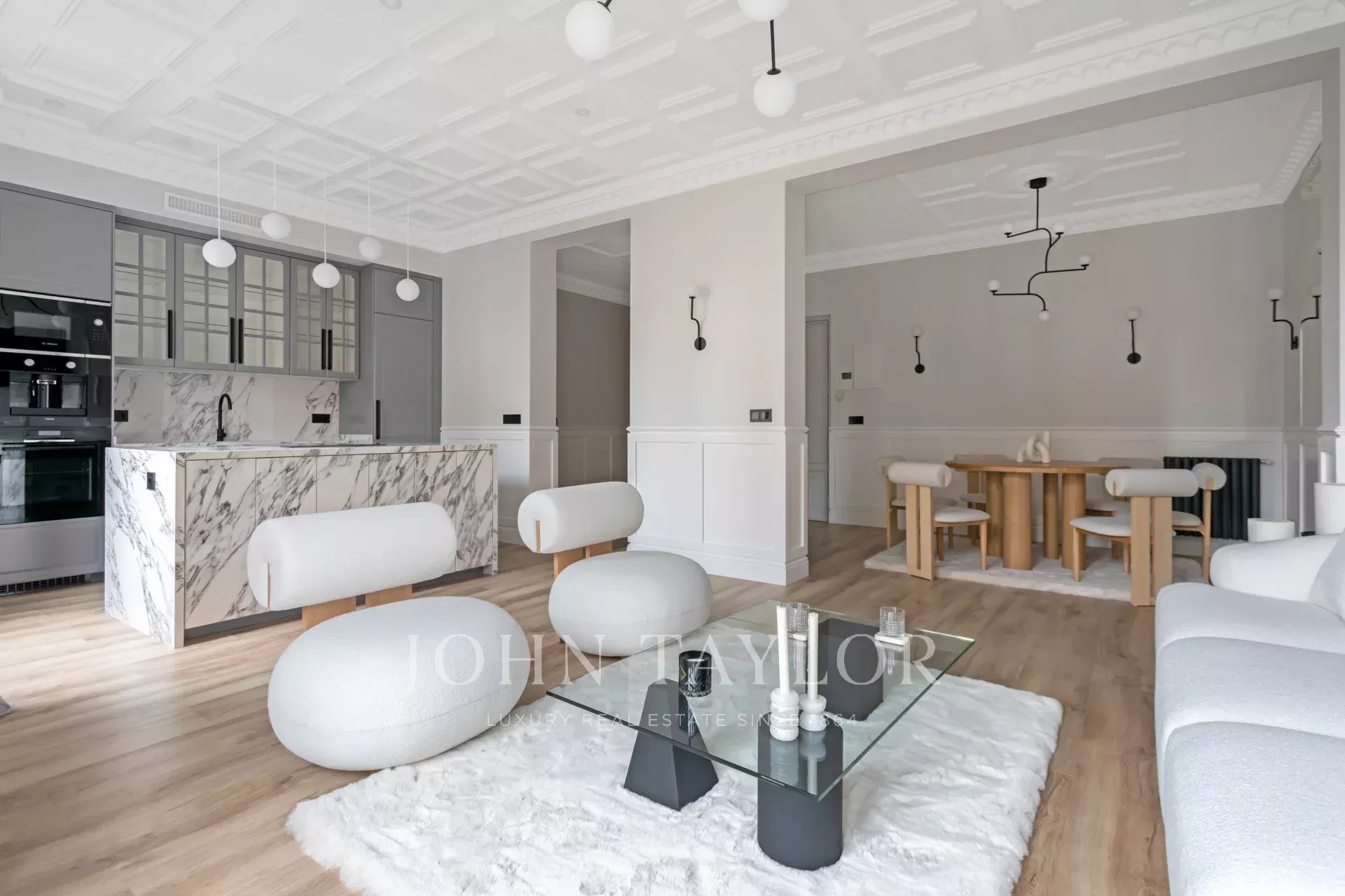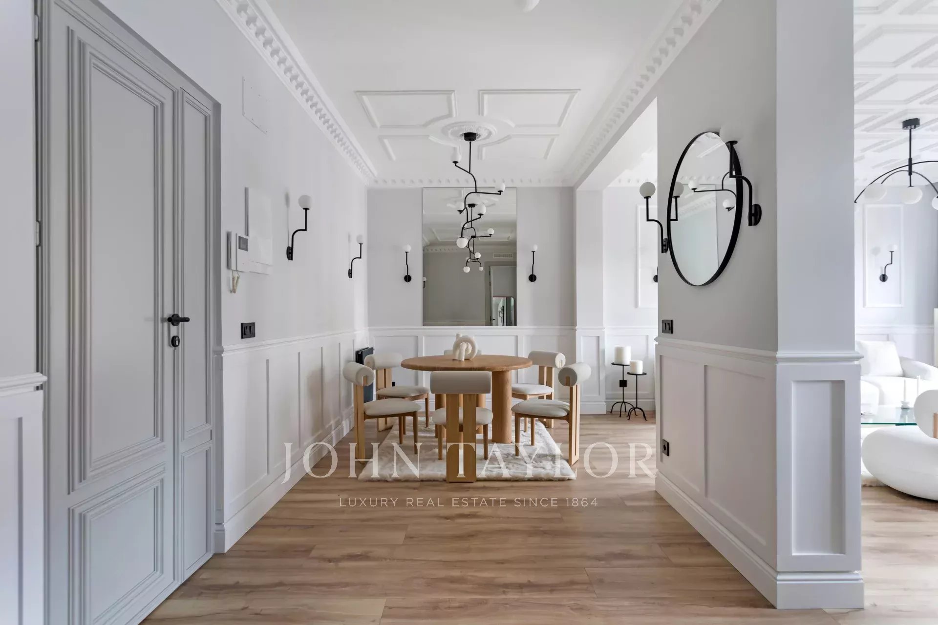 Eine neu renovierte Wohnung im fünften Stock eines schönen Gebäudes mit klassischer Fassade.
