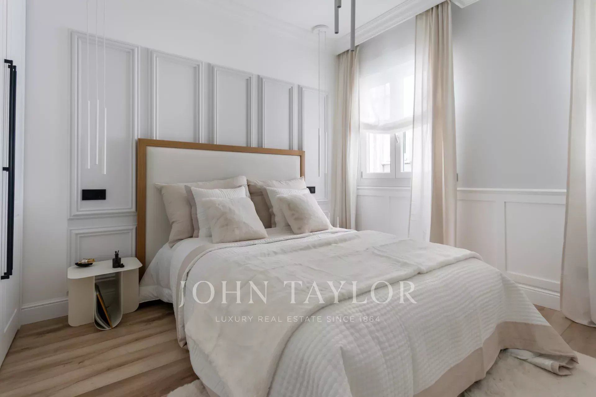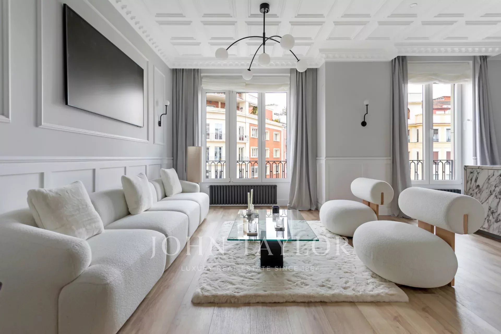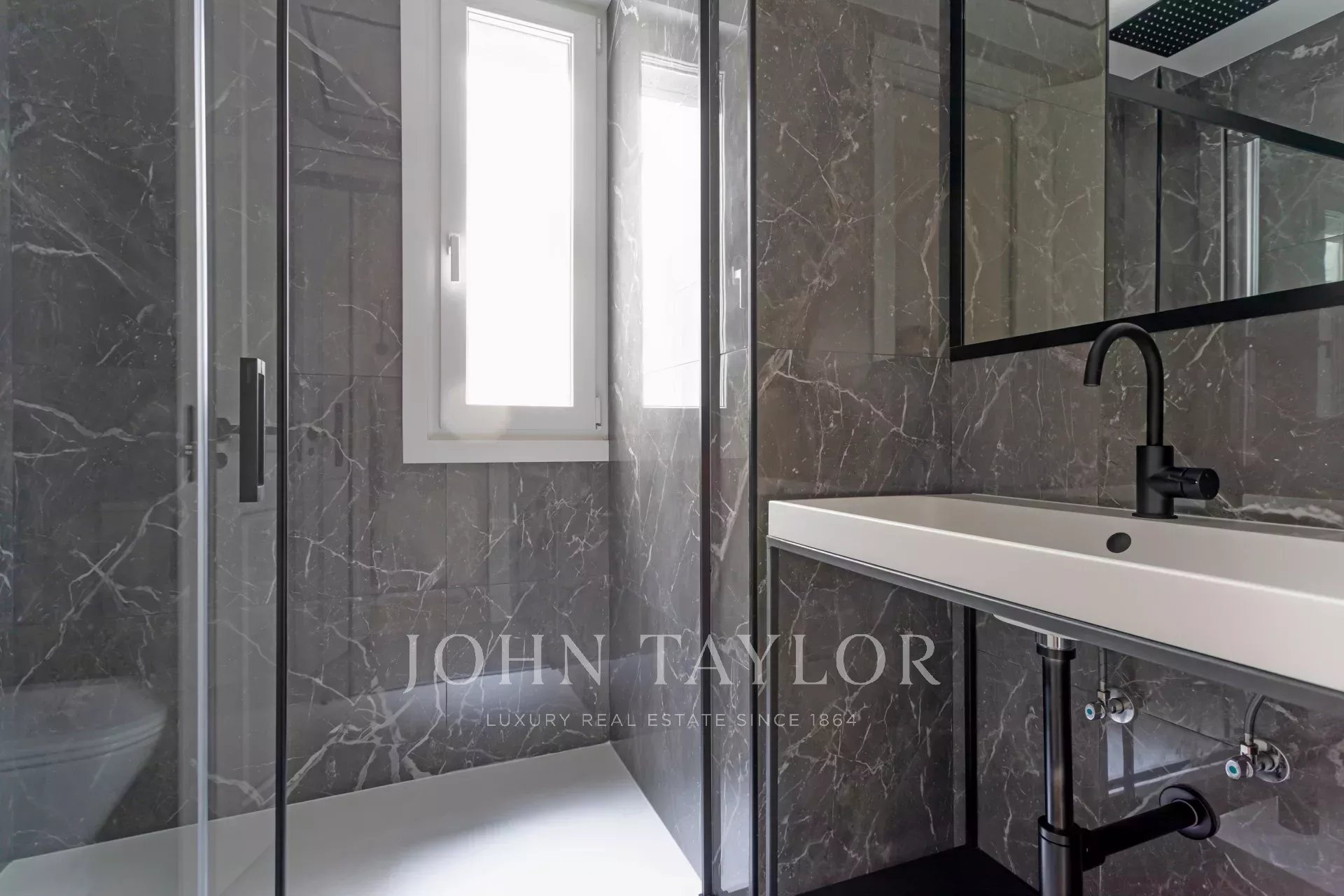 Eine neu renovierte Wohnung im fünften Stock eines schönen Gebäudes mit klassischer Fassade.