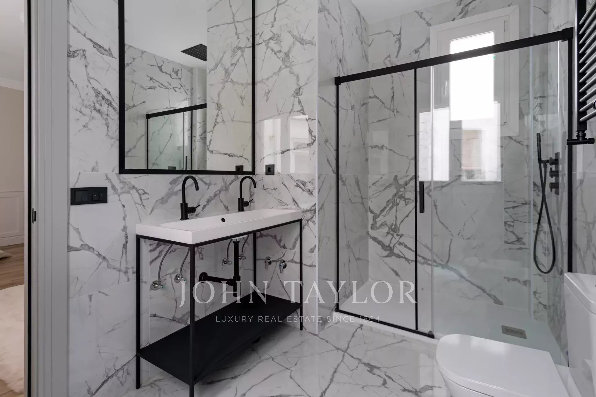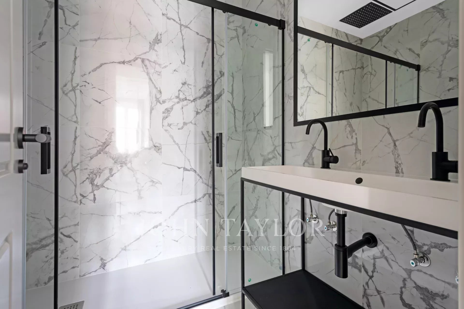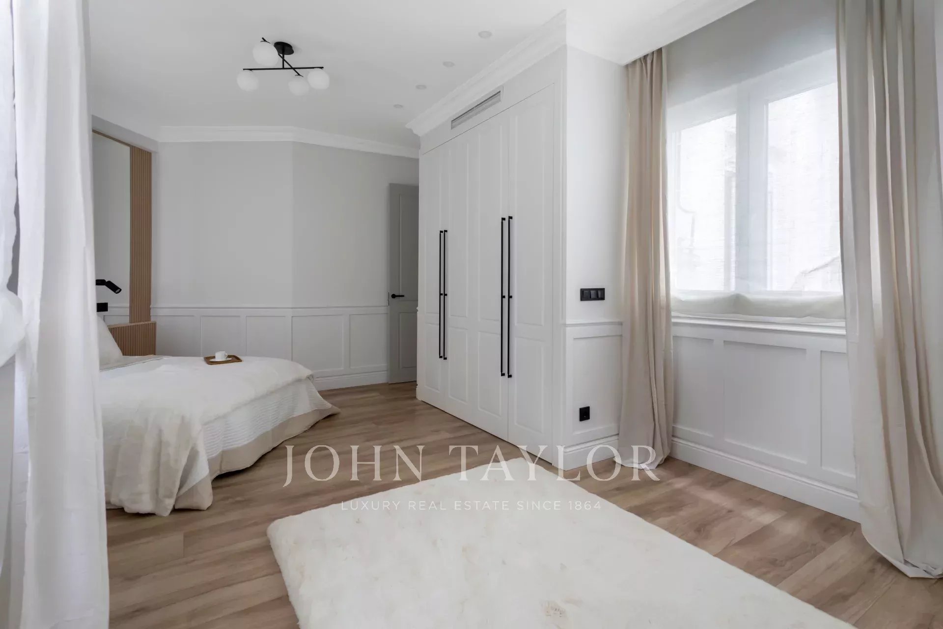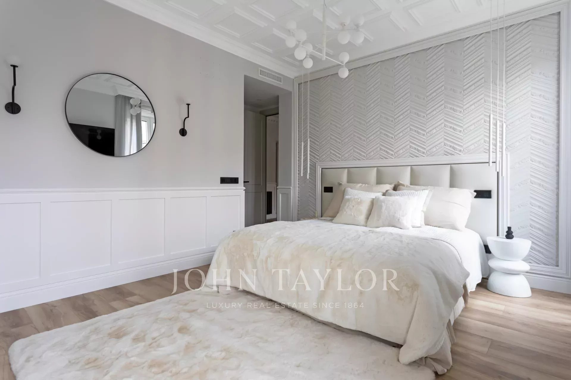Eine neu renovierte Wohnung im fünften Stock eines schönen Gebäudes mit klassischer Fassade.