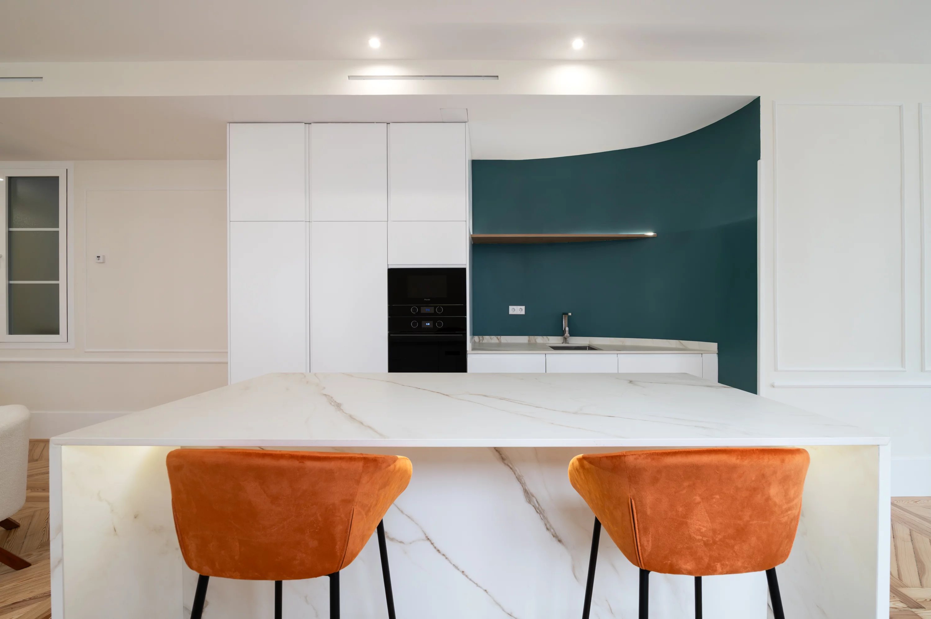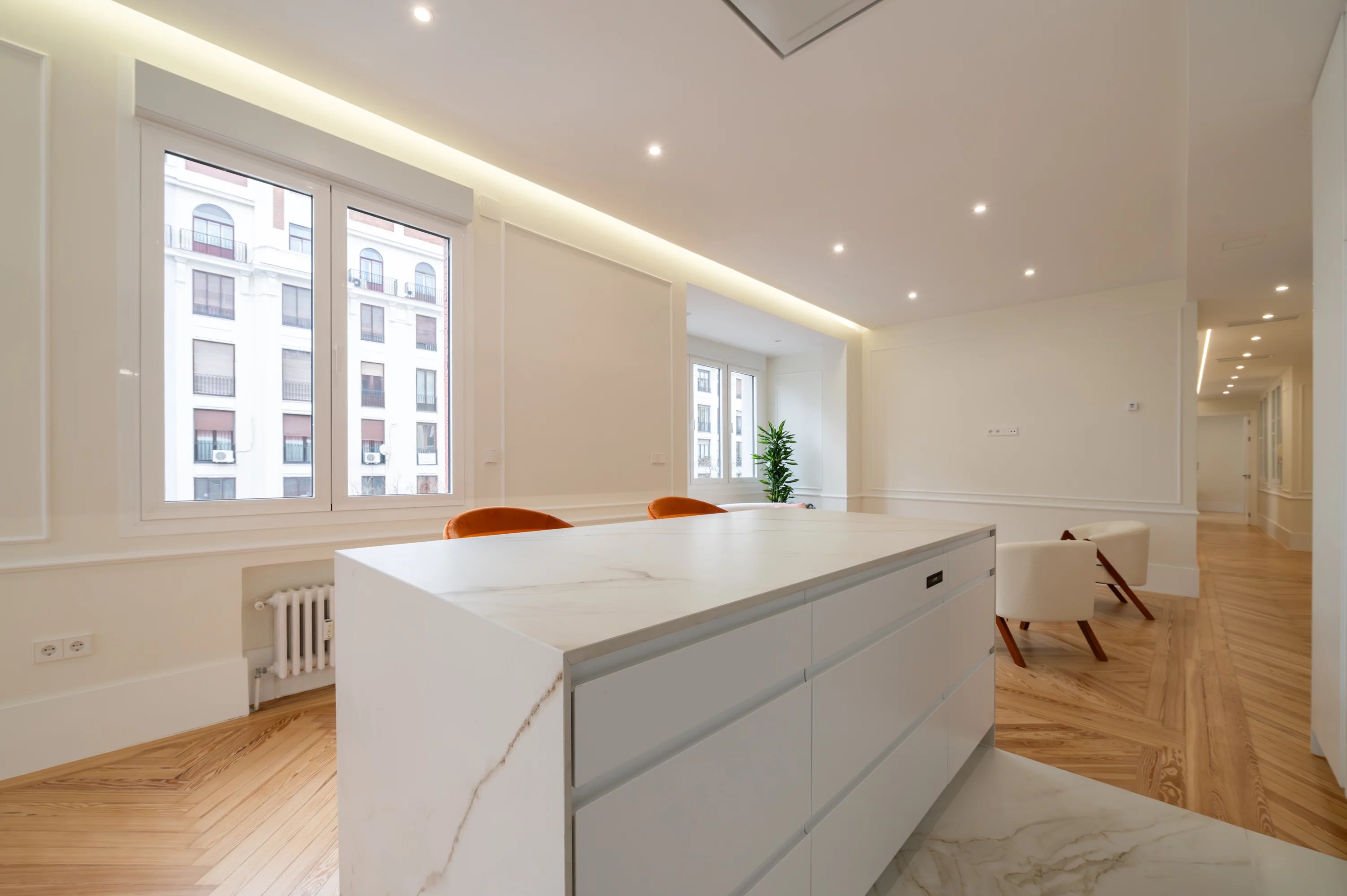 Das Hauptwohnzimmer, geräumig und hell, wird zum idealen Ort, um die städtische Aussicht und die Dynamik Madrids zu genießen, während die voll ausgestattete Küche einen praktischen und eleganten Raum für den Alltag bietet.