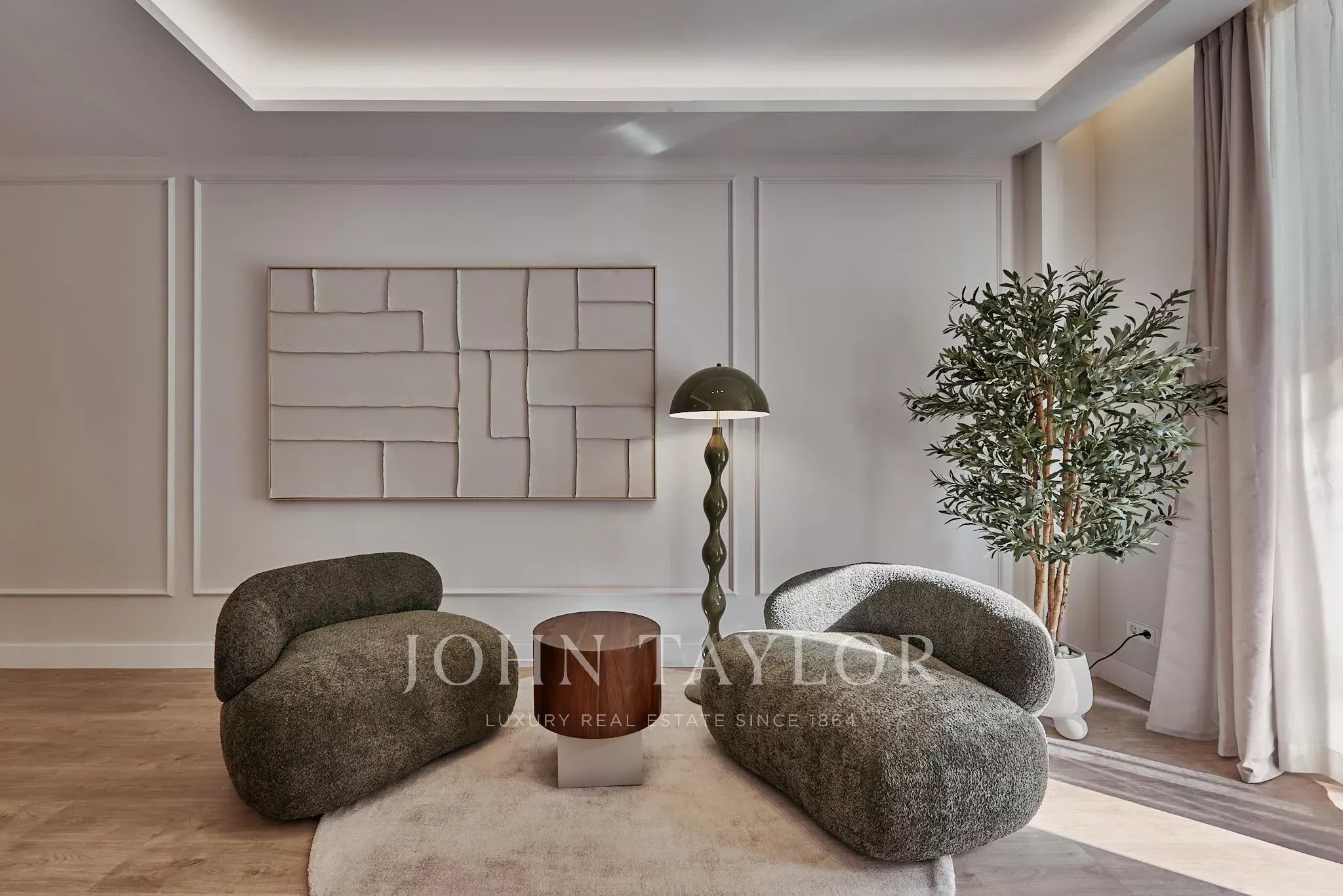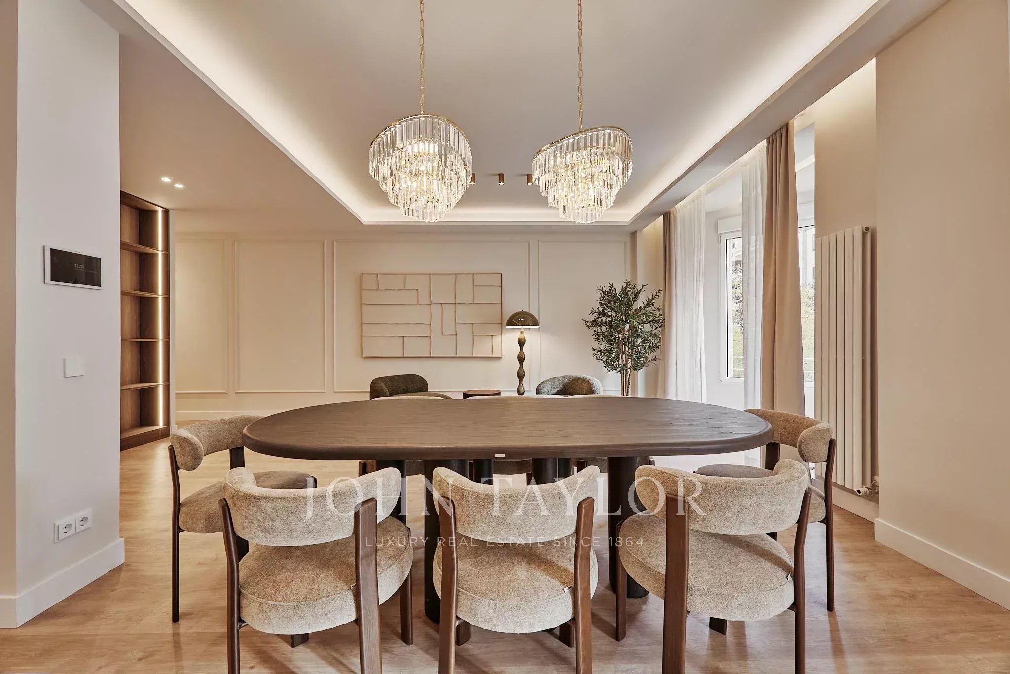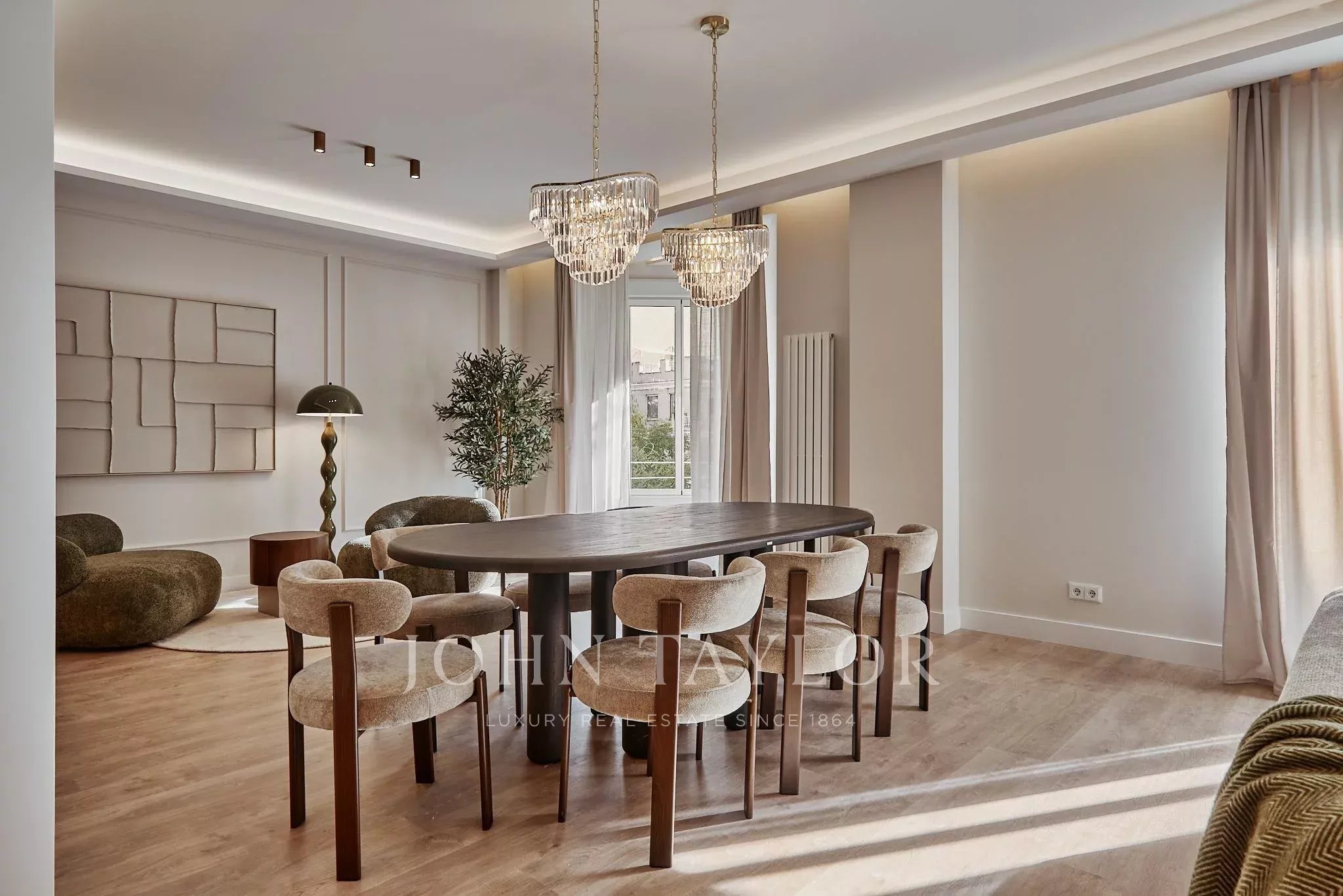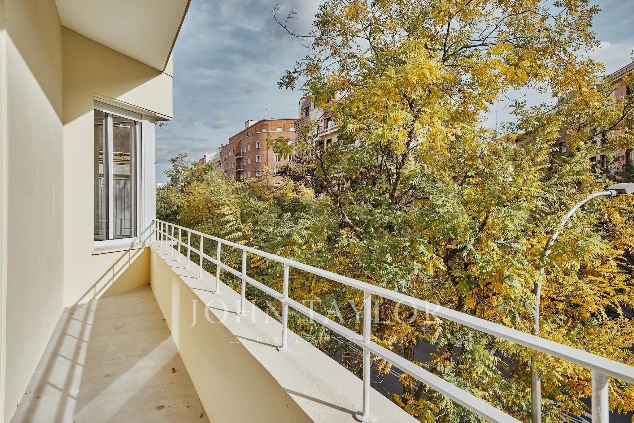 In der zweiten Obergeschosslage eines Hauses mit Aufzug gelegen, zeichnet sich die Wohnung durch ihre großzügige Raumgröße und ihren repräsentativen Charakter in einer der ikonischsten Straßen der Hauptstadt aus. Sie wurde sorgfältig modernisiert, mit einem zeitgenössischen Ansatz, der die Fließfähigkeit der Räume und den Komfort in jedem Raum betont.