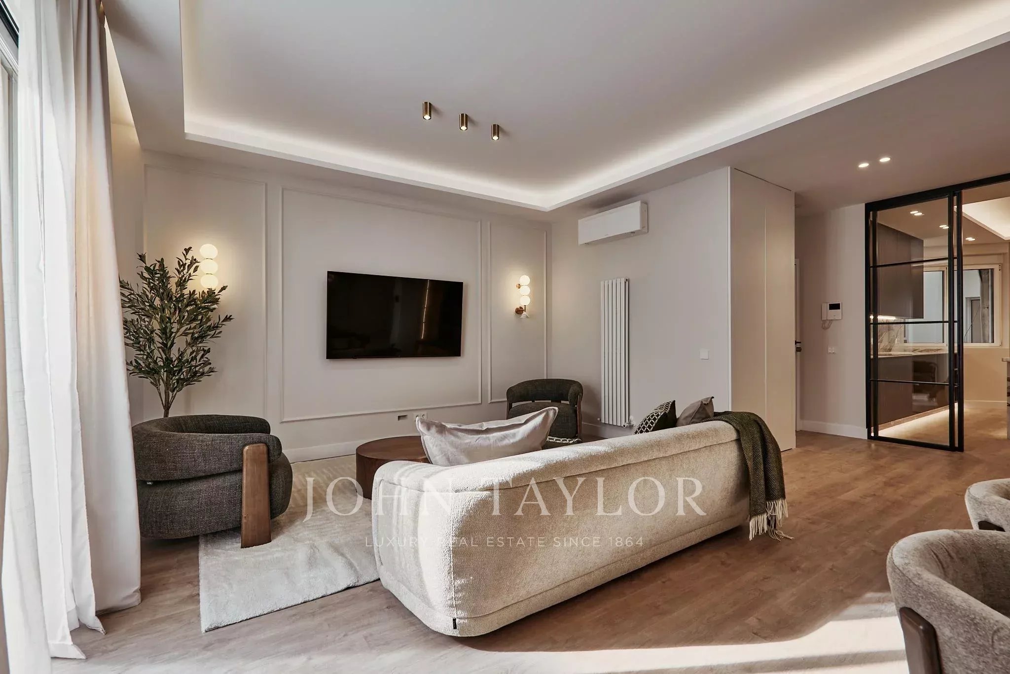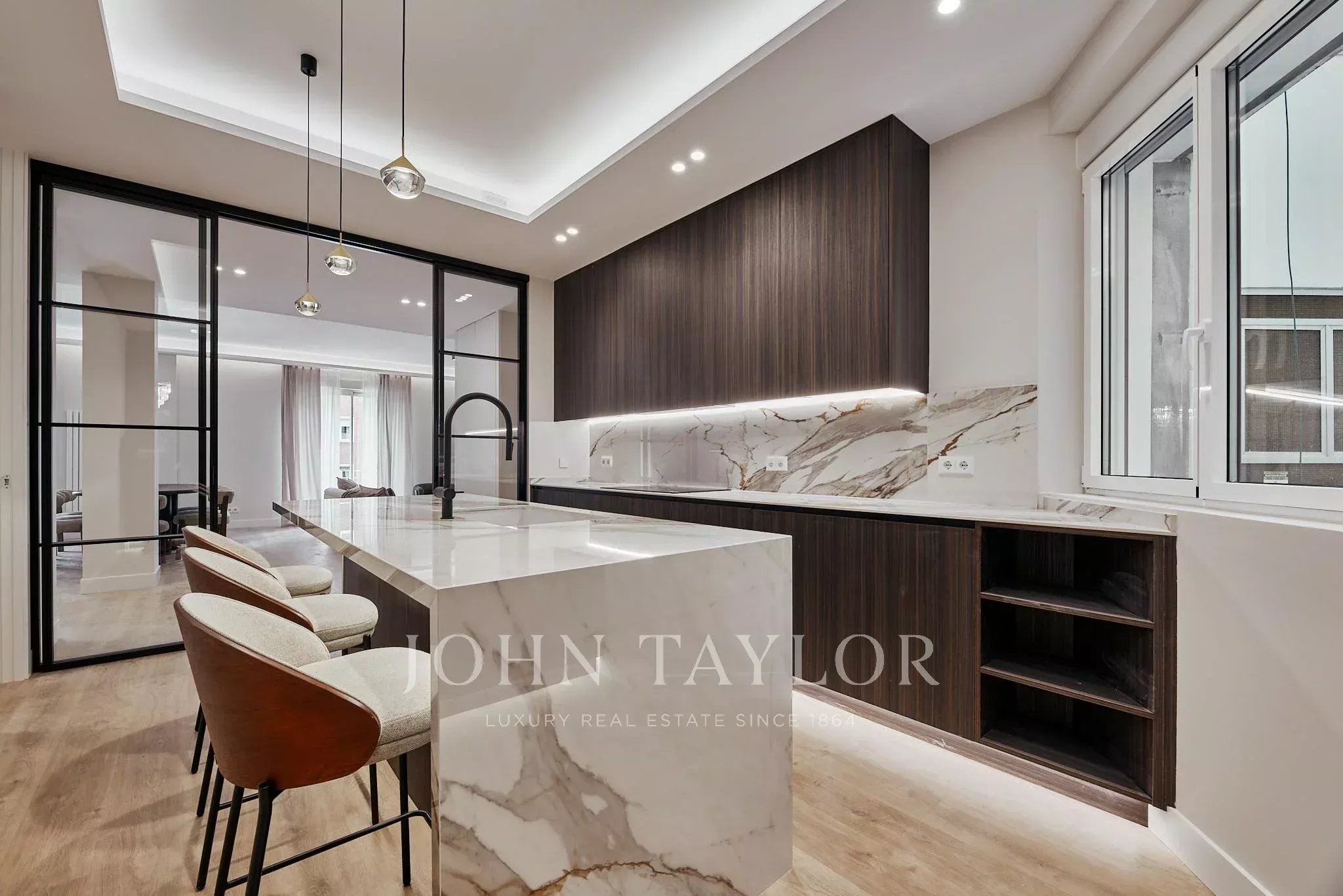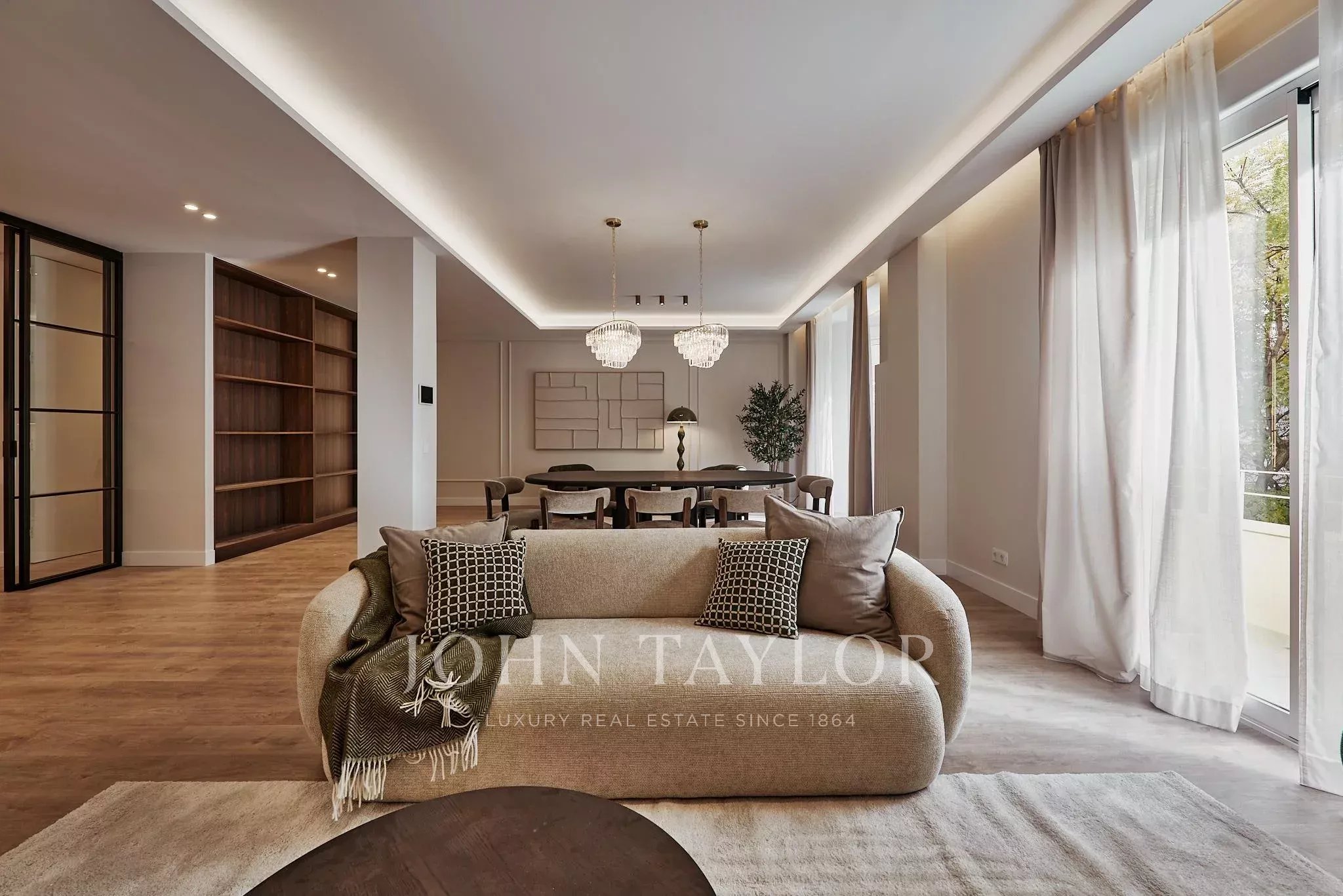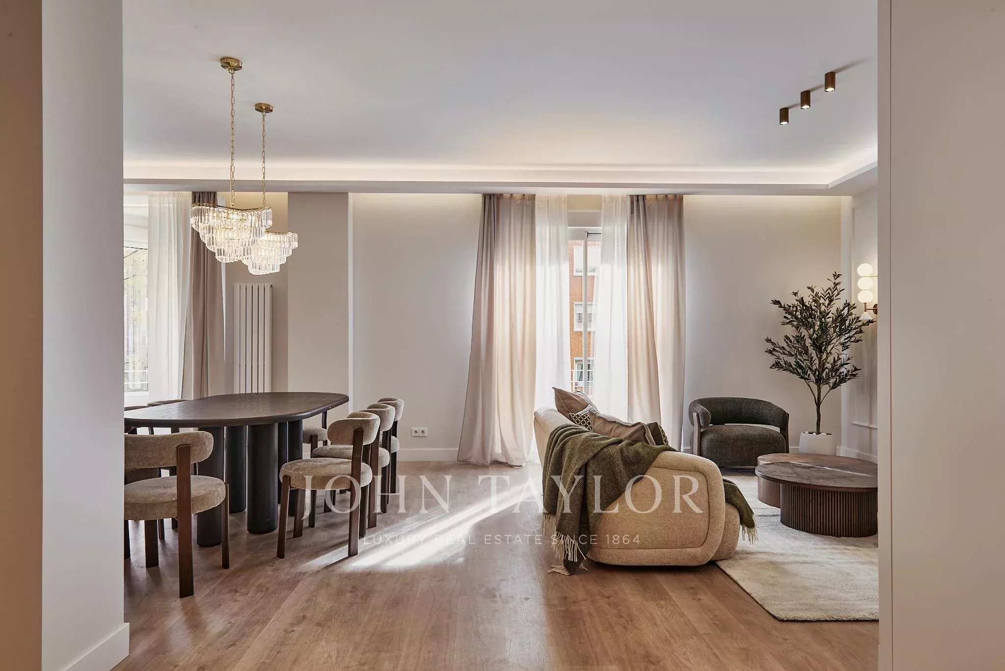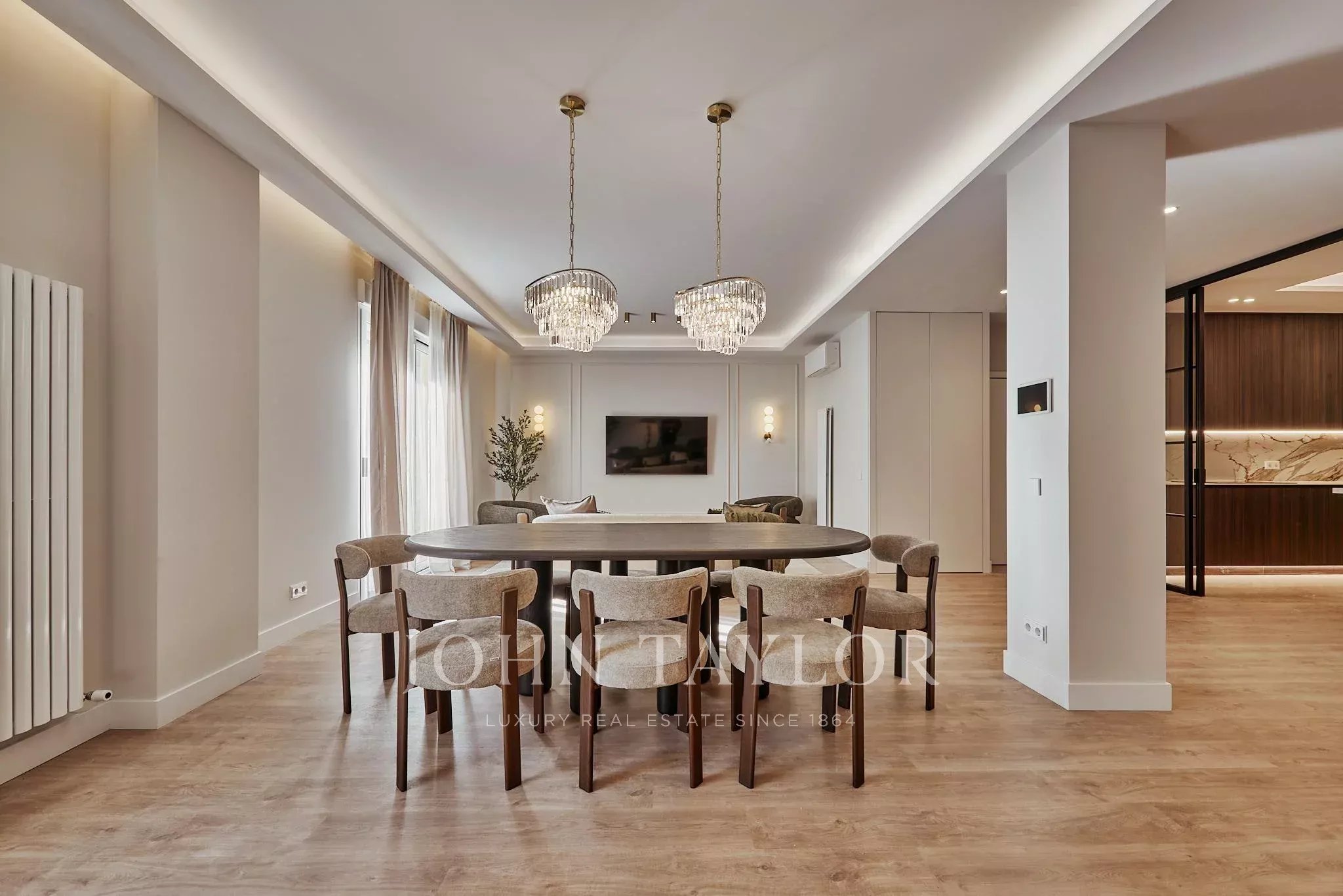 In der zweiten Obergeschosslage eines Hauses mit Aufzug gelegen, zeichnet sich die Wohnung durch ihre großzügige Raumgröße und ihren repräsentativen Charakter in einer der ikonischsten Straßen der Hauptstadt aus. Sie wurde sorgfältig modernisiert, mit einem zeitgenössischen Ansatz, der die Fließfähigkeit der Räume und den Komfort in jedem Raum betont.