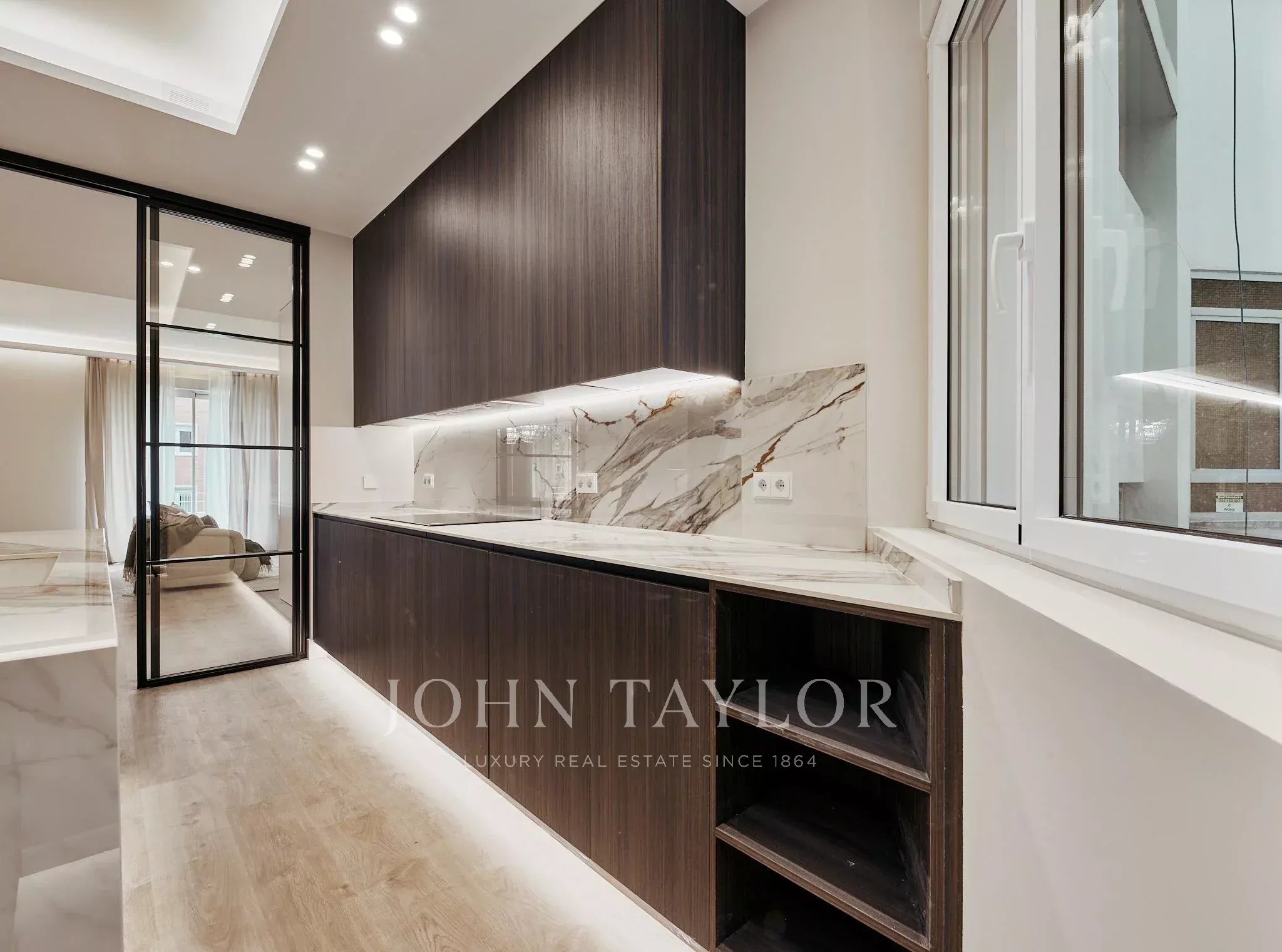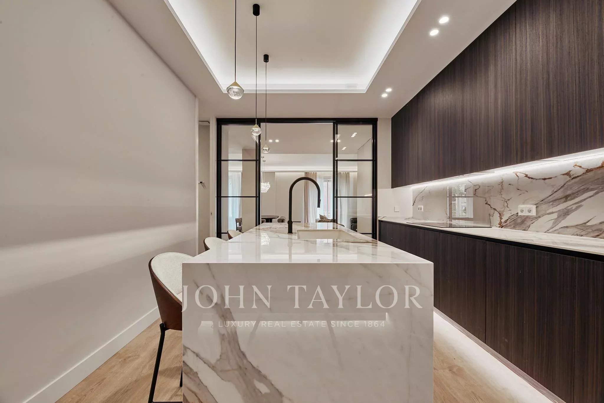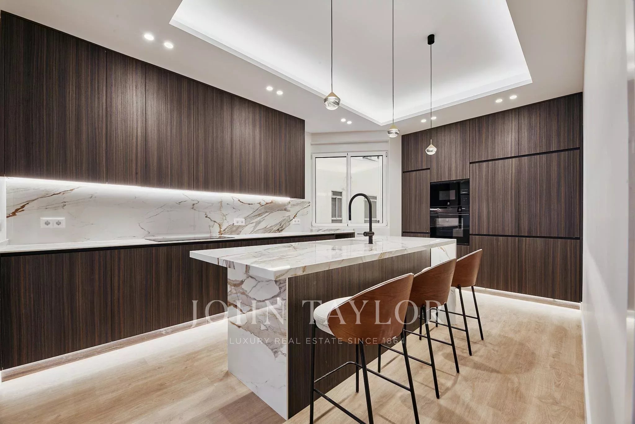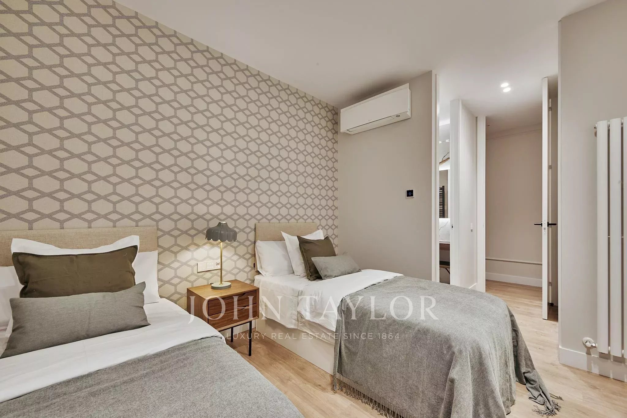 In der zweiten Obergeschosslage eines Hauses mit Aufzug gelegen, zeichnet sich die Wohnung durch ihre großzügige Raumgröße und ihren repräsentativen Charakter in einer der ikonischsten Straßen der Hauptstadt aus. Sie wurde sorgfältig modernisiert, mit einem zeitgenössischen Ansatz, der die Fließfähigkeit der Räume und den Komfort in jedem Raum betont.