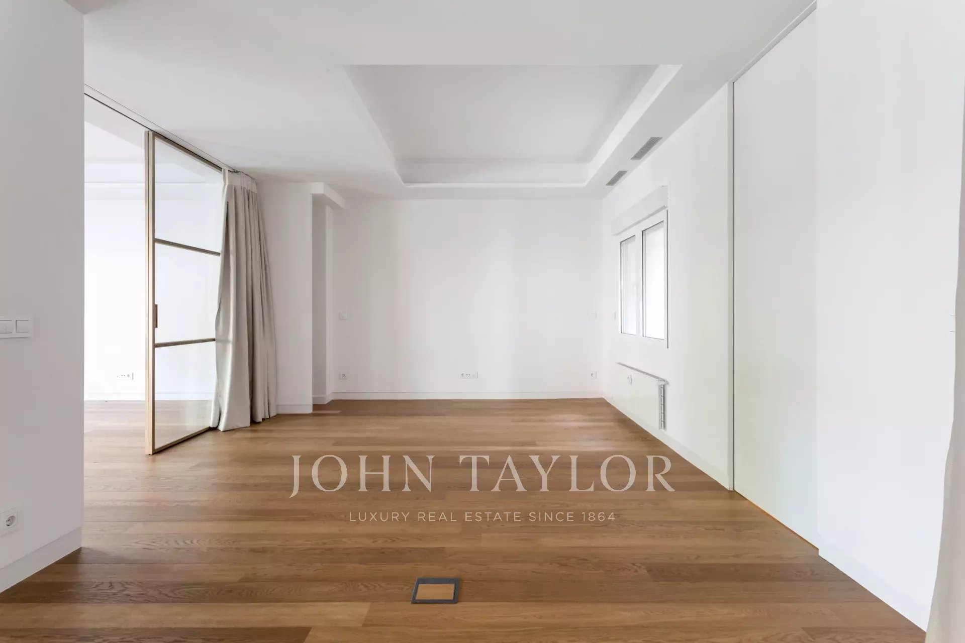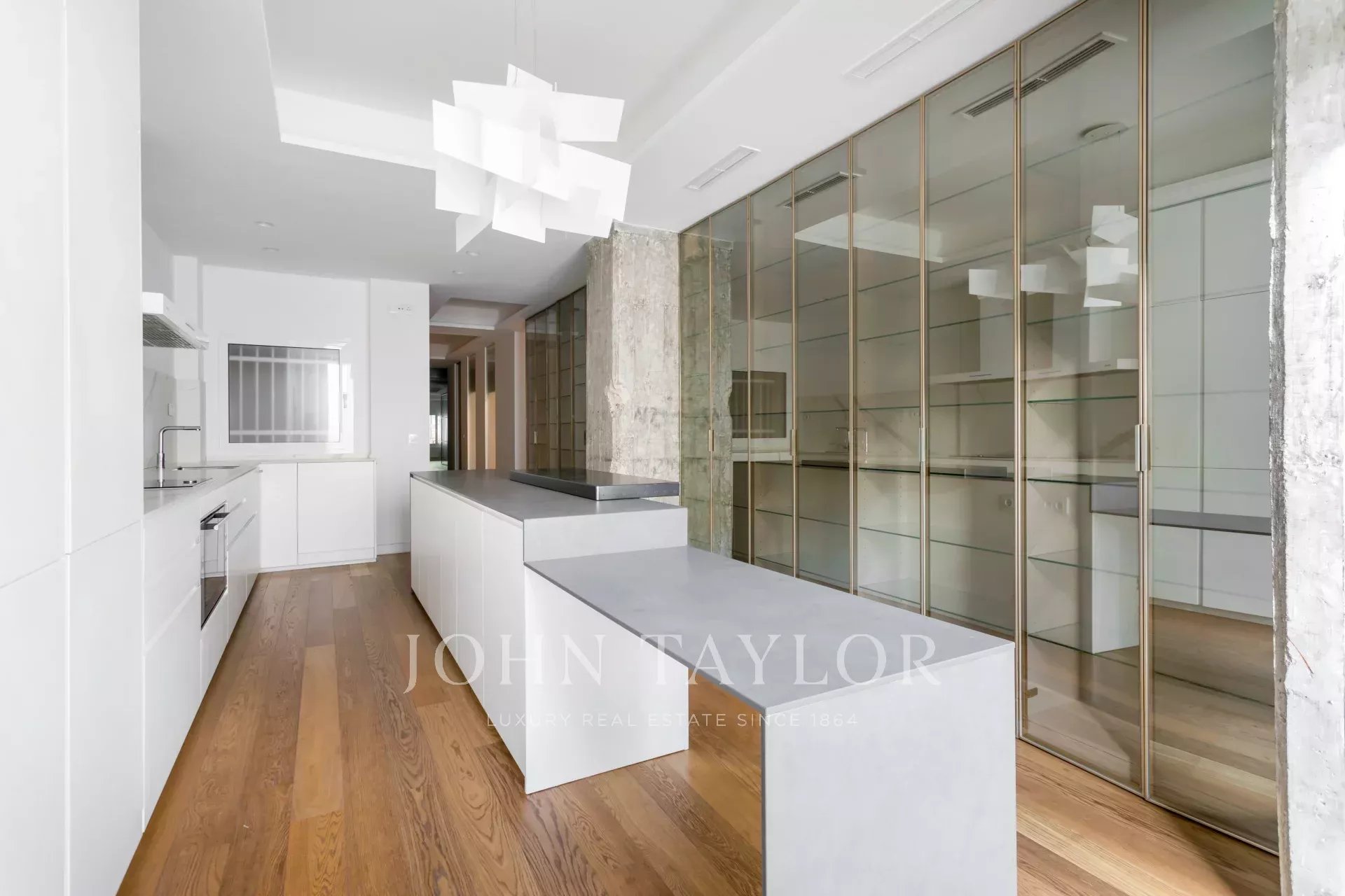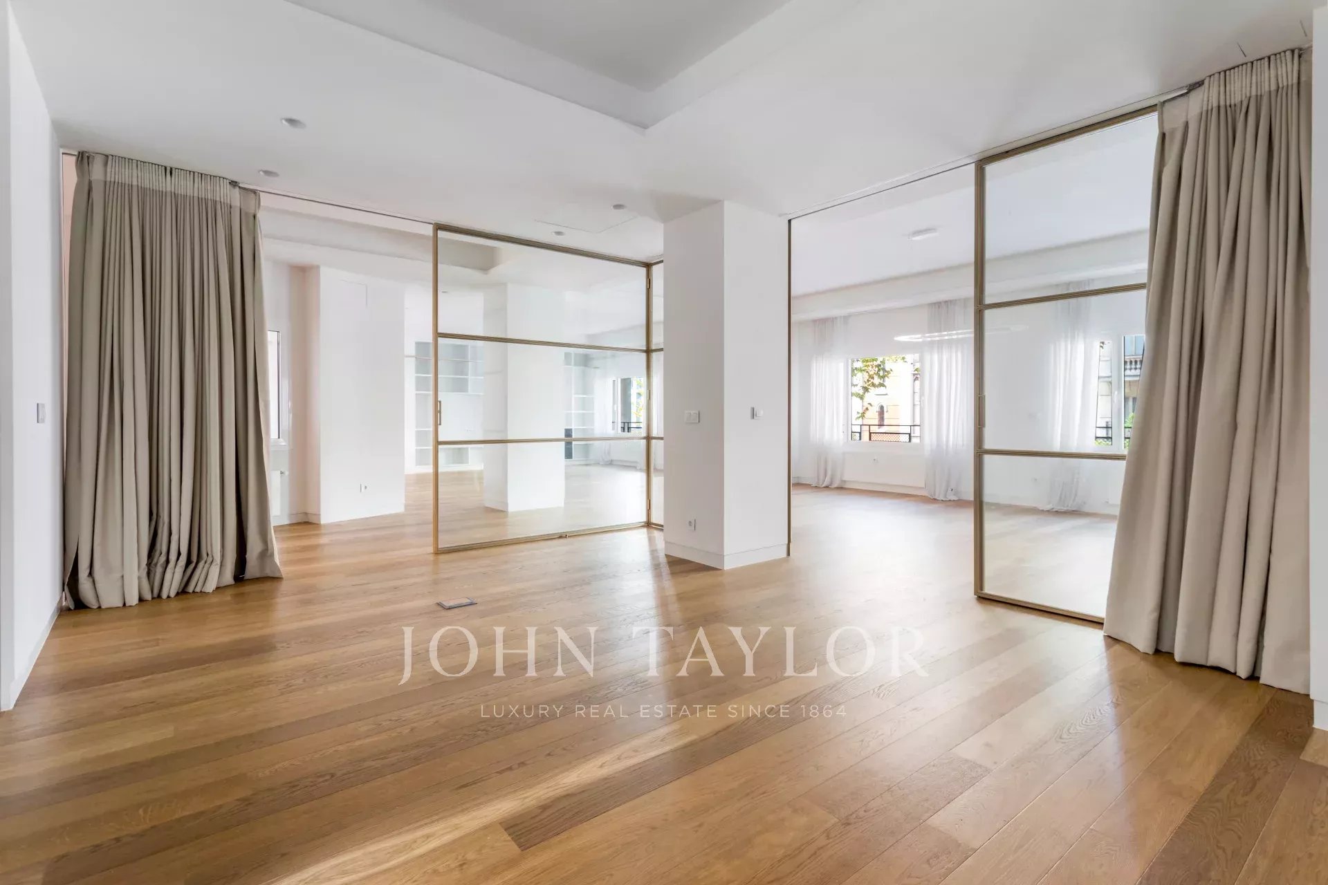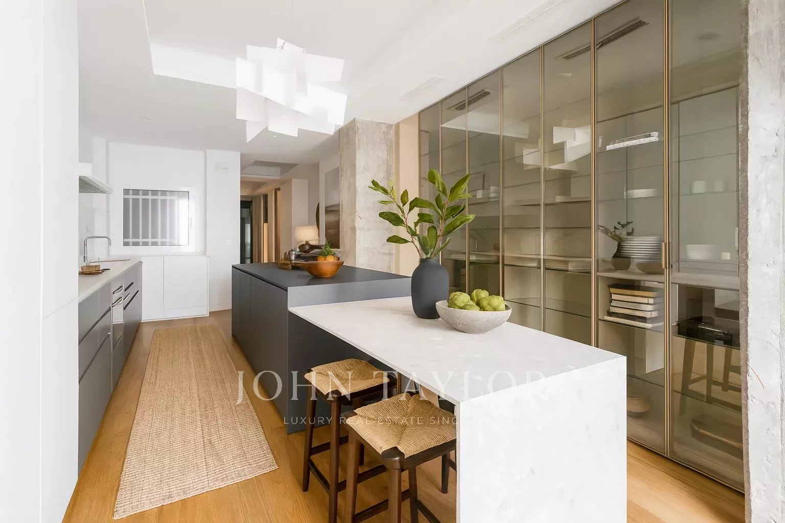Die Wohnung verfügt über ein großes Wohnzimmer mit Blick auf die Straße, 4 Schlafzimmer, alle mit eigenem Bad, und ein Gästebad. Die Küche ist voll ausgestattet mit Top-Markengeräten, einer großen Insel und einem Weinkeller.