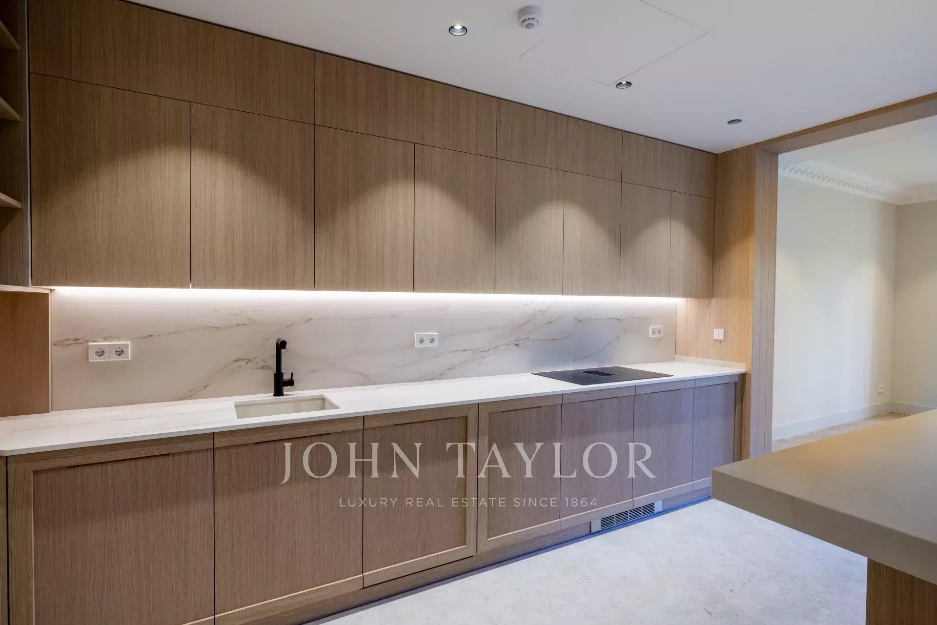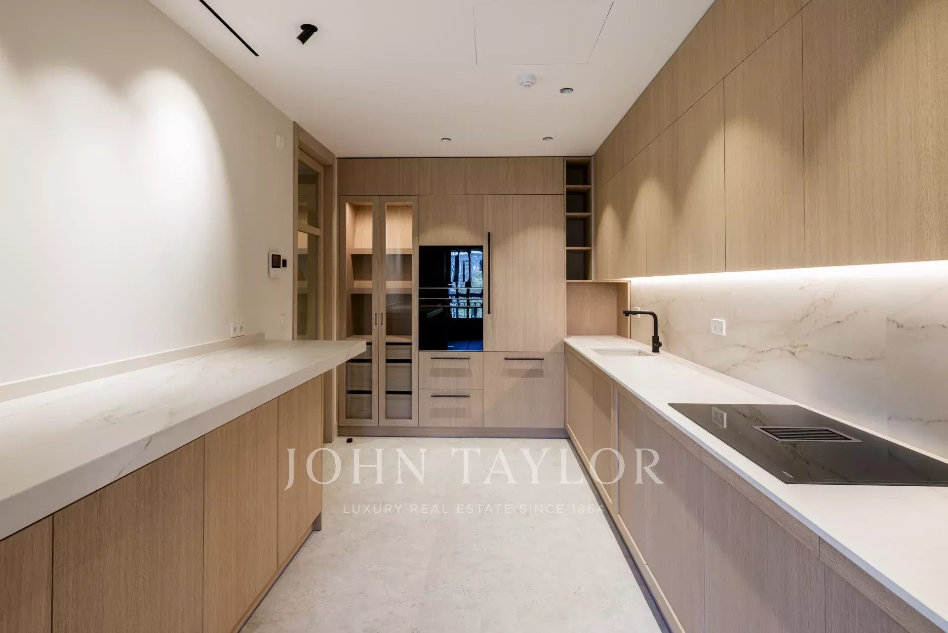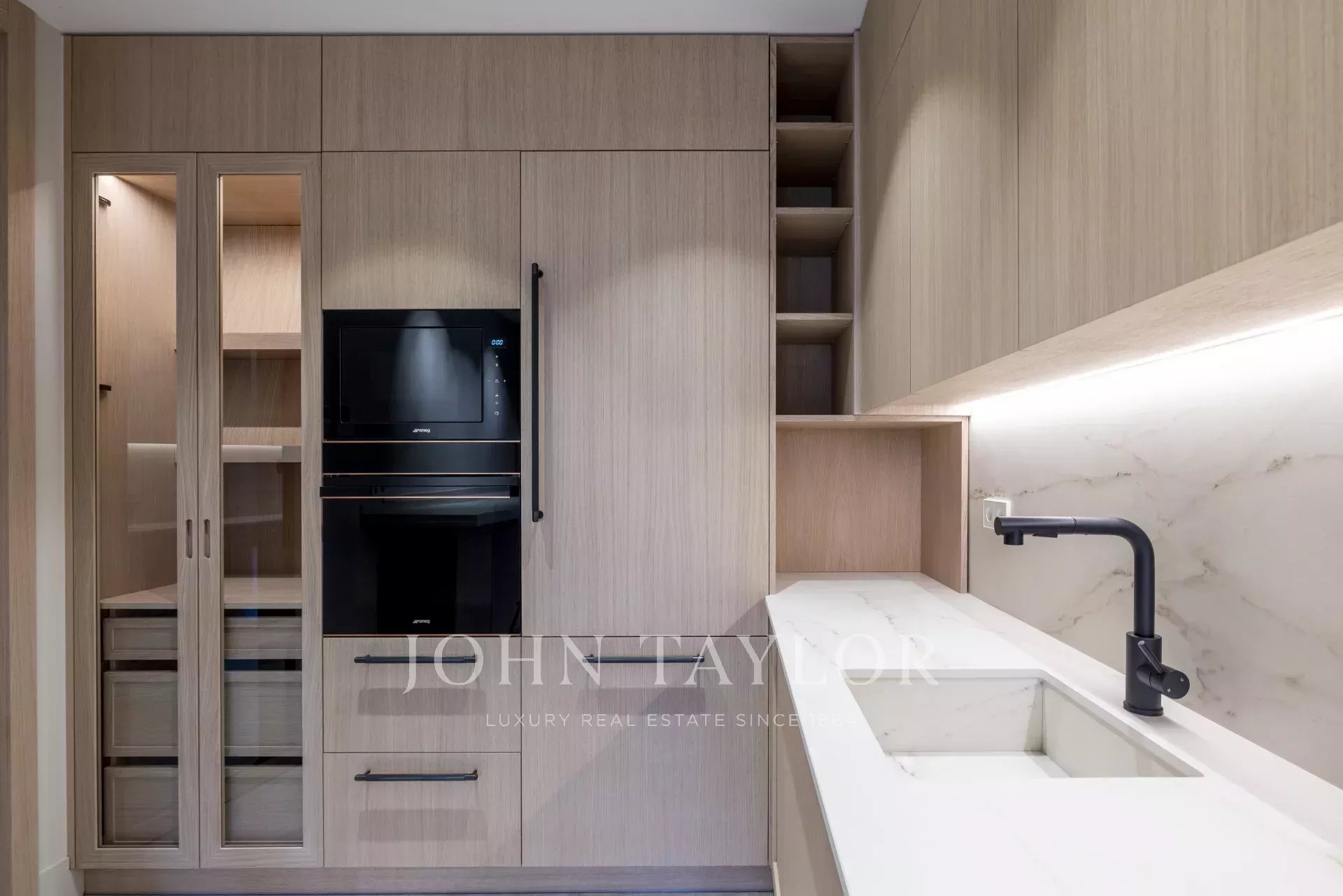 Der Zugang zur Wohnung führt in ein geräumiges Doppel-Wohn-Esszimmer mit einem Bioethanol-Kamin. Die unabhängige Küche ist modern gestaltet und mit SMEG-Geräten ausgestattet. Sie wird durch eine separate Waschküche ergänzt, die als Dienstmädchenzimmer mit Bad genutzt werden kann.
