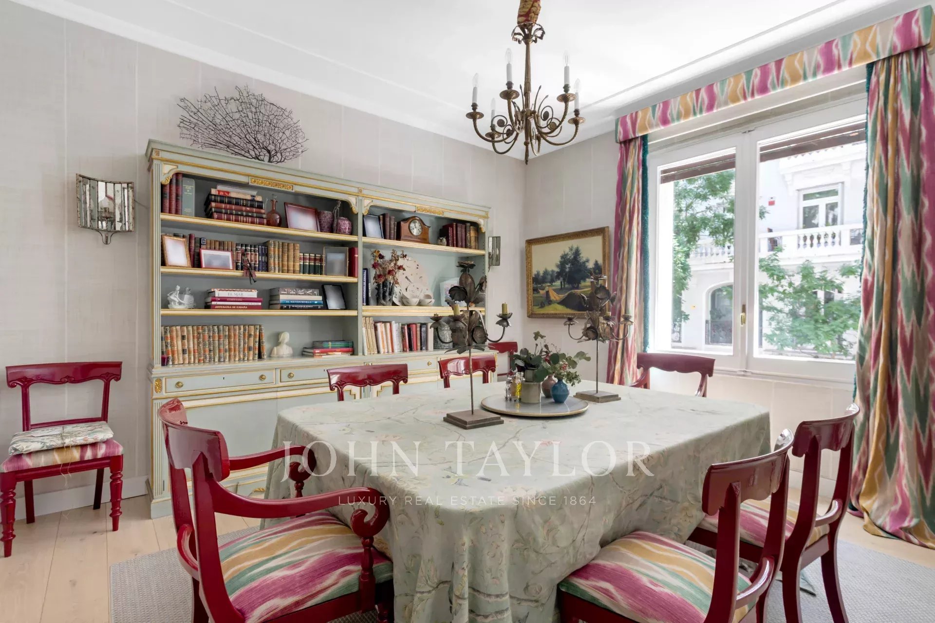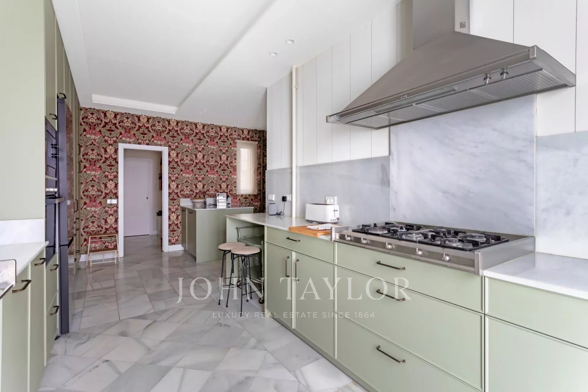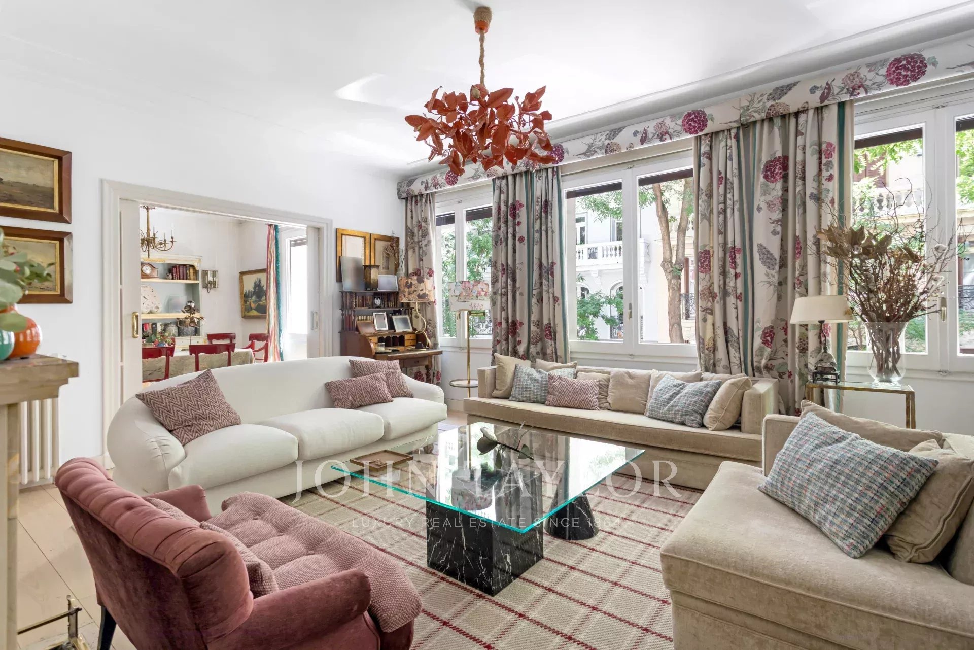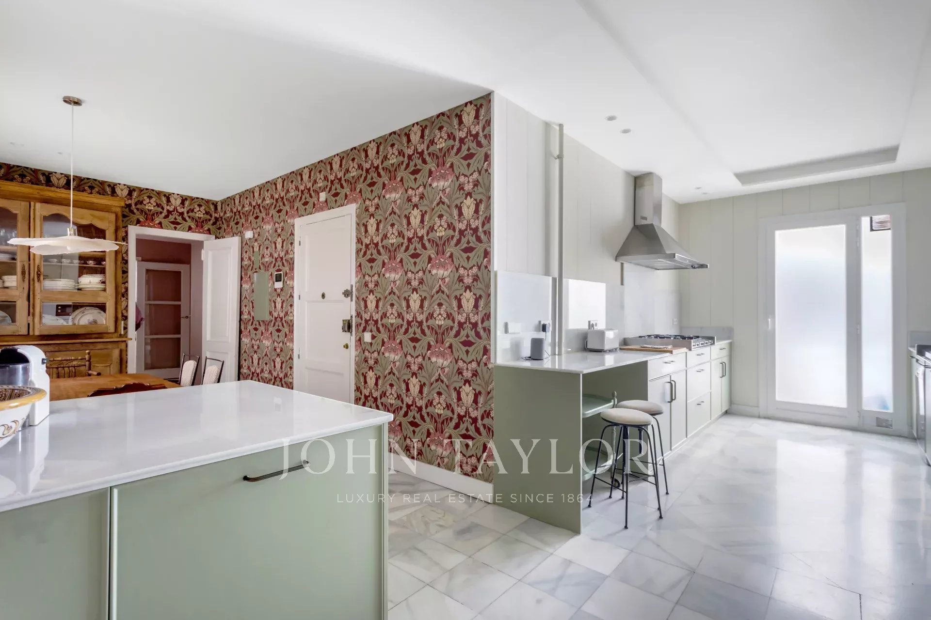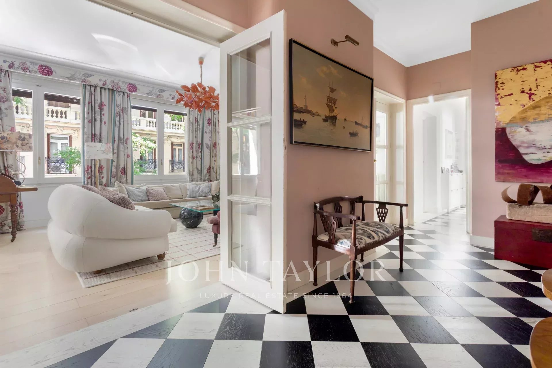 Ein exklusiver Wohnsitz von 305 m² mit einem herrschaftlichen Eingang und einer charaktervollen Eingangshalle, in der Marmor- und Schachbrettböden den eleganten Ton des Hauses vorwegnehmen. Die mittlere Etage, die nach außen und nach Osten ausgerichtet ist, lässt die Wohnräume vom ersten Moment an mit Licht durchfluten, was die großzügigen Proportionen und den Fluss zwischen den Räumen hervorhebt: große repräsentative Salons mit Kamin und Stuck, eine integrierte Bibliothek oder ein Büro und Esszimmer, die sowohl zum Familienleben als auch zum Empfang von Gästen einladen.