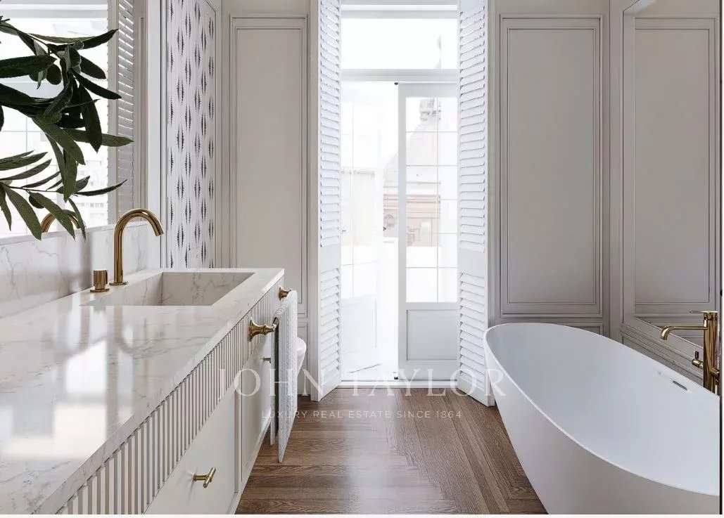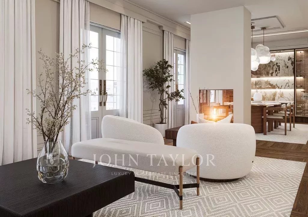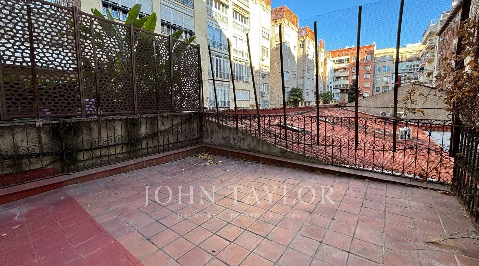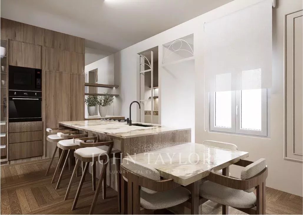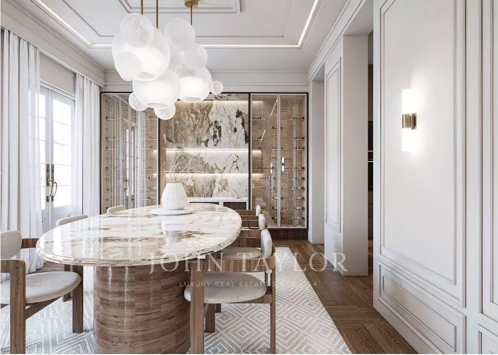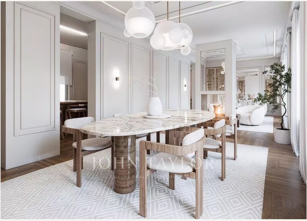 Dank der hohen Decken und großen Fenster ist die Wohnung den ganzen Tag über von natürlichem Licht durchflutet. Sie verfügt über 303 m2 Wohnfläche und eine großzügige 70 m2 große Terrasse, die sich perfekt für den Morgenkaffee, Mahlzeiten in der Sonne oder Mahlzeiten im Freien eignet.