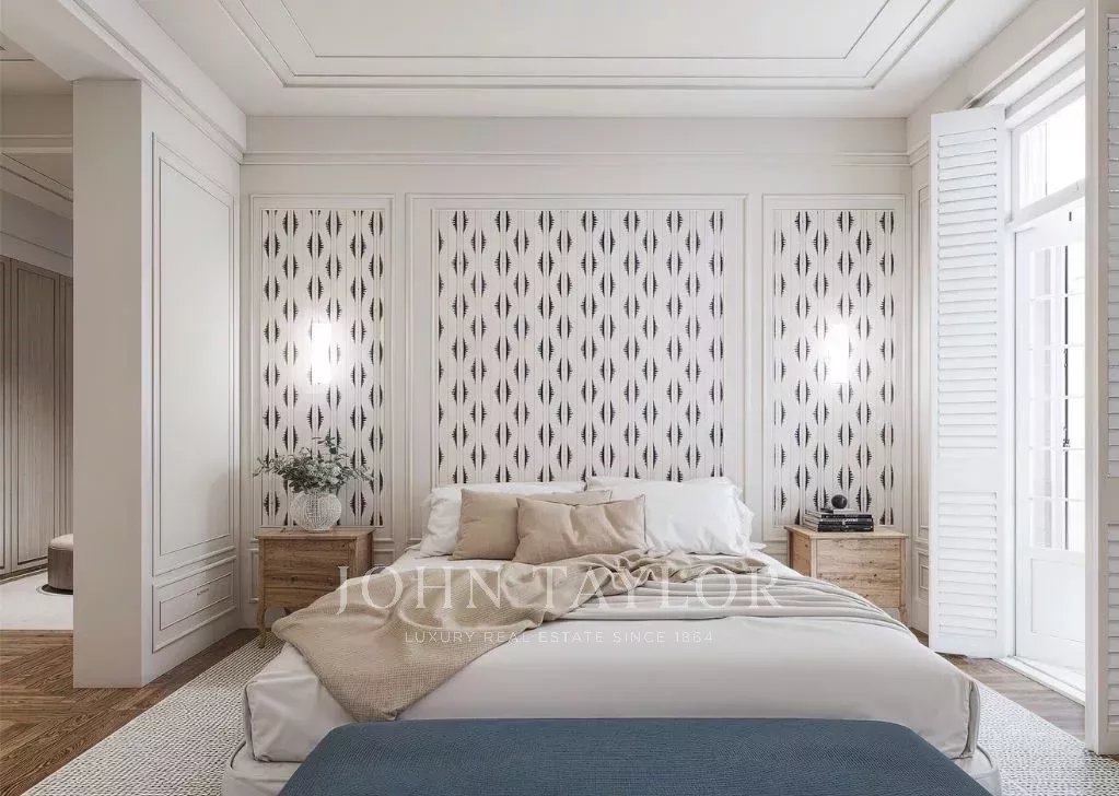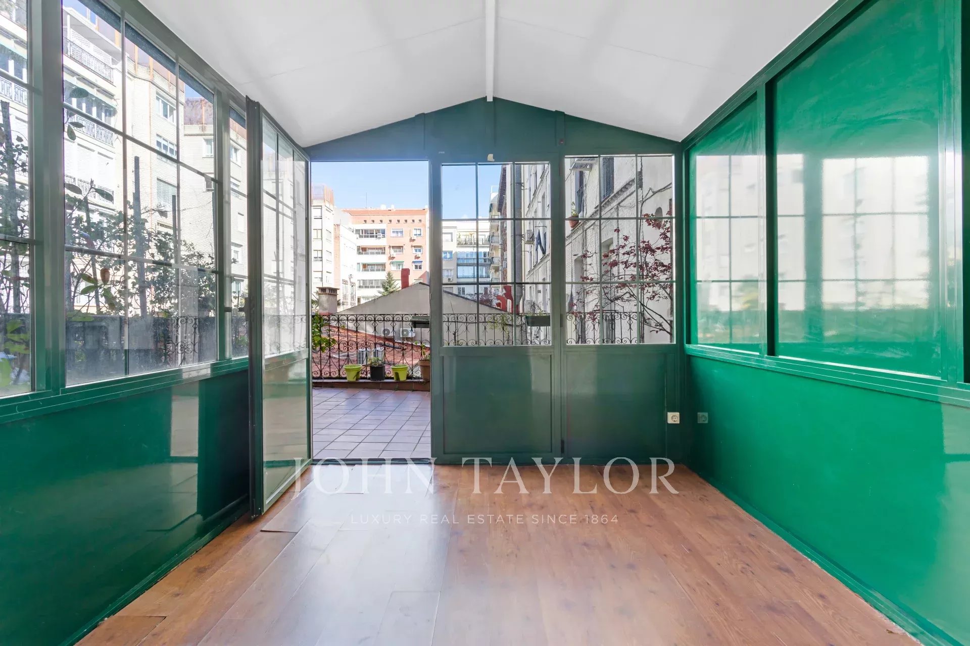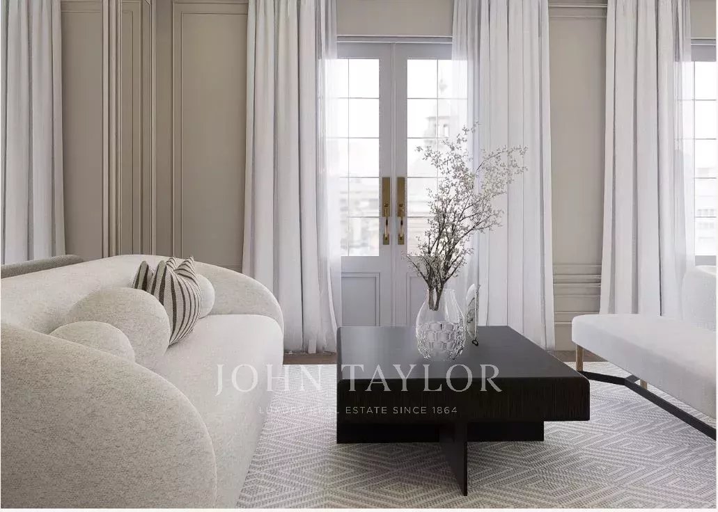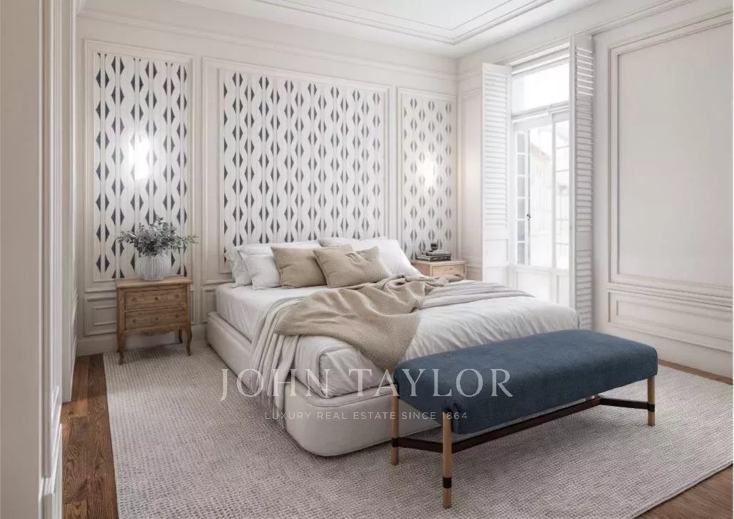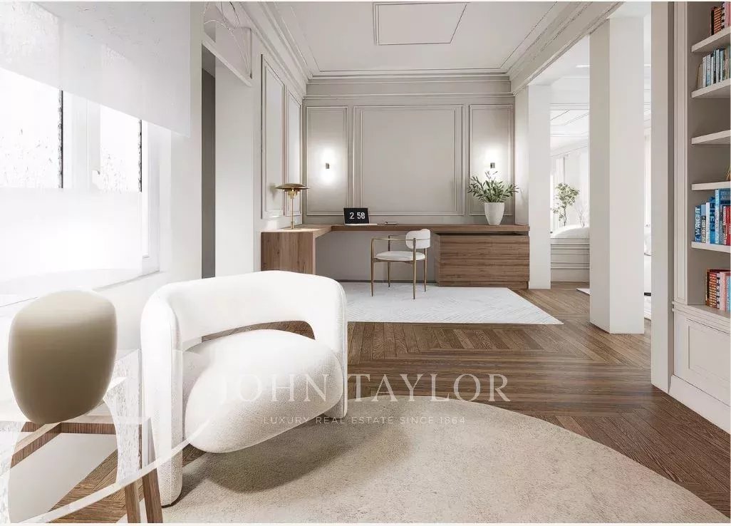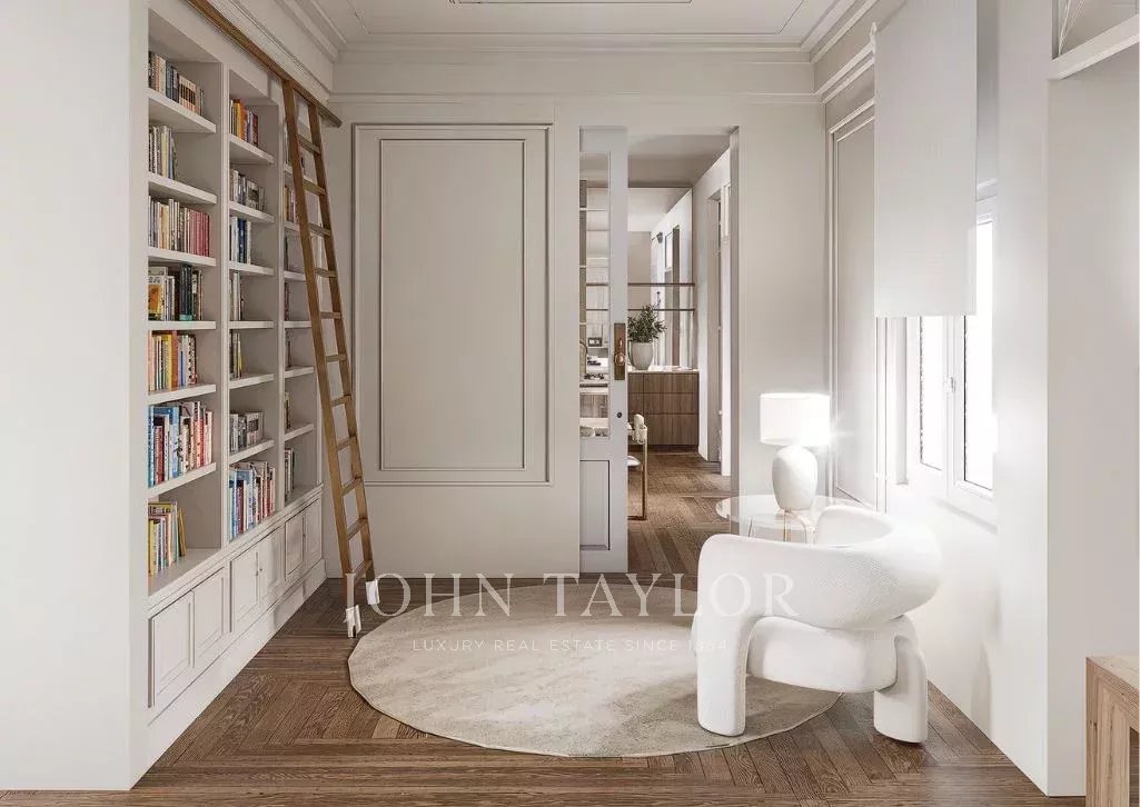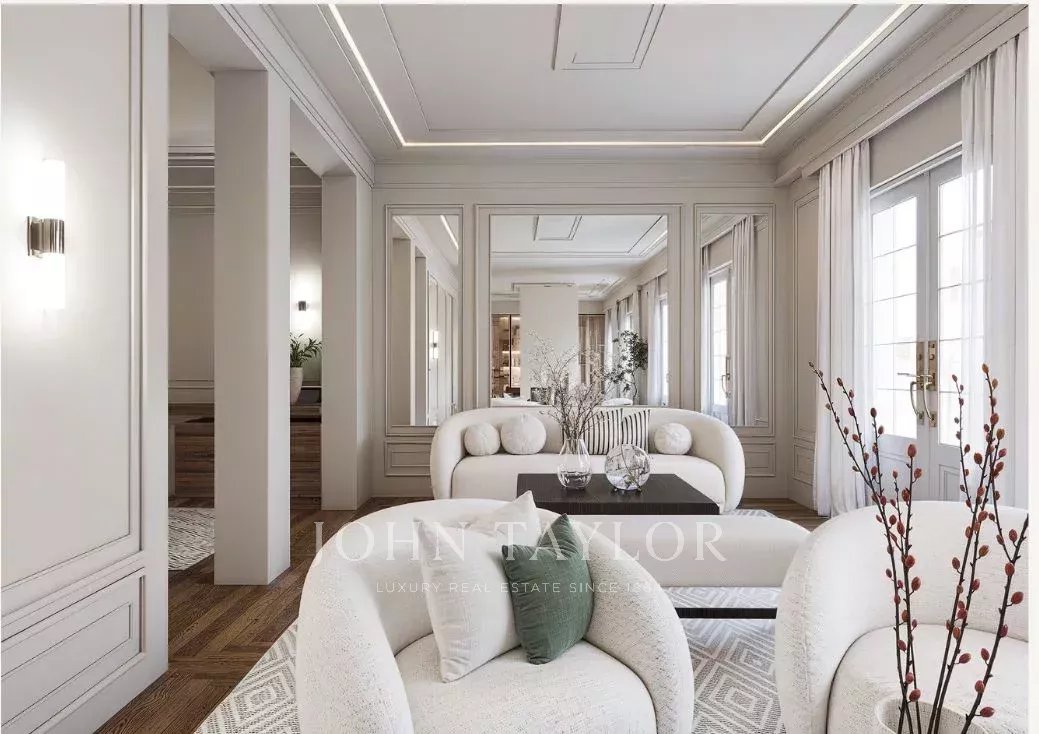 Dank der hohen Decken und großen Fenster ist die Wohnung den ganzen Tag über von natürlichem Licht durchflutet. Sie verfügt über 303 m2 Wohnfläche und eine großzügige 70 m2 große Terrasse, die sich perfekt für den Morgenkaffee, Mahlzeiten in der Sonne oder Mahlzeiten im Freien eignet.