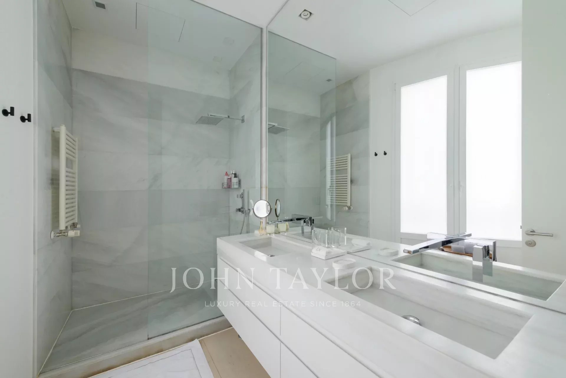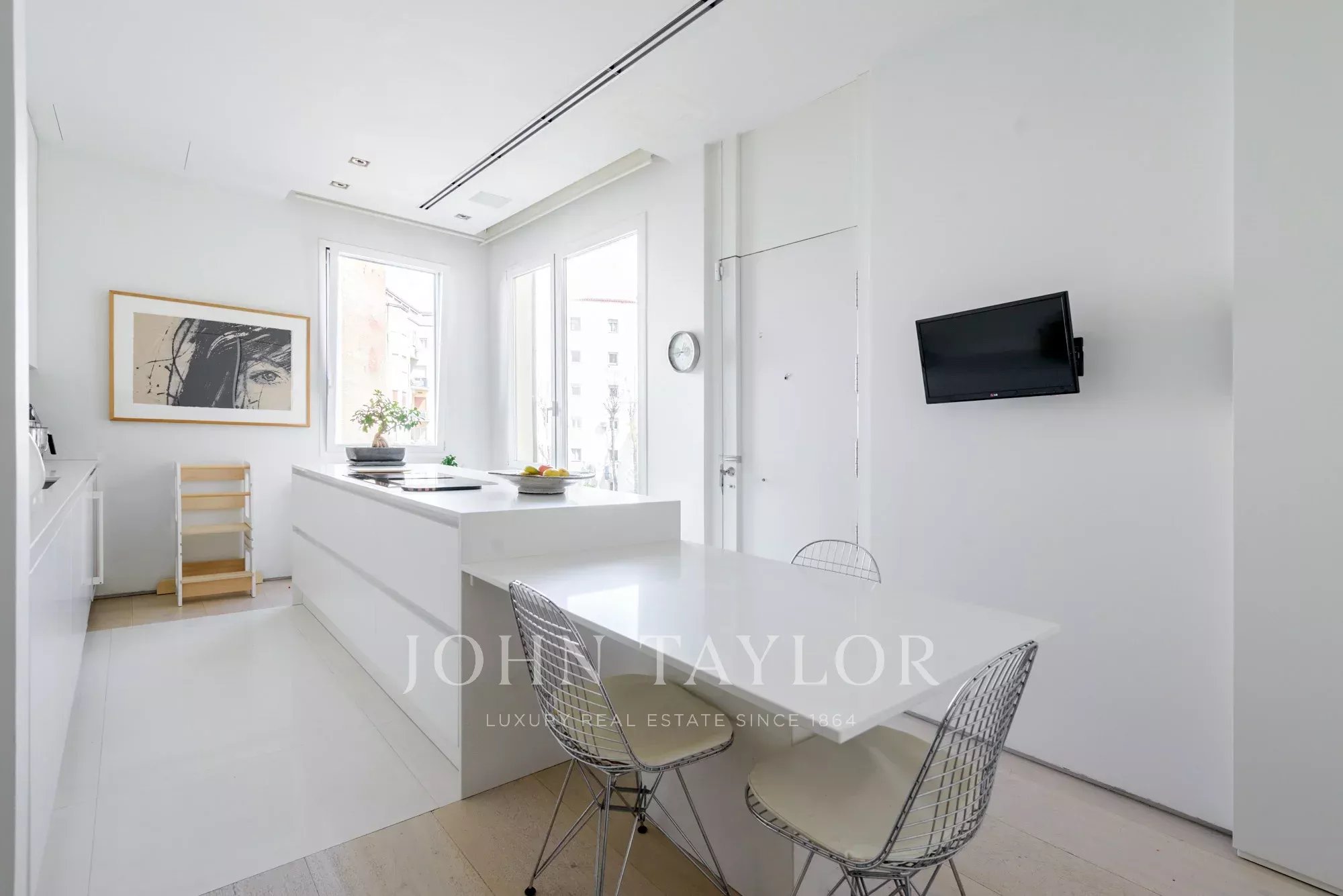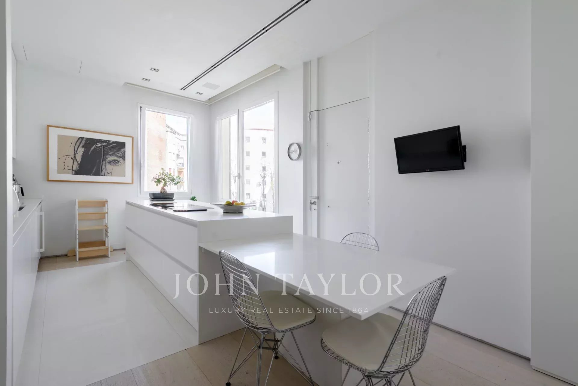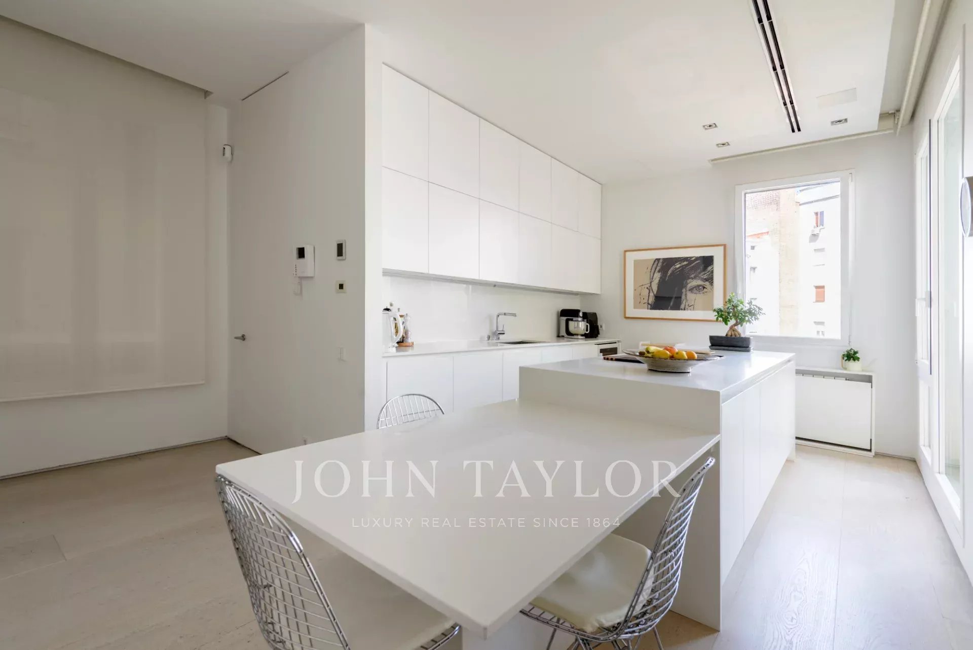 Die Küche ist unabhängig und hell, mit einem Essbereich und großen Fenstern mit Blick auf einen friedlichen, begrünten Innenhof. Die Geräte sind von höchster Qualität.