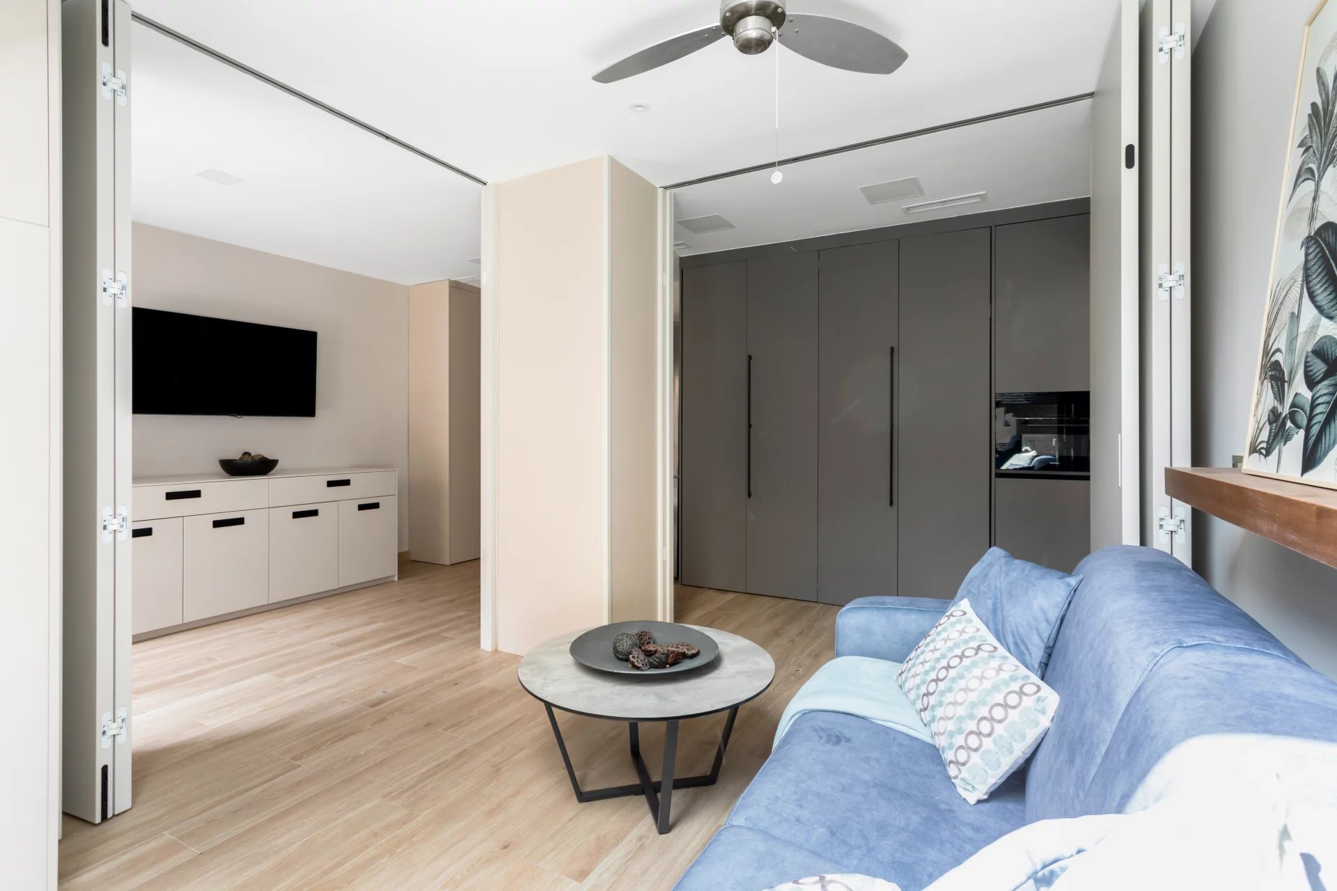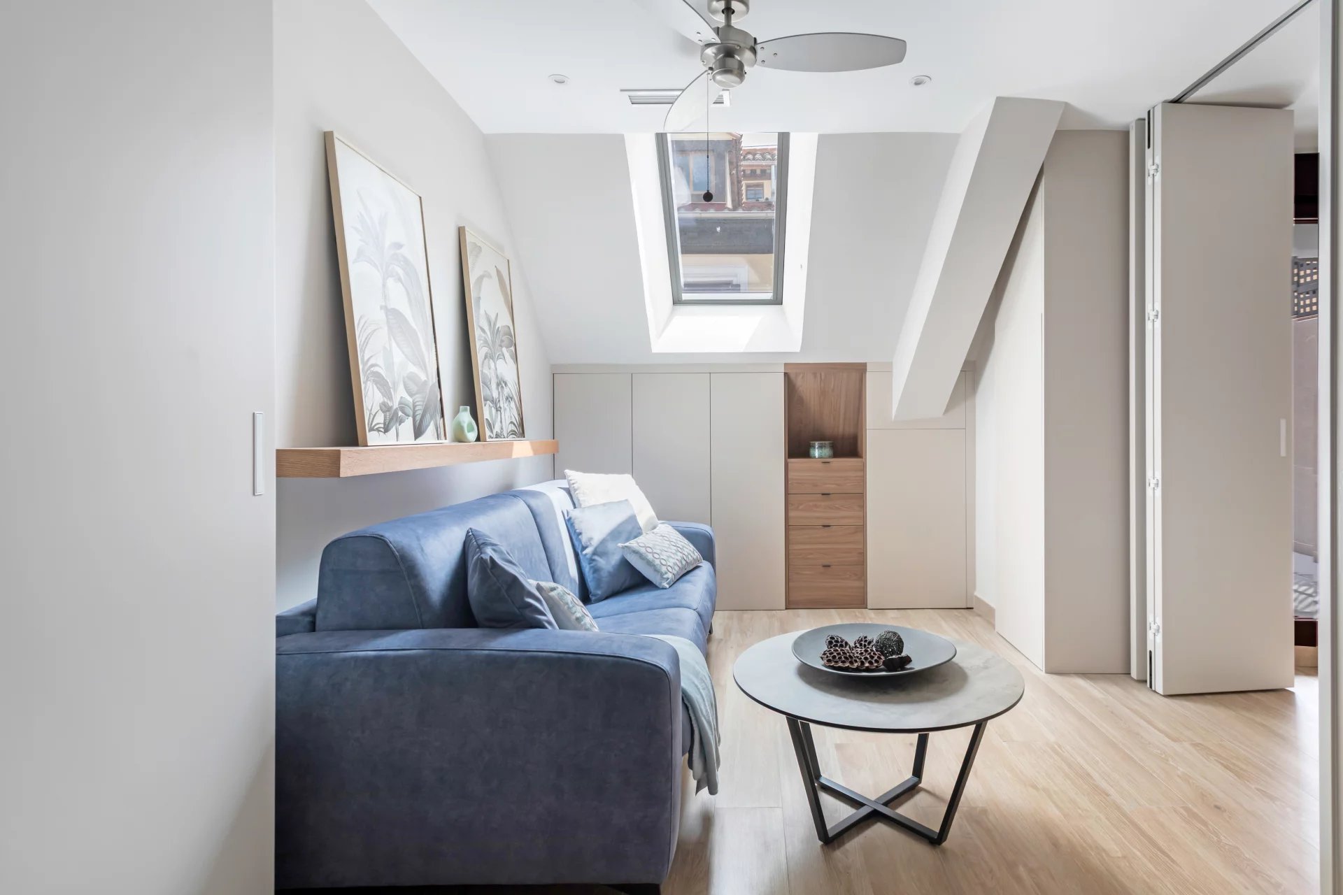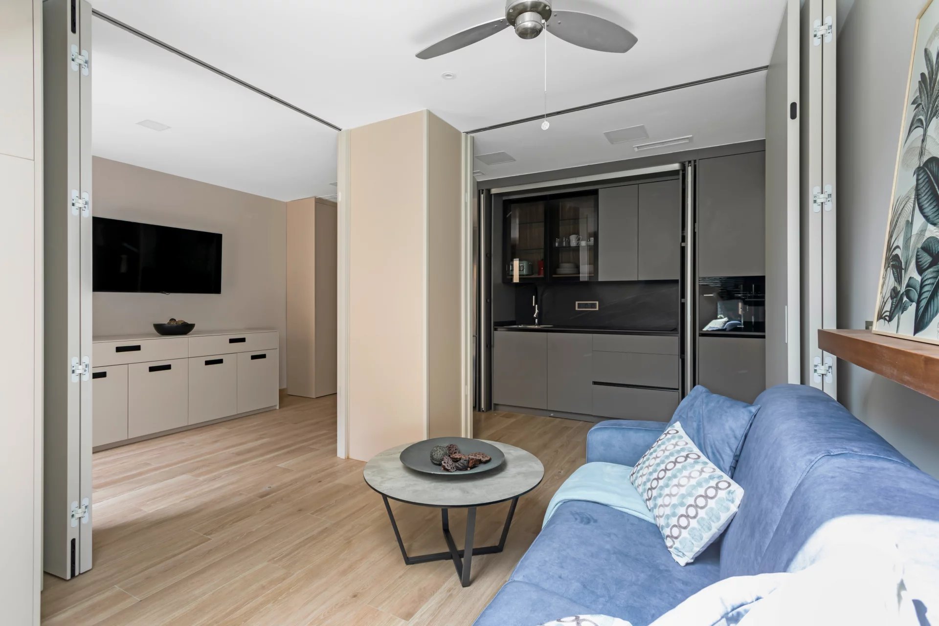 In der ersten Etage befindet sich das lichtdurchflutete Wohn-/Esszimmer, das mit Hilfe von klappbaren Holzpaneelen in ein zweites Schlafzimmer umgewandelt werden kann, mit einem separaten Badezimmer.