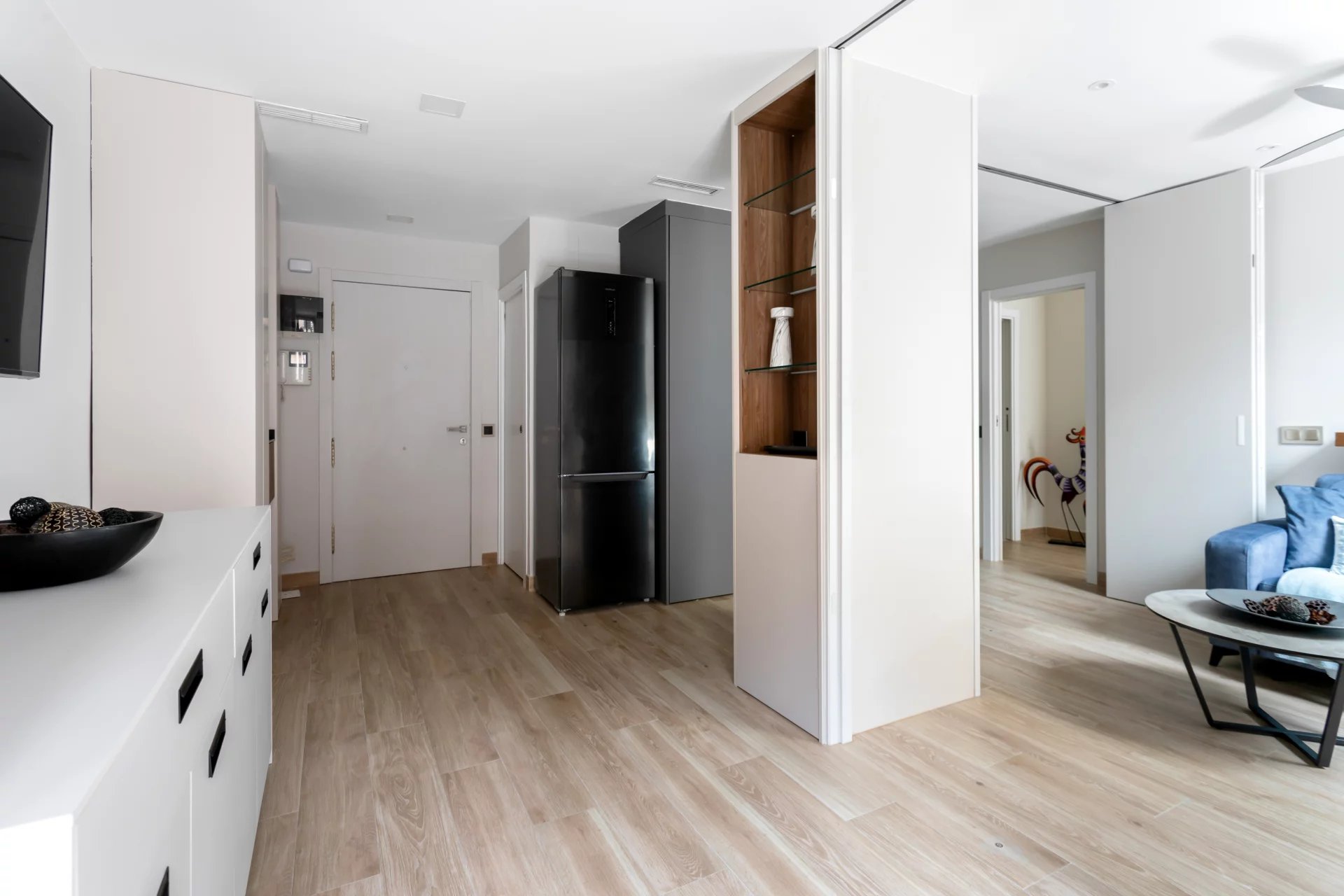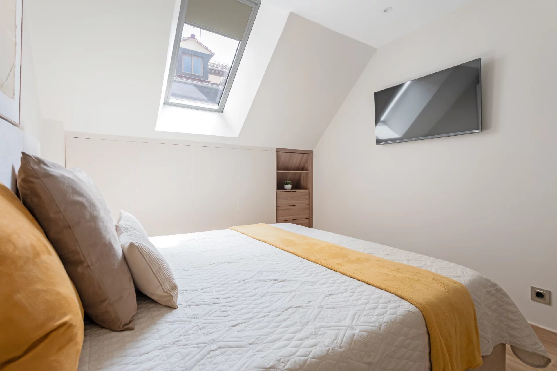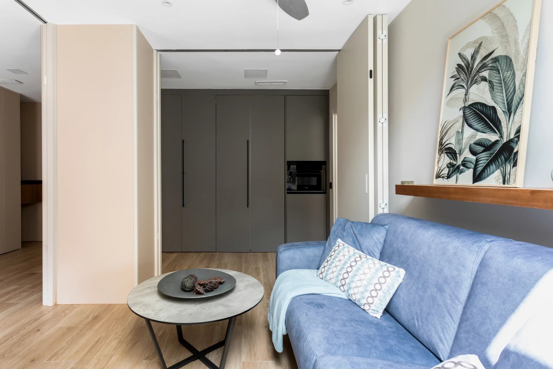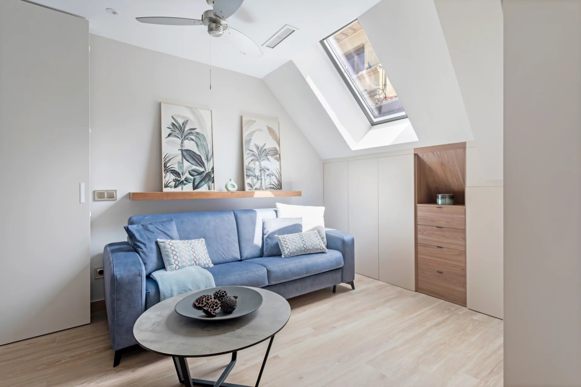 In der ersten Etage befindet sich das lichtdurchflutete Wohn-/Esszimmer, das mit Hilfe von klappbaren Holzpaneelen in ein zweites Schlafzimmer umgewandelt werden kann, mit einem separaten Badezimmer.