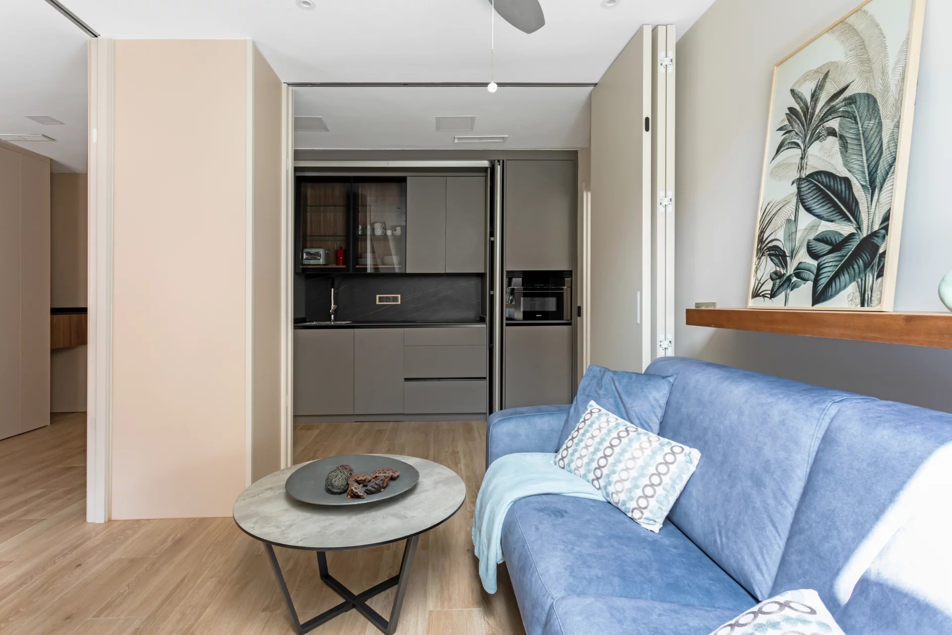 Daneben befindet sich die offene, voll ausgestattete Küche, die auch hinter Holztüren versteckt werden kann.