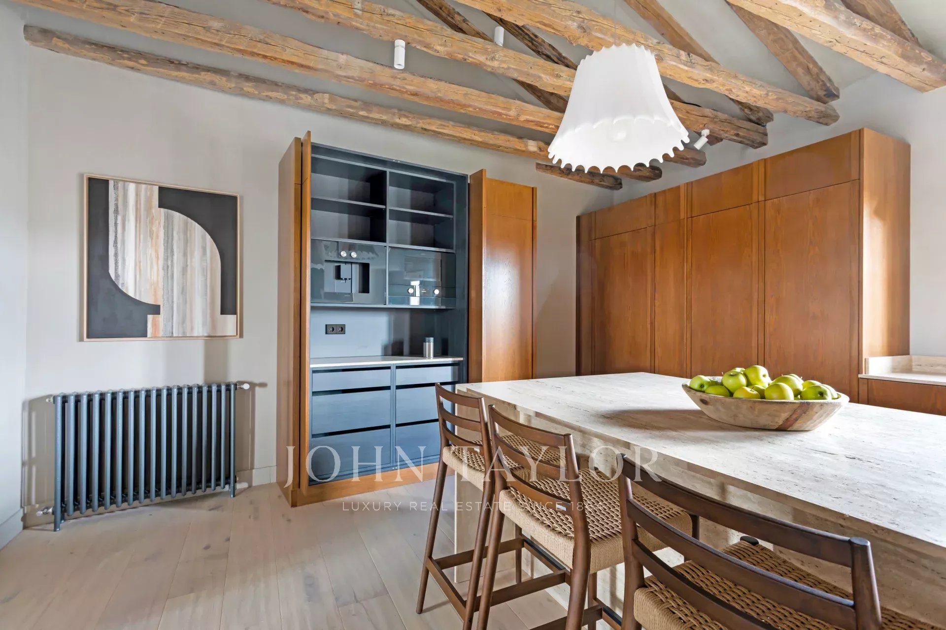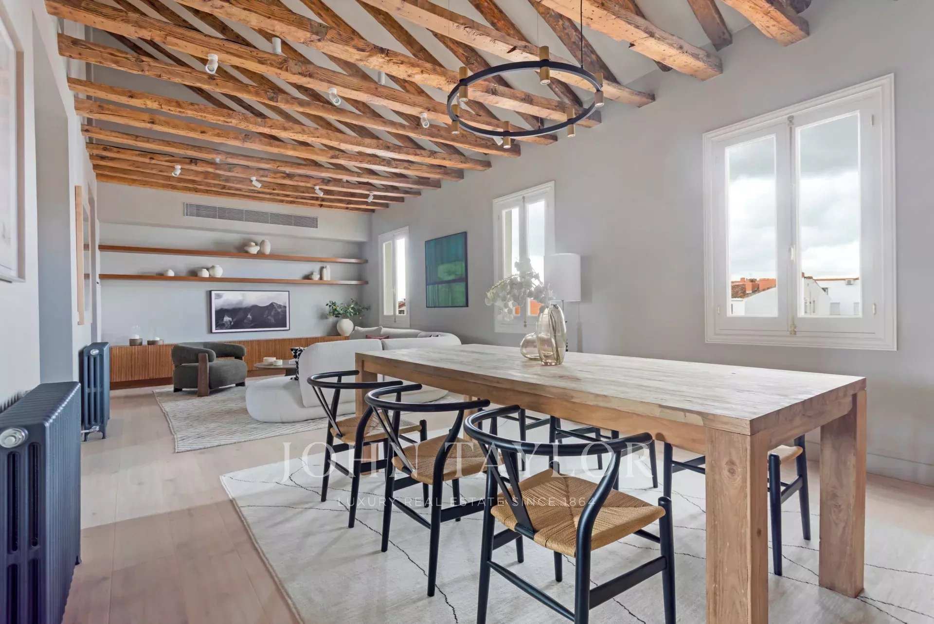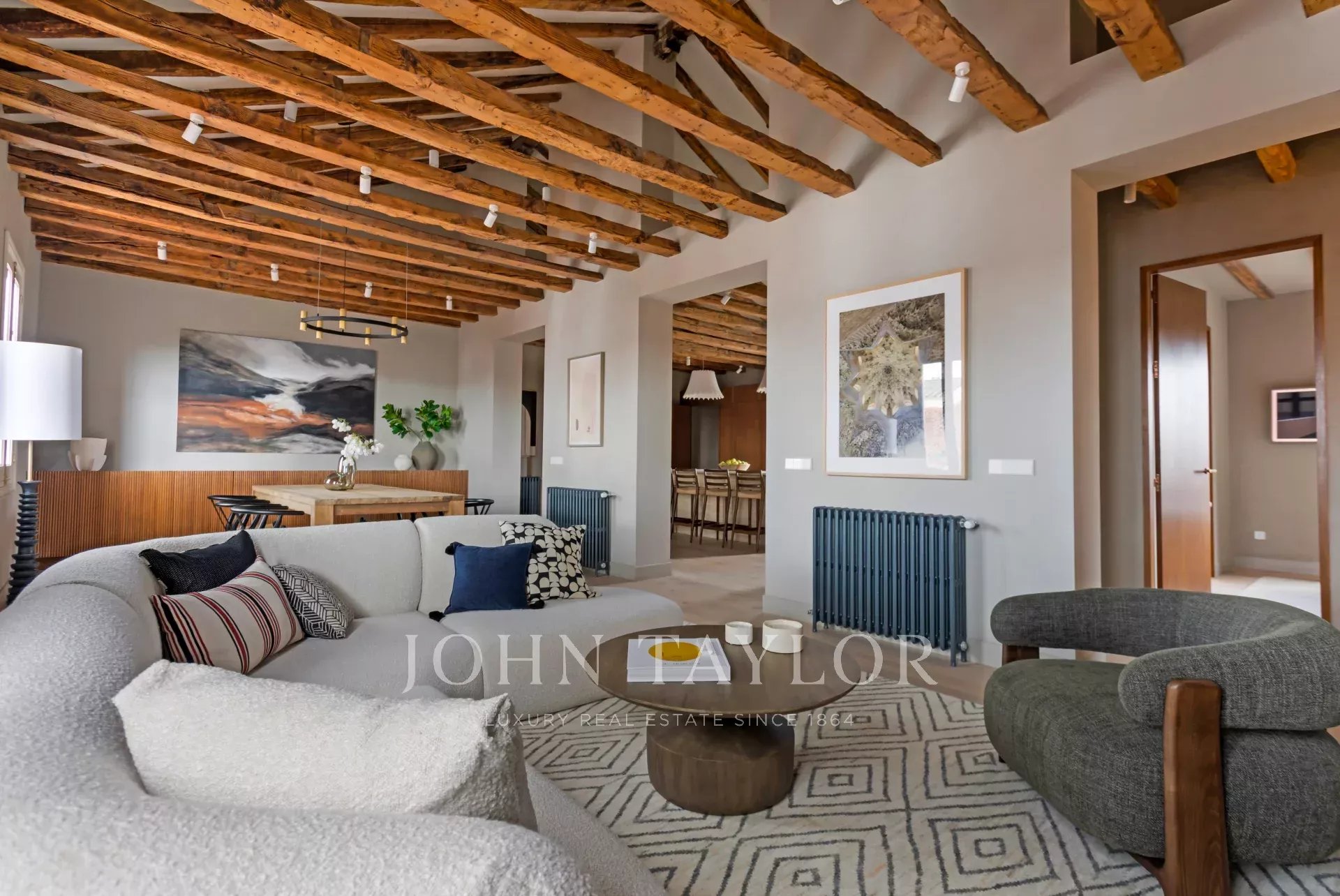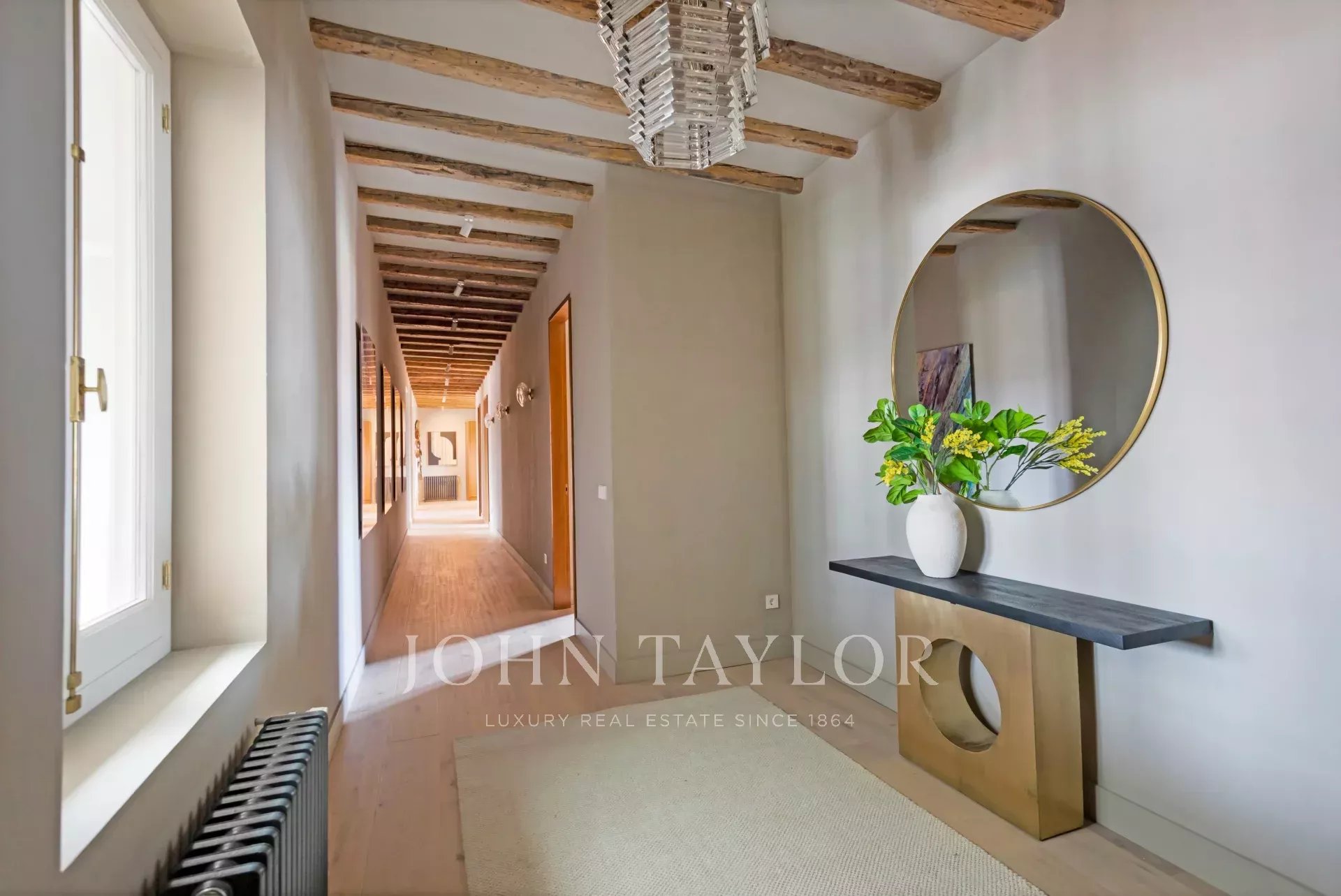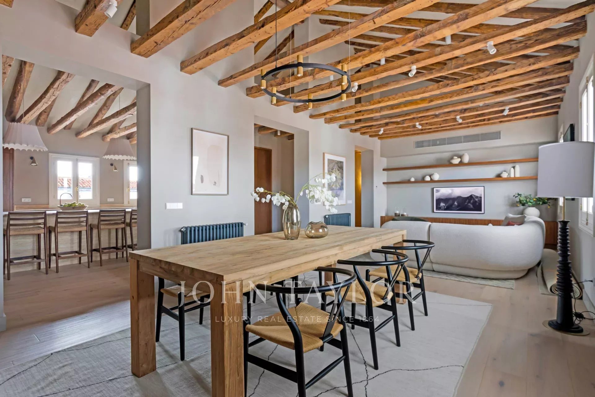Es besteht aus drei Schlafzimmern mit Ankleidezimmern und kompletten en-suite Badezimmern, sowie einer Waschküche und einem Gäste-WC. Diese exklusive Immobilie ist vollständig renoviert und mit einem exquisiten Innendesign ausgestattet, das zeitgenössische Eleganz im Loft-Stil mit zeitloser Raffinesse harmonisch verbindet: strukturierte Wände, originale Balken, gewaschene Eichenböden und klassische Holzfenster im gesamten Gebäude.