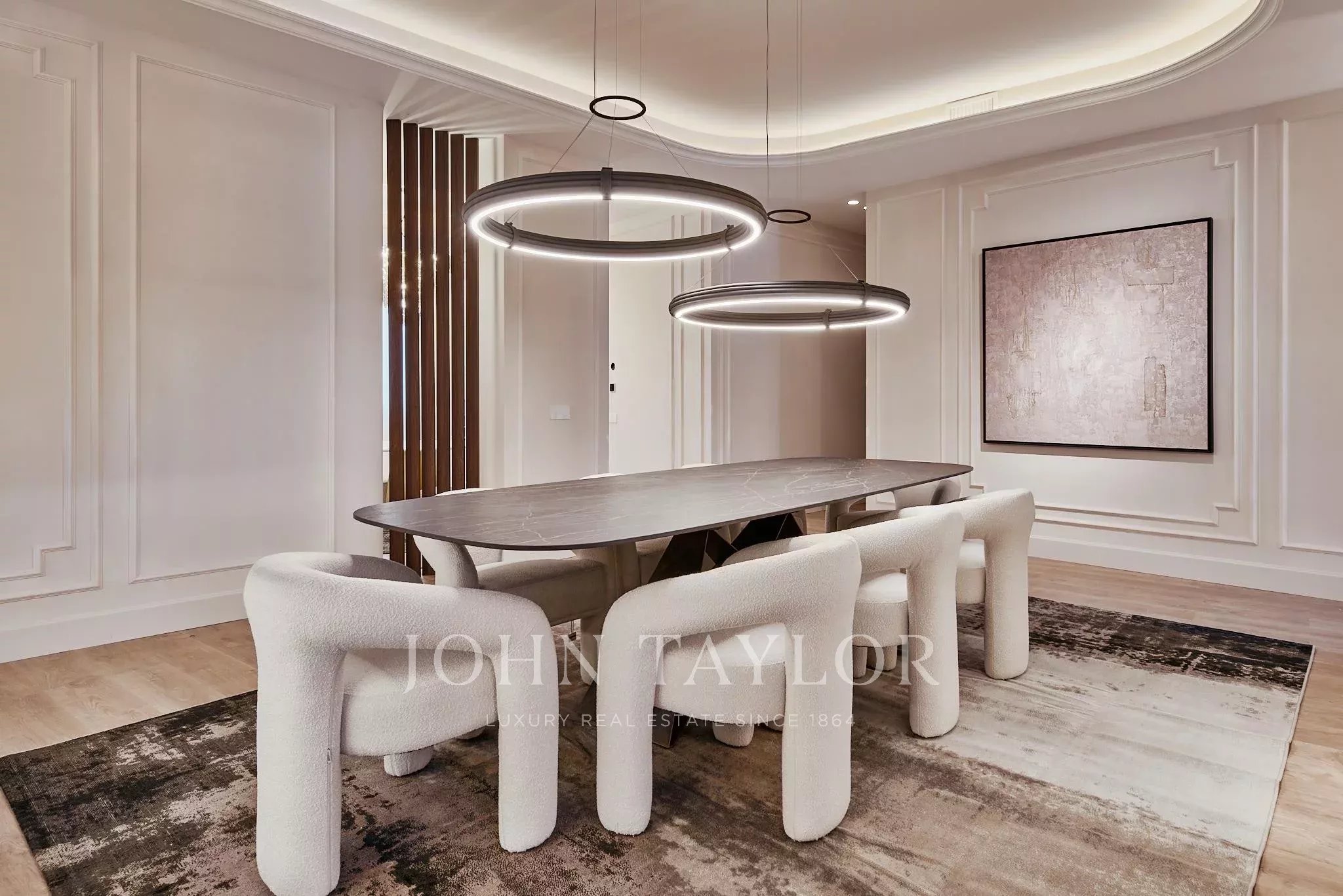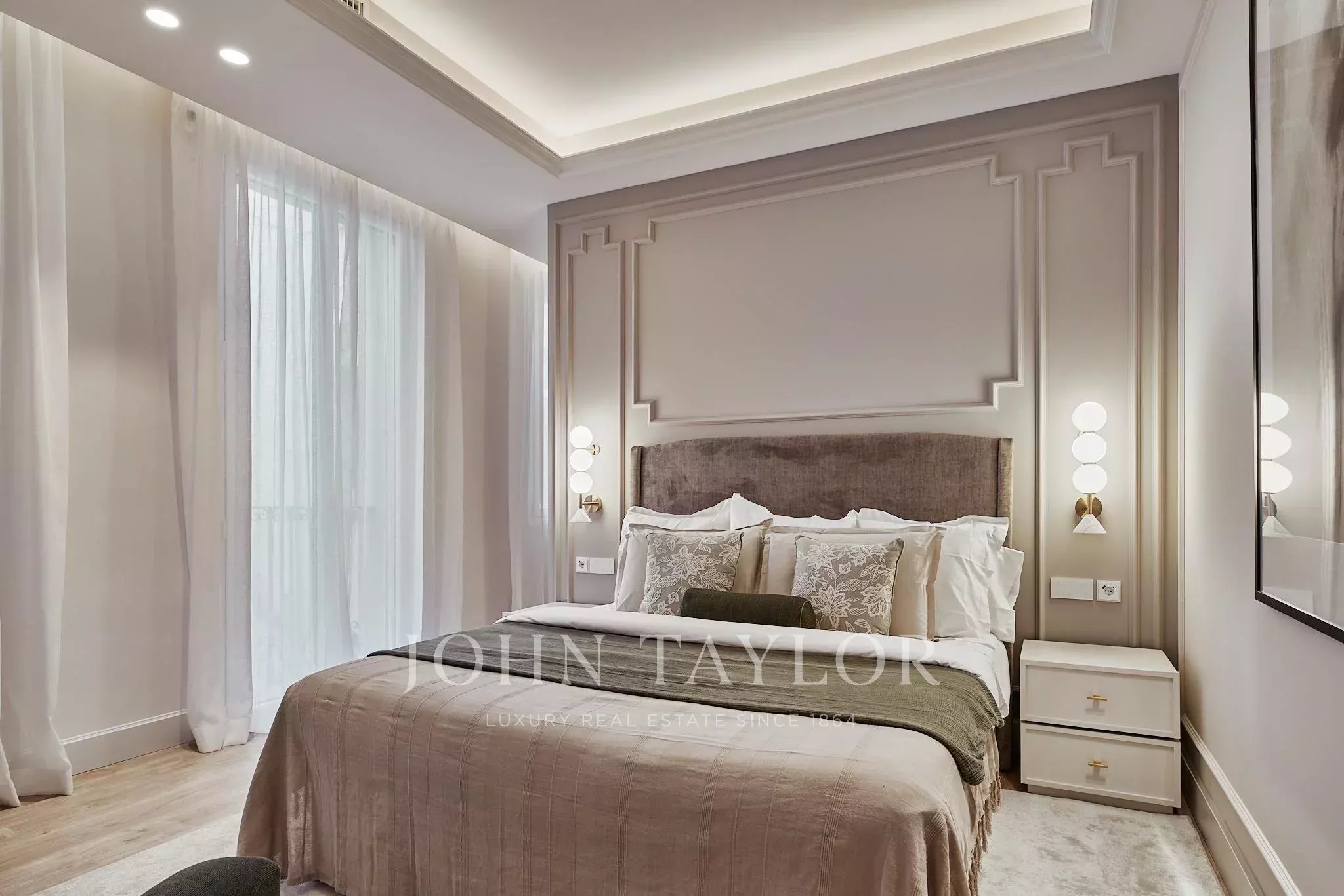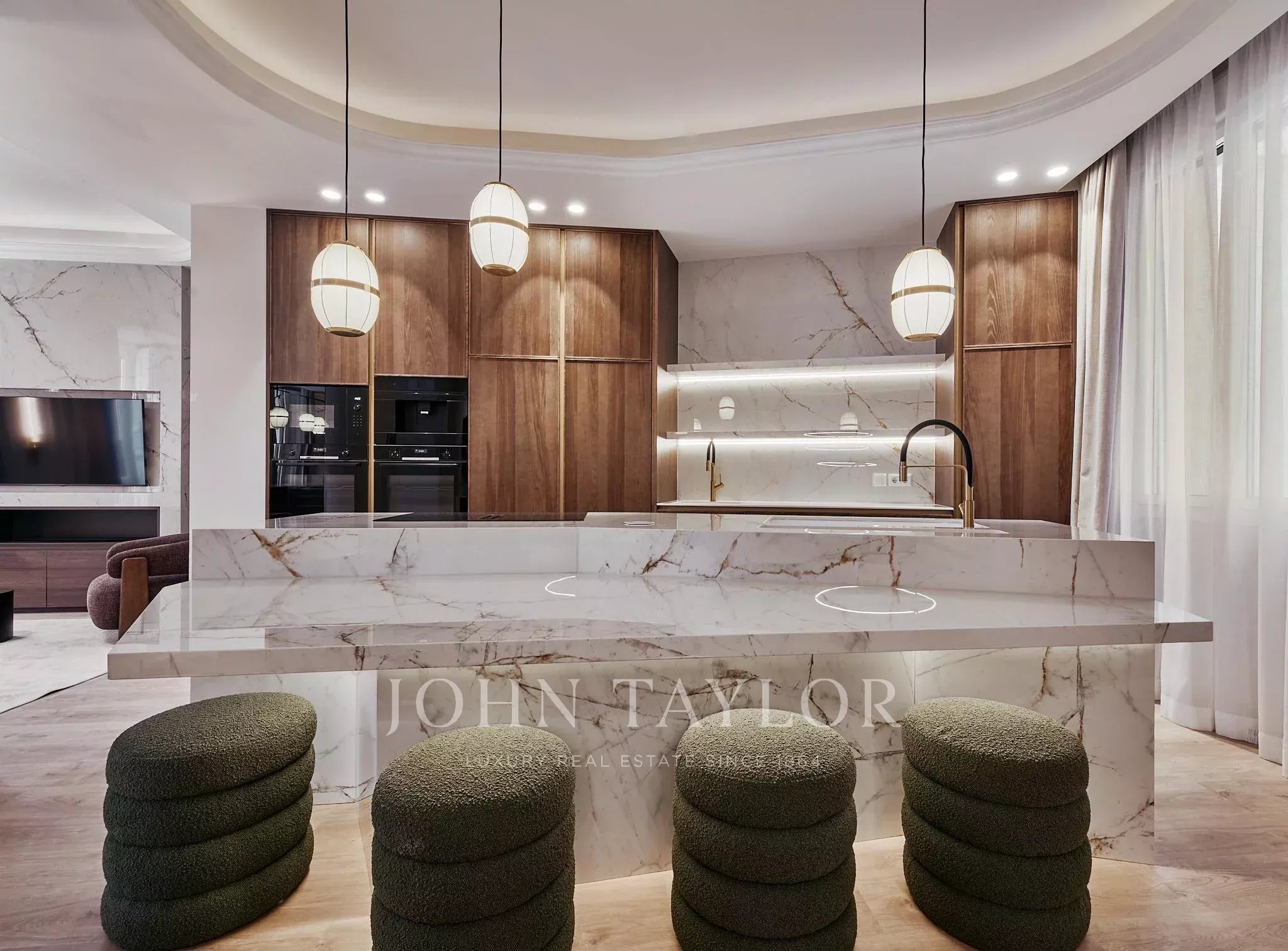 Die Immobilie verfügt über zwei geräumige Wohnzimmer, einen Hauptraum, der als Versammlungs- und Repräsentationsraum konzipiert ist, und einen weiteren, intimeren Raum, der zur Ruhe und Privatsphäre einlädt. Der Nachtbereich besteht aus vier Schlafzimmern und fünf kompletten Badezimmern, sowie einem Gäste-WC.