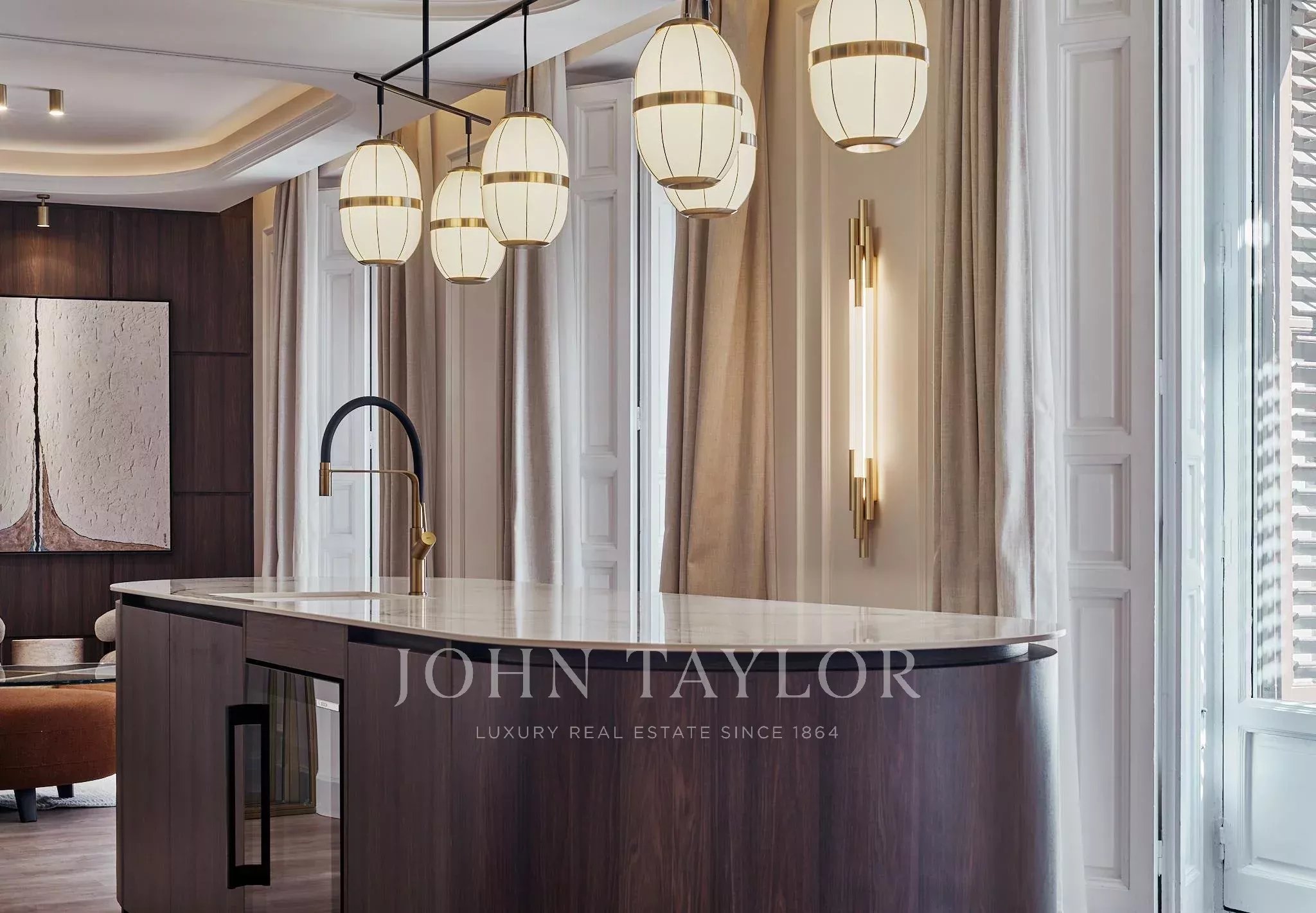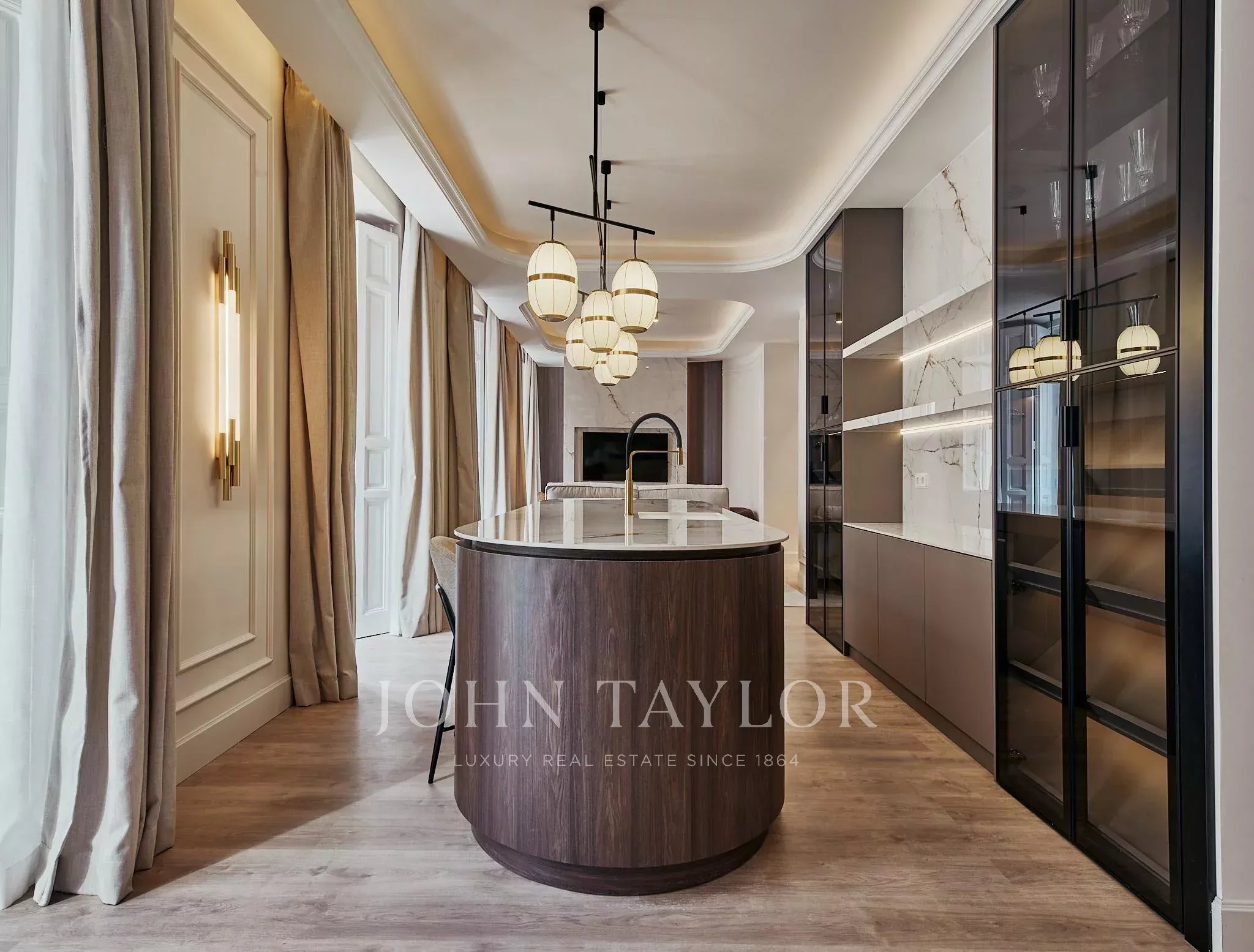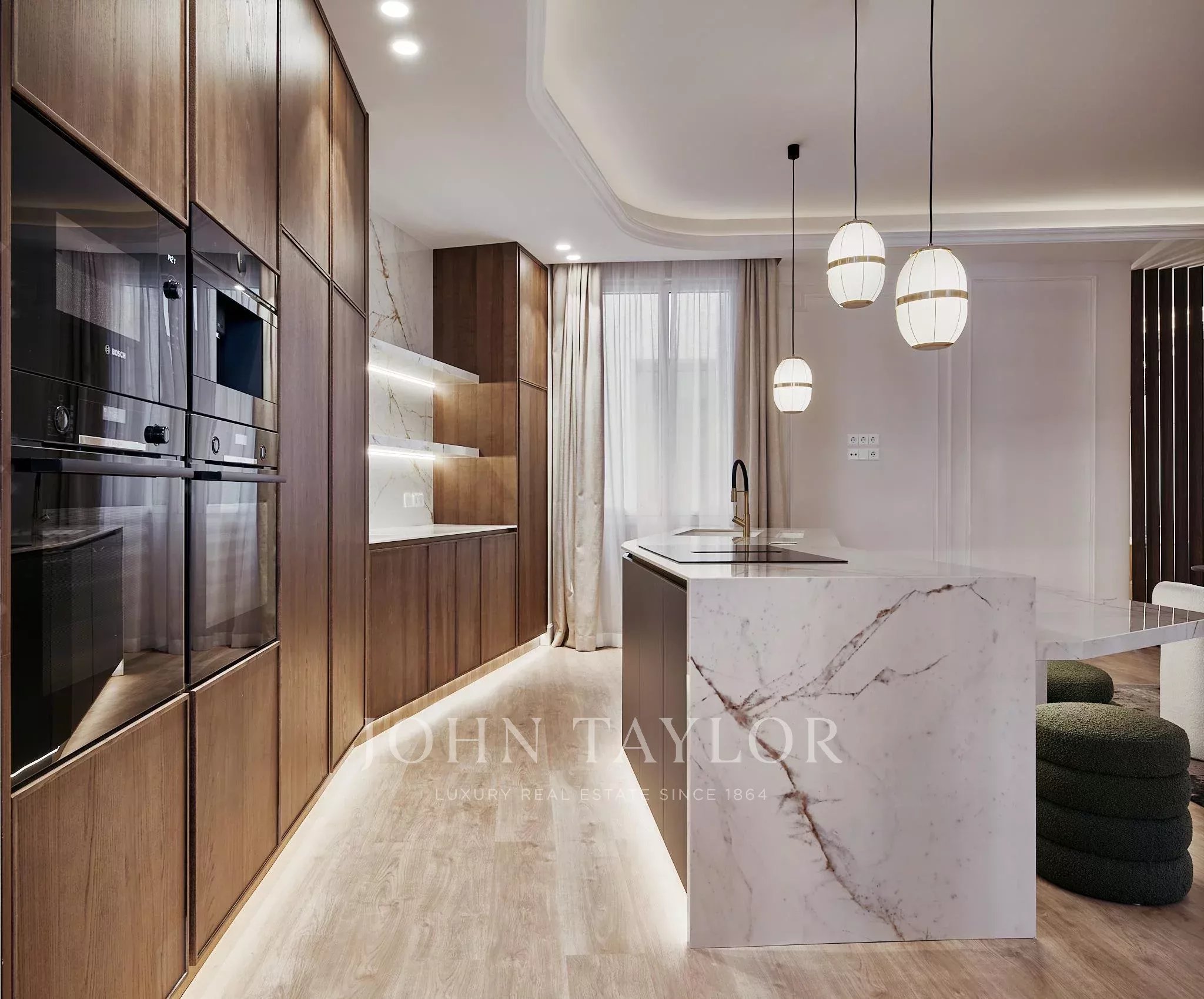 Die Immobilie verfügt über zwei geräumige Wohnzimmer, einen Hauptraum, der als Versammlungs- und Repräsentationsraum konzipiert ist, und einen weiteren, intimeren Raum, der zur Ruhe und Privatsphäre einlädt. Der Nachtbereich besteht aus vier Schlafzimmern und fünf kompletten Badezimmern, sowie einem Gäste-WC.