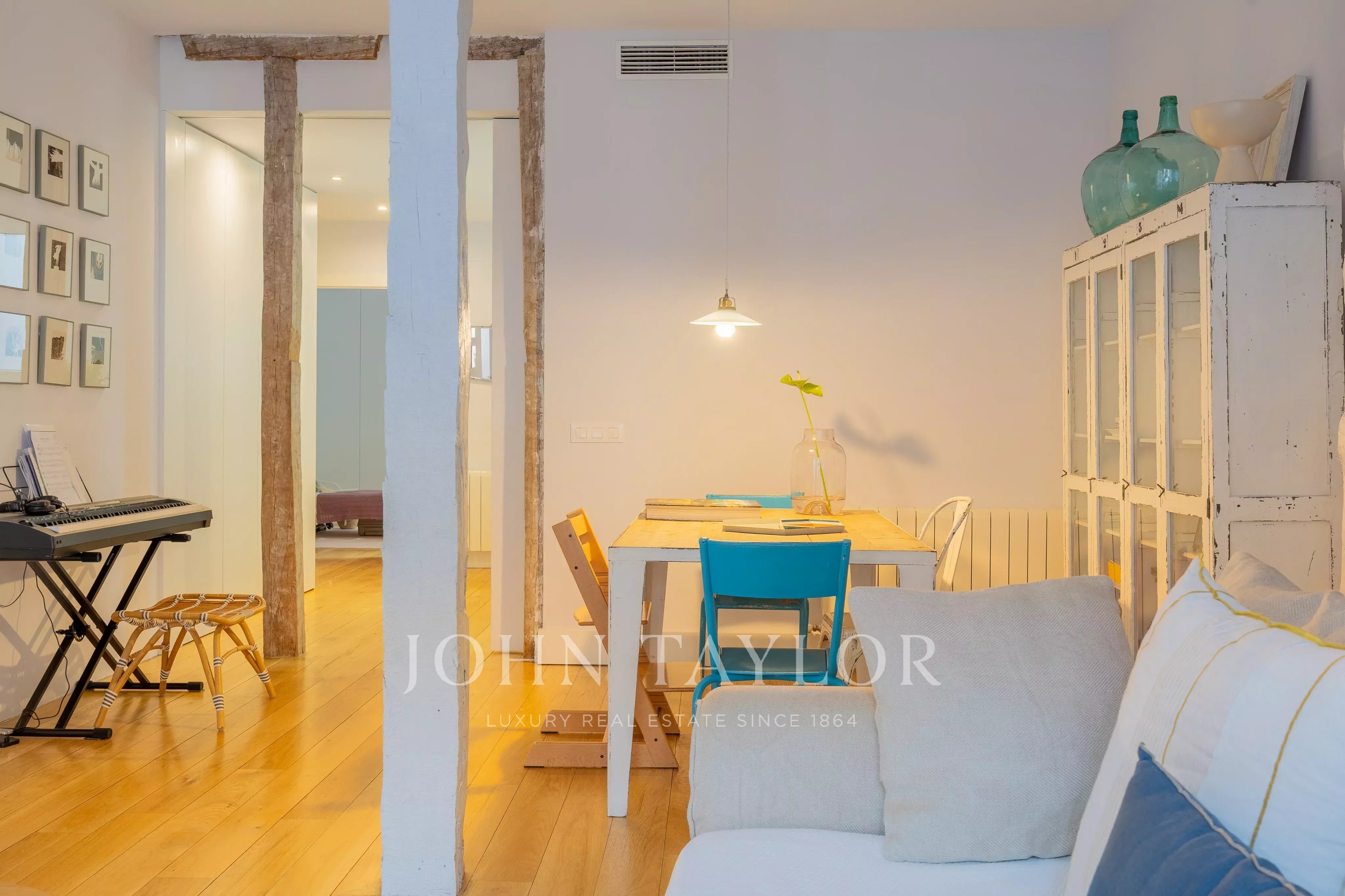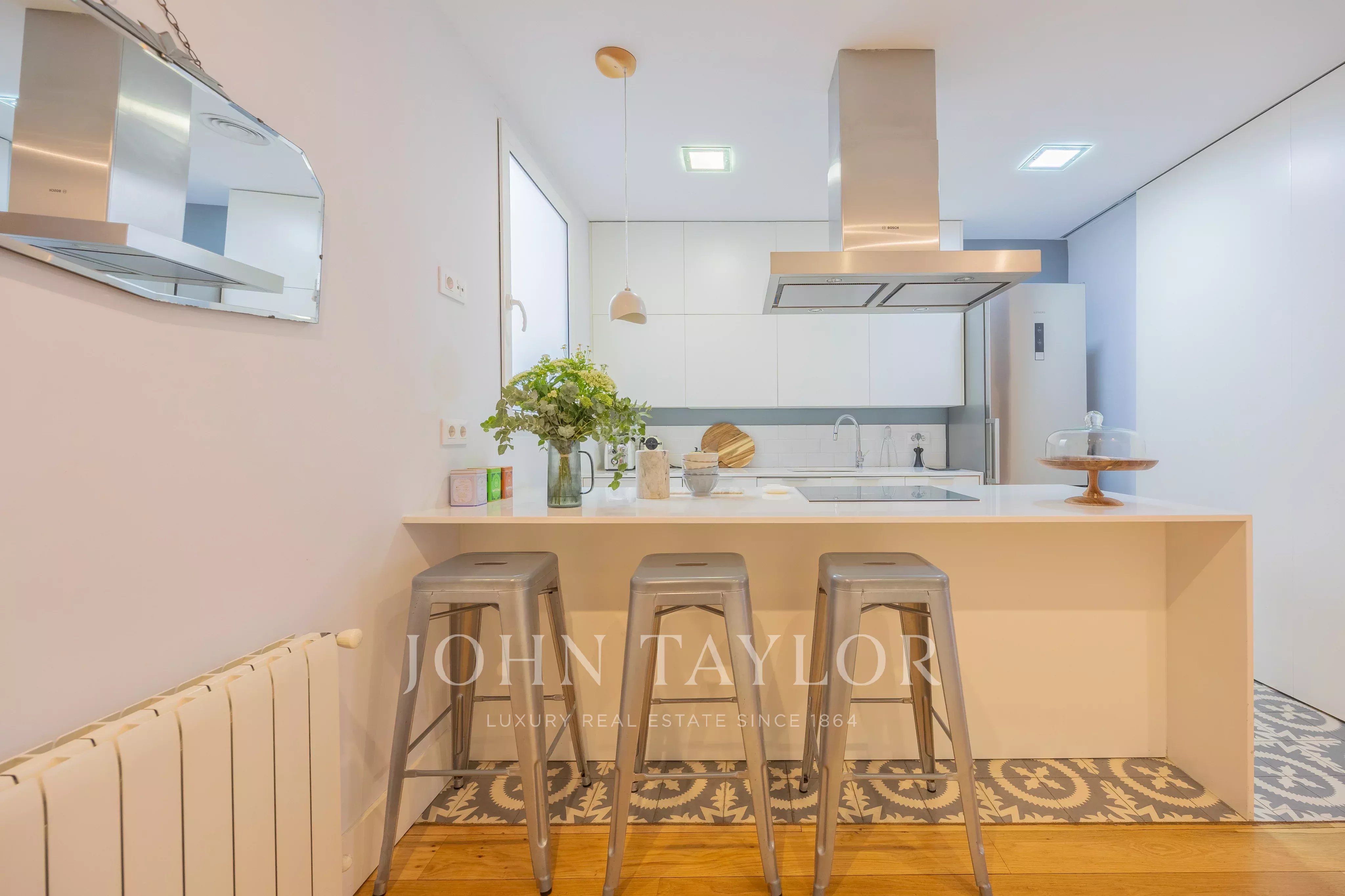 Die Wohnung verfügt über zwei großzügige Schlafzimmer, ein helles Wohnzimmer mit großen Fenstern und ein modernes und gemütliches Ambiente dank hochwertigem Holzfußboden und gepflegter Dekoration. Die voll ausgestattete Küche integriert sich perfekt in den Wohnbereich und bietet Funktionalität und modernes Design. Details wie Klimaanlage, Video-Gegensprechanlage und Hausmeister garantieren höchsten Komfort und Sicherheit im Alltag, wodurch ein Zuhause geschaffen wird, das den aktuellen Bedürfnissen entspricht. Die Wohnung zeichnet sich durch ihre hervorragende Raumaufteilung aus, die jeden Quadratmeter optimal nutzt und das natürliche Licht maximiert.