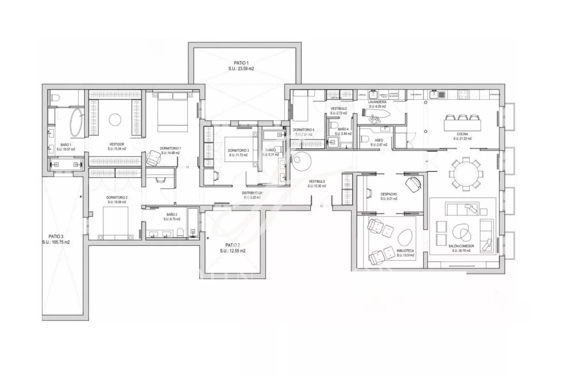 Diese 251 m2 große Familienwohnung befindet sich im dritten Stock eines klassischen Gebäudes aus dem Jahr 1900 im begehrten Viertel Justicia und besteht aus vier Schlafzimmern mit eigenem Bad sowie einem Bürobereich, einer separaten Bibliothek und einer kompletten Waschküche. Das Wohn-Esszimmer und die Küche befinden sich im lichtdurchfluteten Außenbereich mit seinen 4 Balkonen mit Blick auf die Straße und seinen hohen Decken mit Leisten.