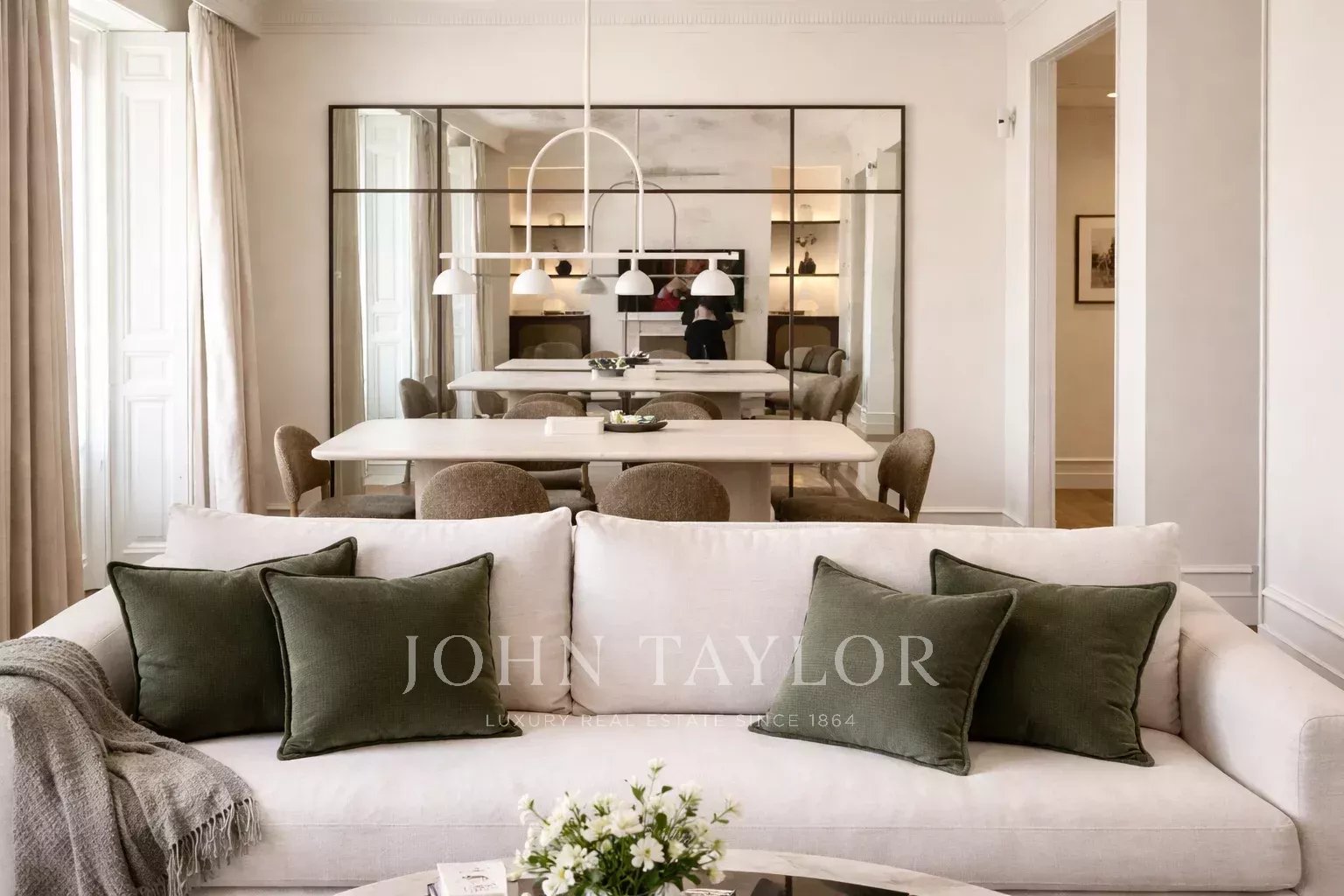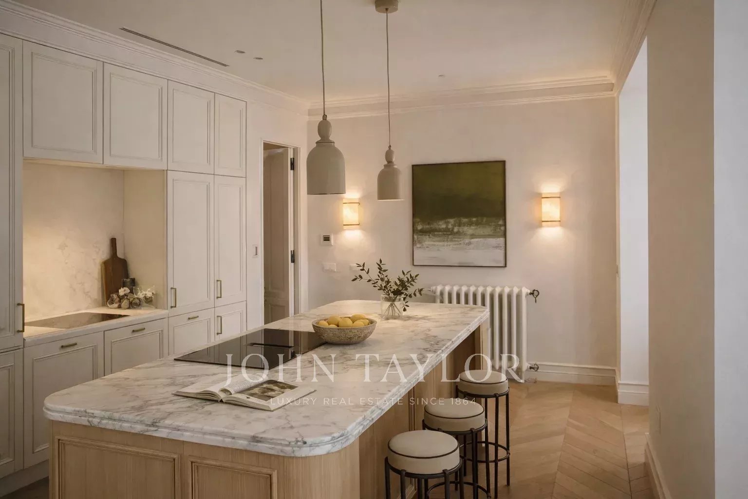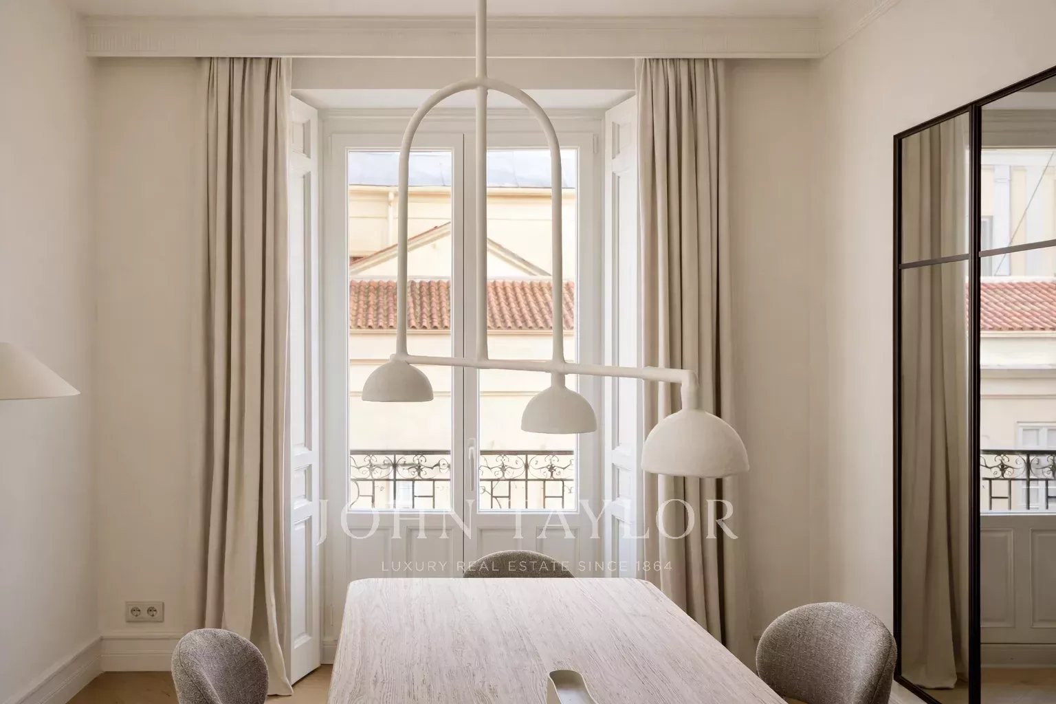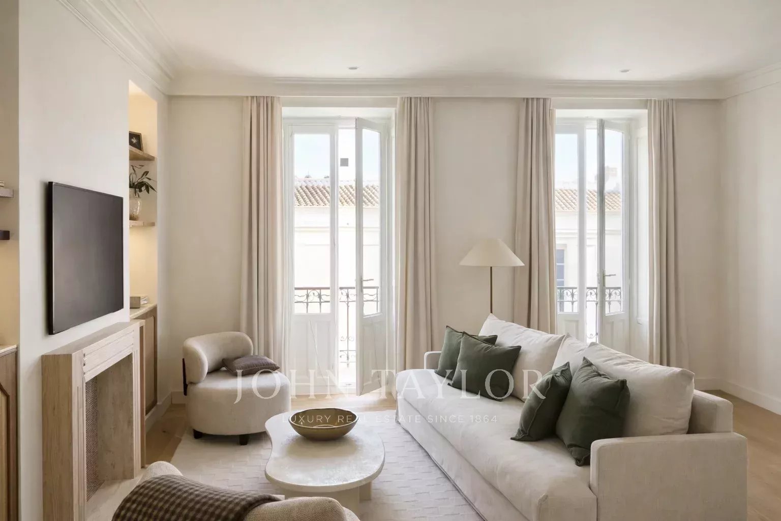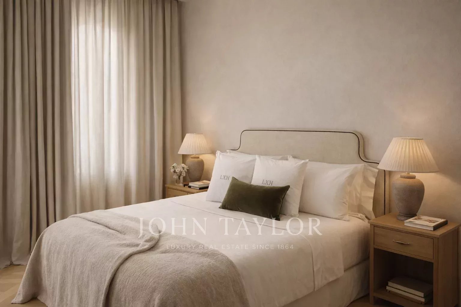 Mit zwei Schlafzimmern, zwei Bädern und zwei Balkonen, die die Wohnung mit natürlichem Licht durchfluten, wurde jeder Raum so konzipiert, dass er ein Maximum an Geräumigkeit, Helligkeit und Eleganz bietet. Die Höhe der Decken und die Ausrichtung der Wohnung verstärken das Gefühl von Großzügigkeit und schaffen eine warme und einladende Atmosphäre.