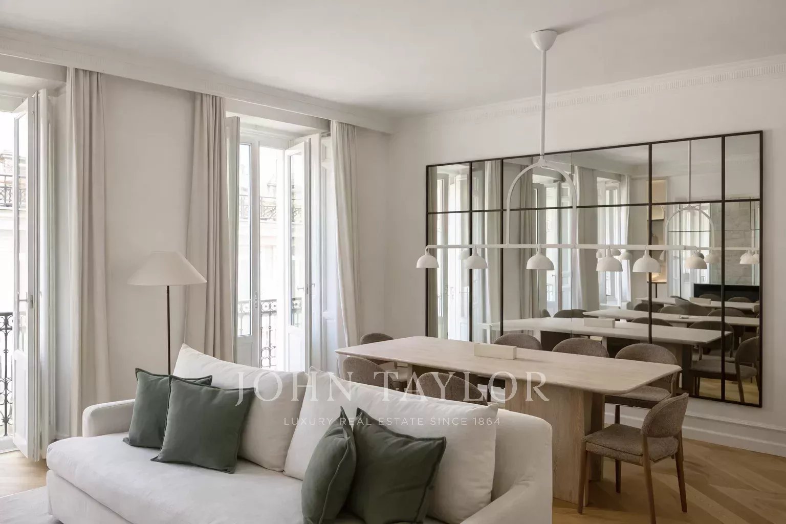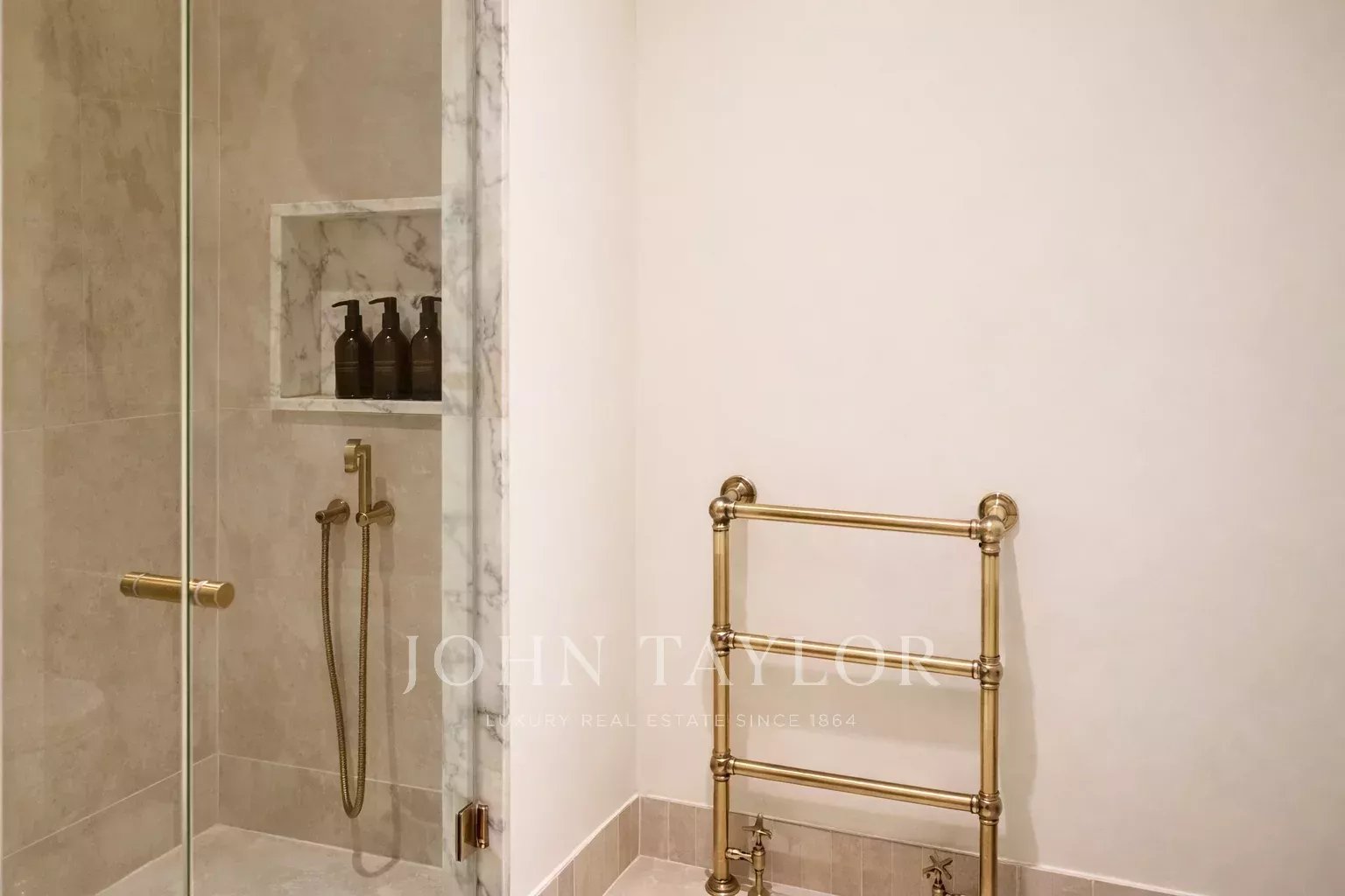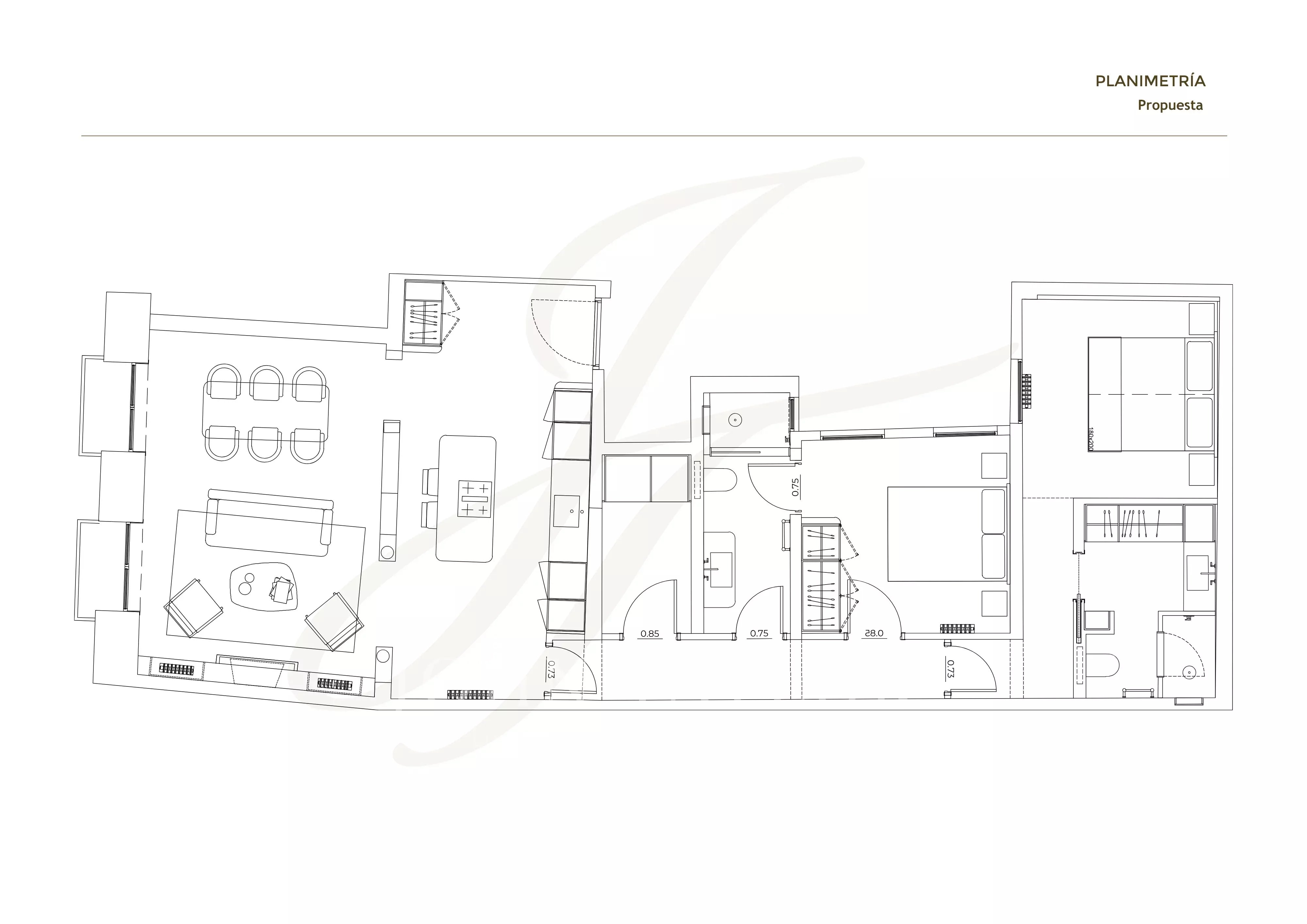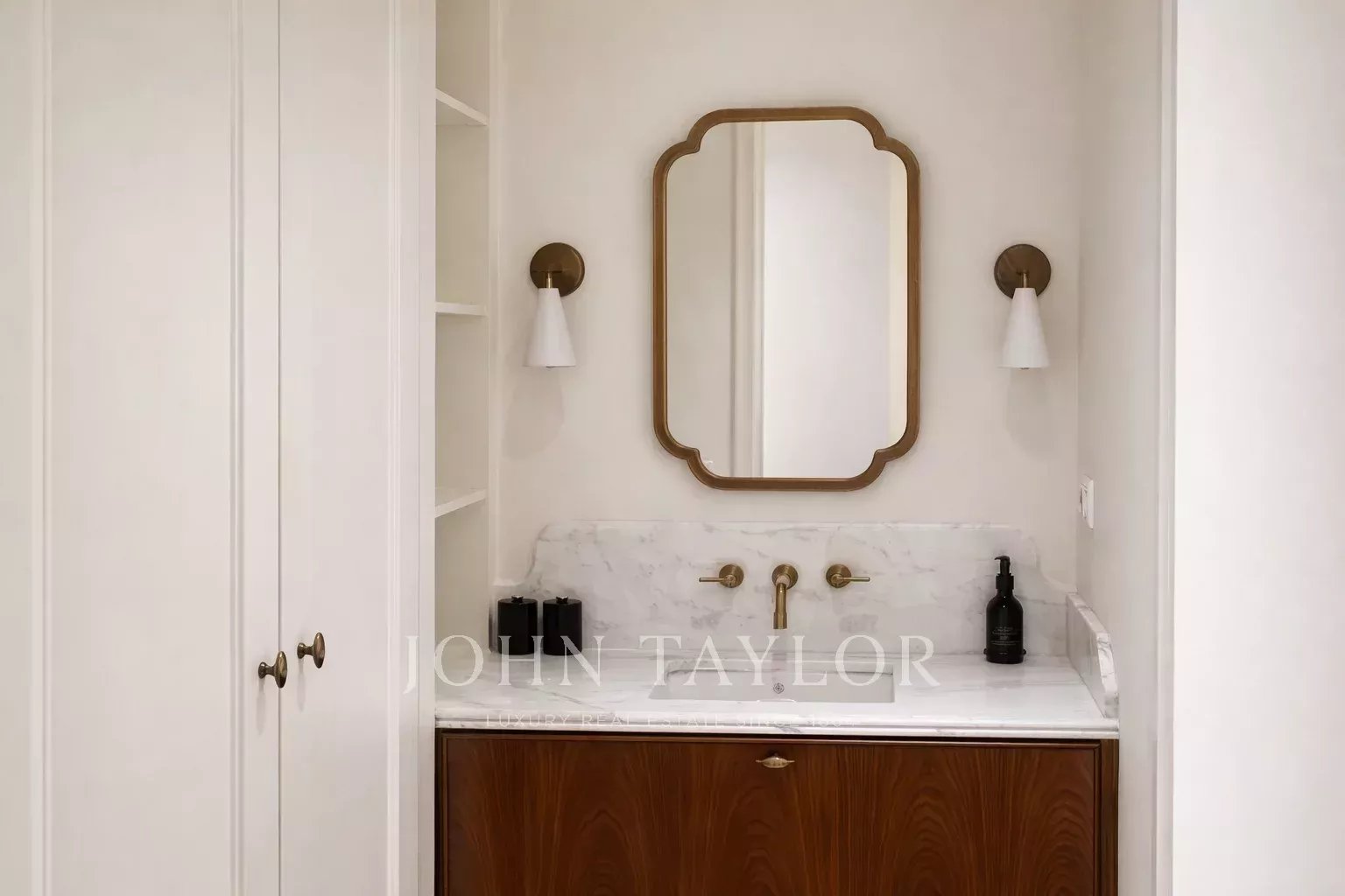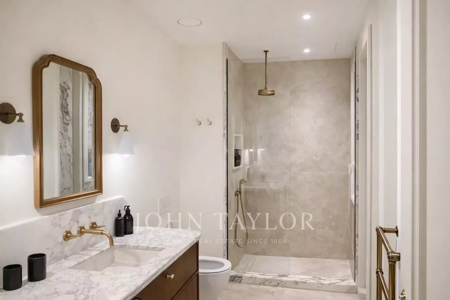 Mit zwei Schlafzimmern, zwei Bädern und zwei Balkonen, die die Wohnung mit natürlichem Licht durchfluten, wurde jeder Raum so konzipiert, dass er ein Maximum an Geräumigkeit, Helligkeit und Eleganz bietet. Die Höhe der Decken und die Ausrichtung der Wohnung verstärken das Gefühl von Großzügigkeit und schaffen eine warme und einladende Atmosphäre.