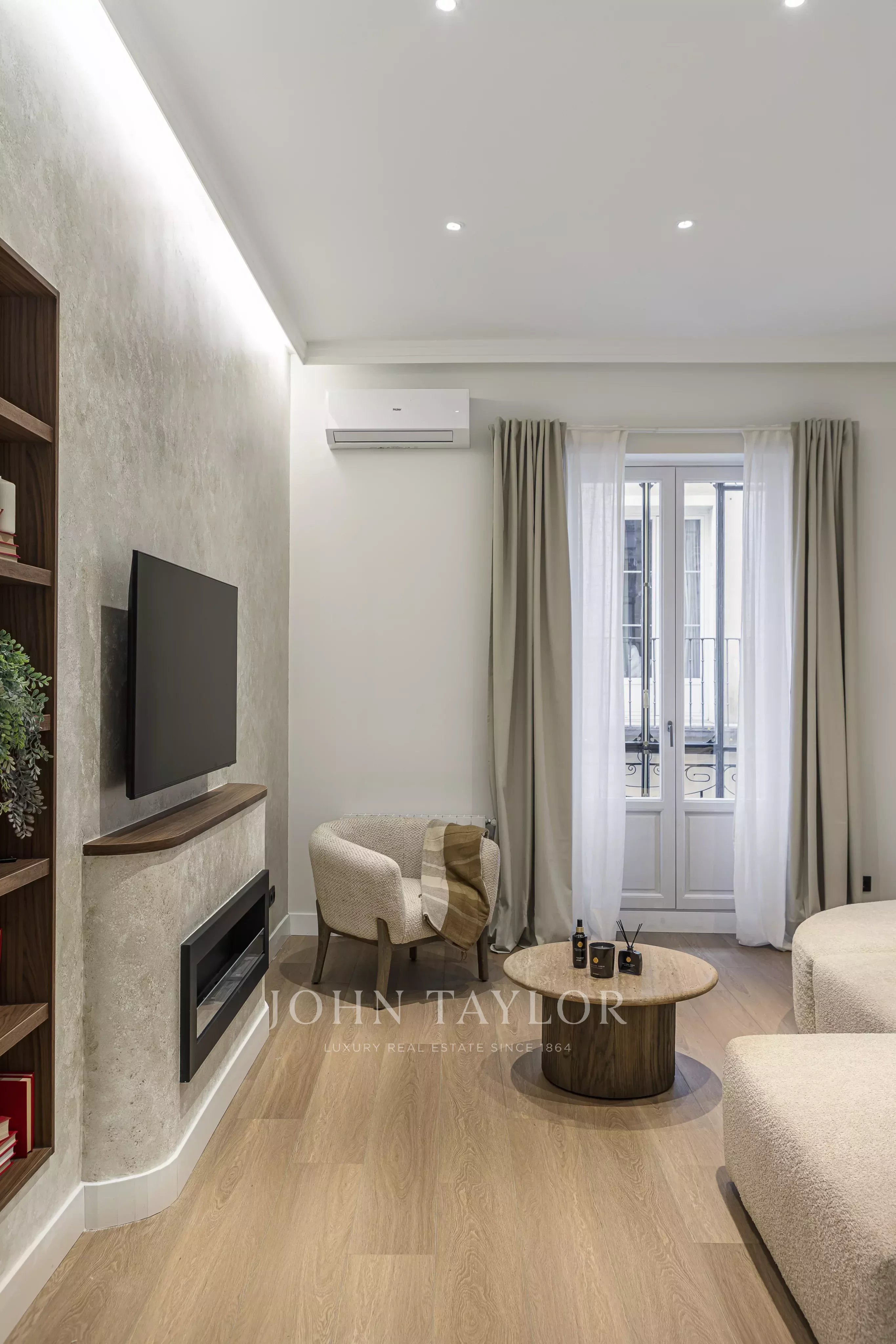Kürzlich renoviert, mit einer Ästhetik, die den herrschaftlichen Charakter seiner hohen Decken und Balkone mit modernem Komfort verbindet, besticht die Immobilie durch ihre außergewöhnliche Helligkeit nach außen und unverbauten Blick auf das pulsierende Madrid.