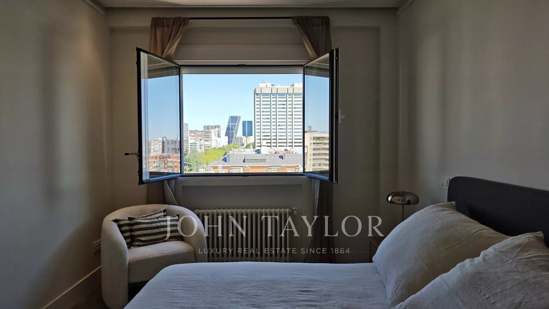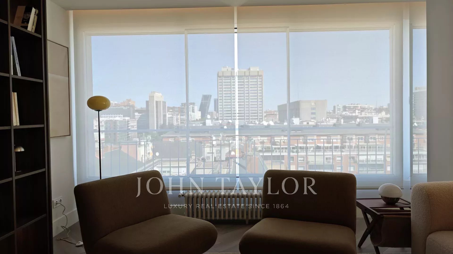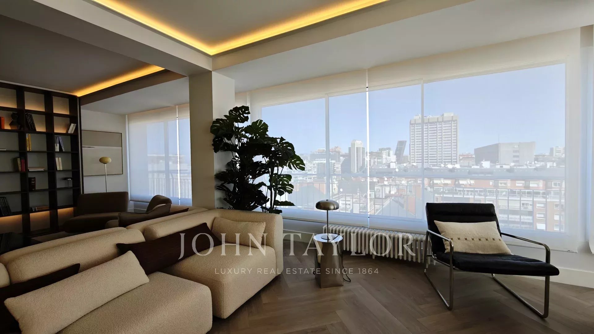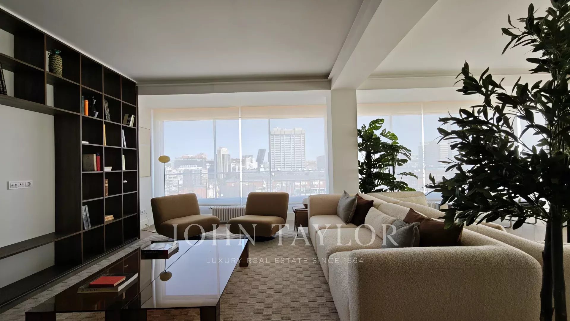 Im Herzen des Paseo de la Castellana, im fünfzehnten Stock mit Blick auf die Skyline von Madrid, befindet sich eine Wohnung, die das Konzept des urbanen Luxus neu definiert. Die 217 m² Wohnfläche sind in einem ausgewogenen Layout angelegt, das für diejenigen gedacht ist, die Design, Komfort und Technologie auf demselben Raum suchen.