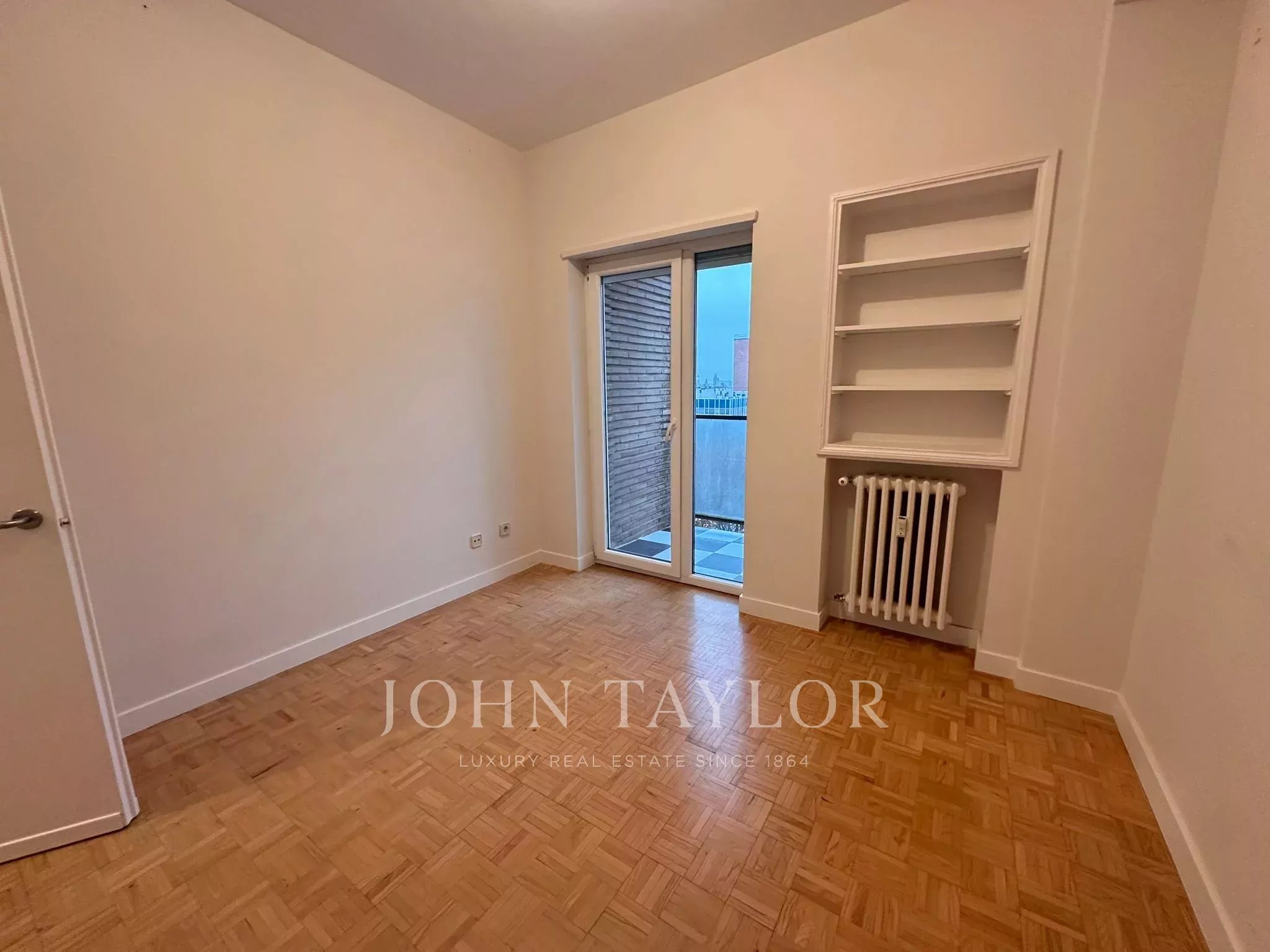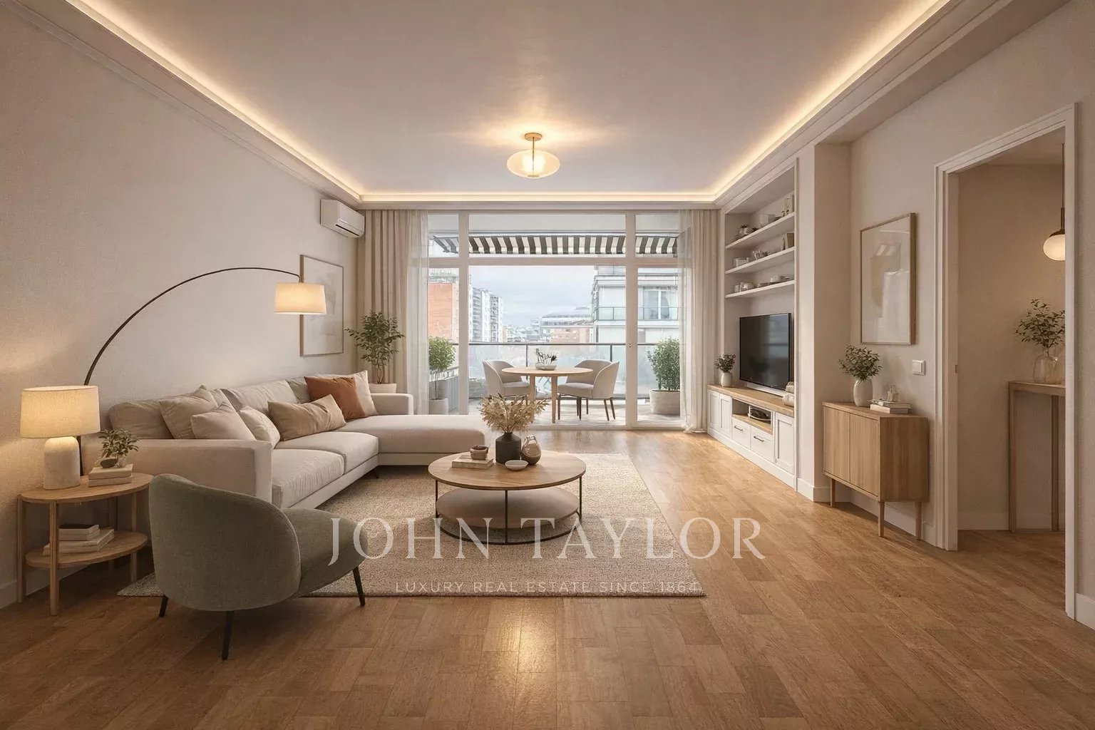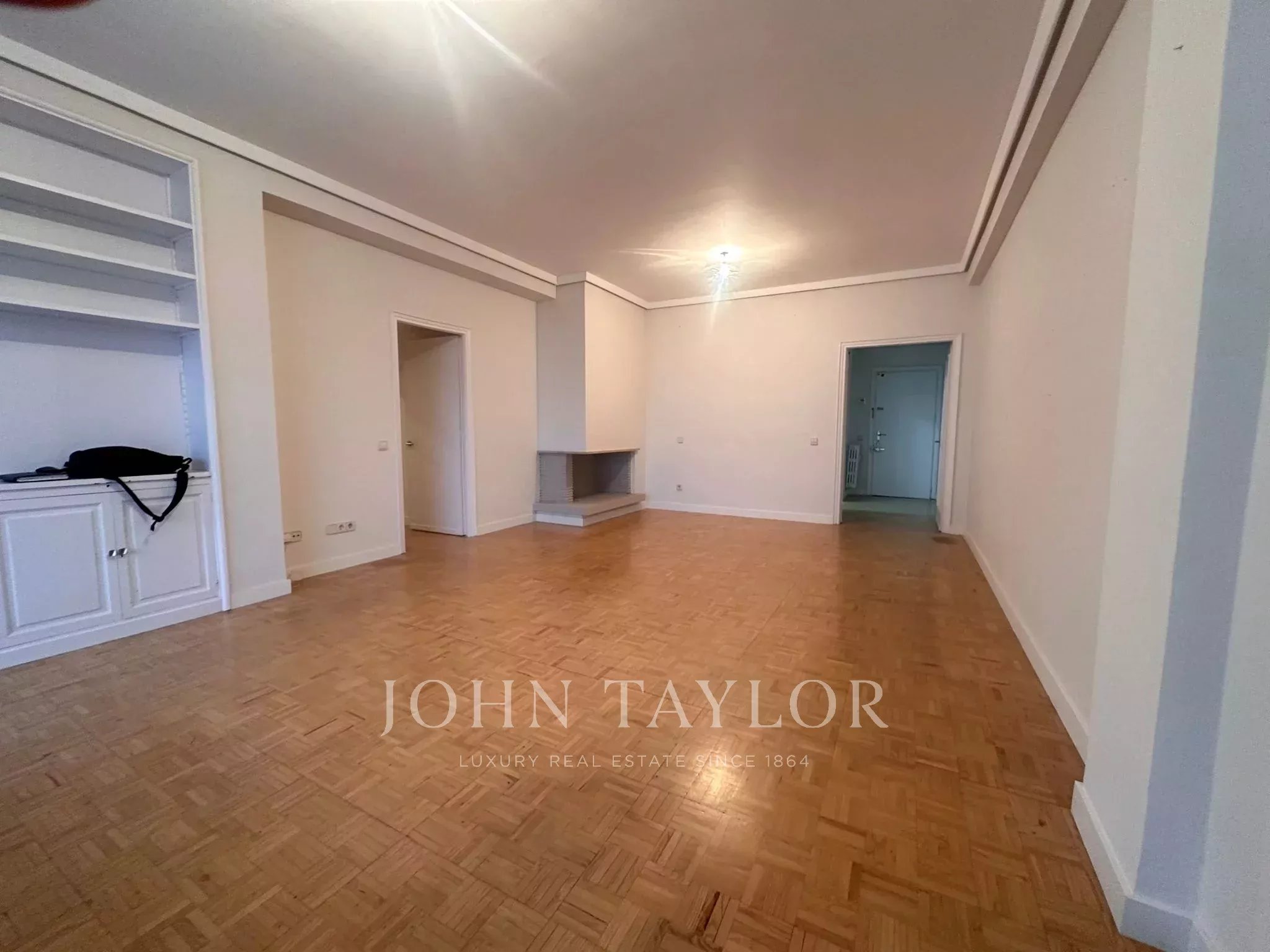 Das unabhängige und großzügige Wohnzimmer ist durch eine Glastür von der Eingangshalle getrennt und lässt natürliches Licht in die Wohnung. Der rechteckige Grundriss sorgt für eine optimale Raumausnutzung und verfügt über einen Kamin und eine Klimaanlage. Vom Wohnzimmer aus hat man Zugang zu einer Außenterrasse mit spektakulärem Blick auf den Bernabéu.